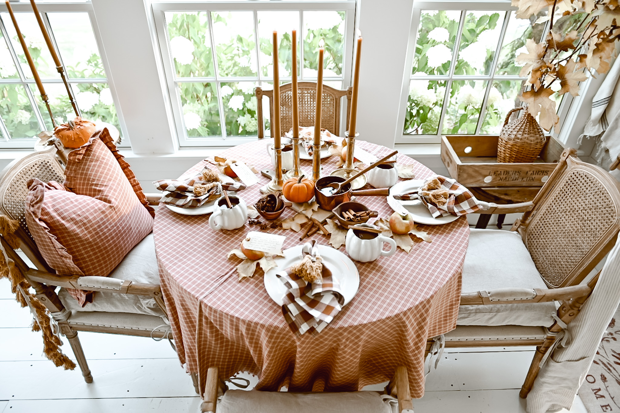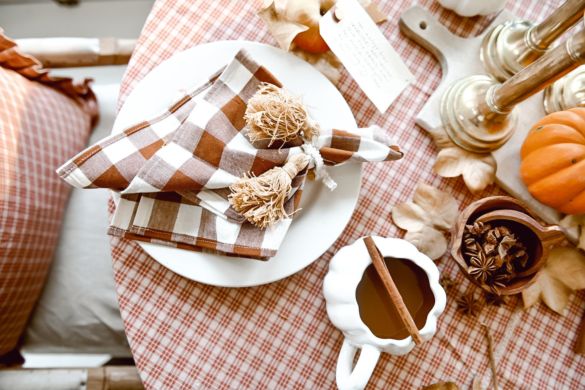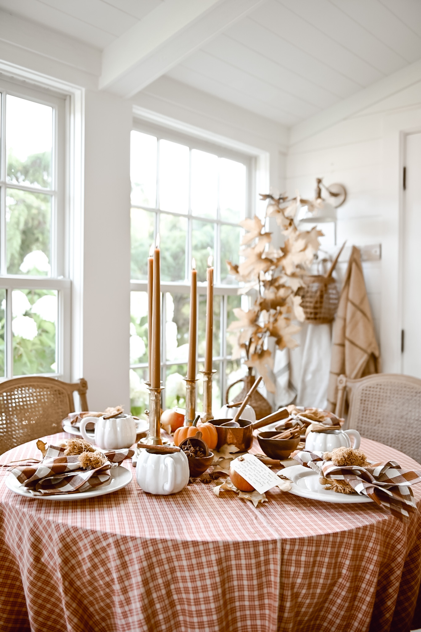 Over the weekend I styled this fun pumpkin and plaid fall table. Because this table is in our sunroom, it’s a great way to incorporate fall into our kitchen. I oftentimes style a casual tablescape featuring pieces from my collections mixed with elements of nature, however, this tablescape is a little more detailed and I am really enjoying it! I received some cozy textiles from Heather Taylor Home, a plaid tablecloth, gingham cloth napkins, and a plaid pillow.