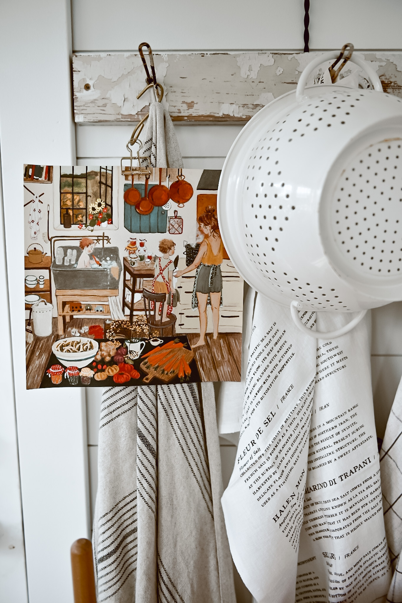 Another way to bring color into your kitchen or living space is by hanging vintage or antique-inspired art prints