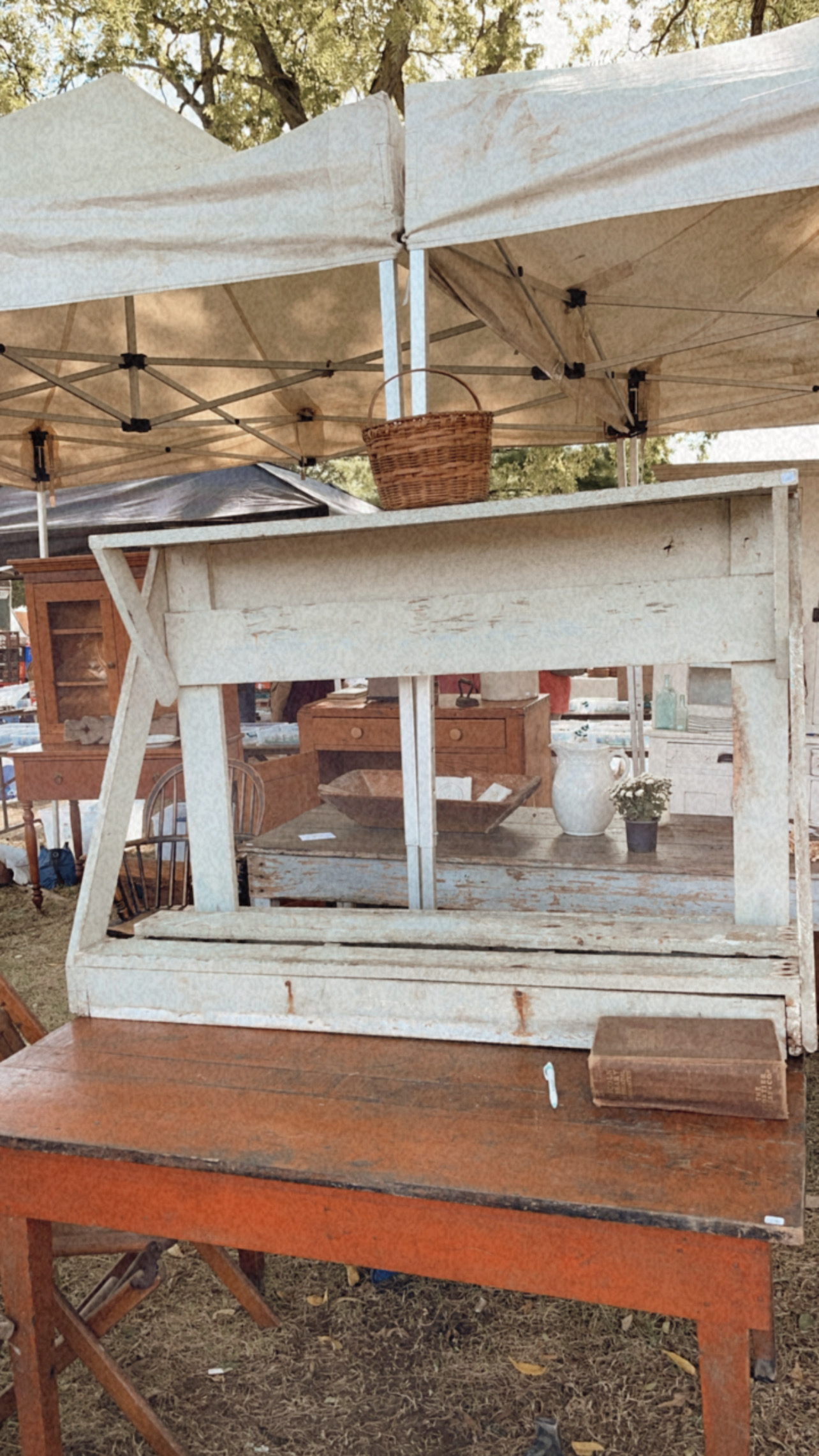 Our Farmhouse entryway design we are sharing is all around this flea market find. I believe it to be a general barn storage or utility rack. The lower level of the piece could easily house crockpots or feed bins. The top would hold smaller items like daily tools used for whatever the farm needs were. We used this Flea Market Find to create a coat rack for our front entryway. Entryway design is one of those spaces that can be a mix of design and functional or heavy design with minimal functional. I always like making my spaces as functional for my family. I decided to style this fall farmhouse antique entryway with some of my favorite pieces to style spaces with for fall. For those collectors out there, finding a large piece like this that could have been used in a stable is a great way to tie together your smaller collections. Adding some hooks & some treasures made this piece custom to our farmhouse. This is what it looked like at the market when I spotted it: