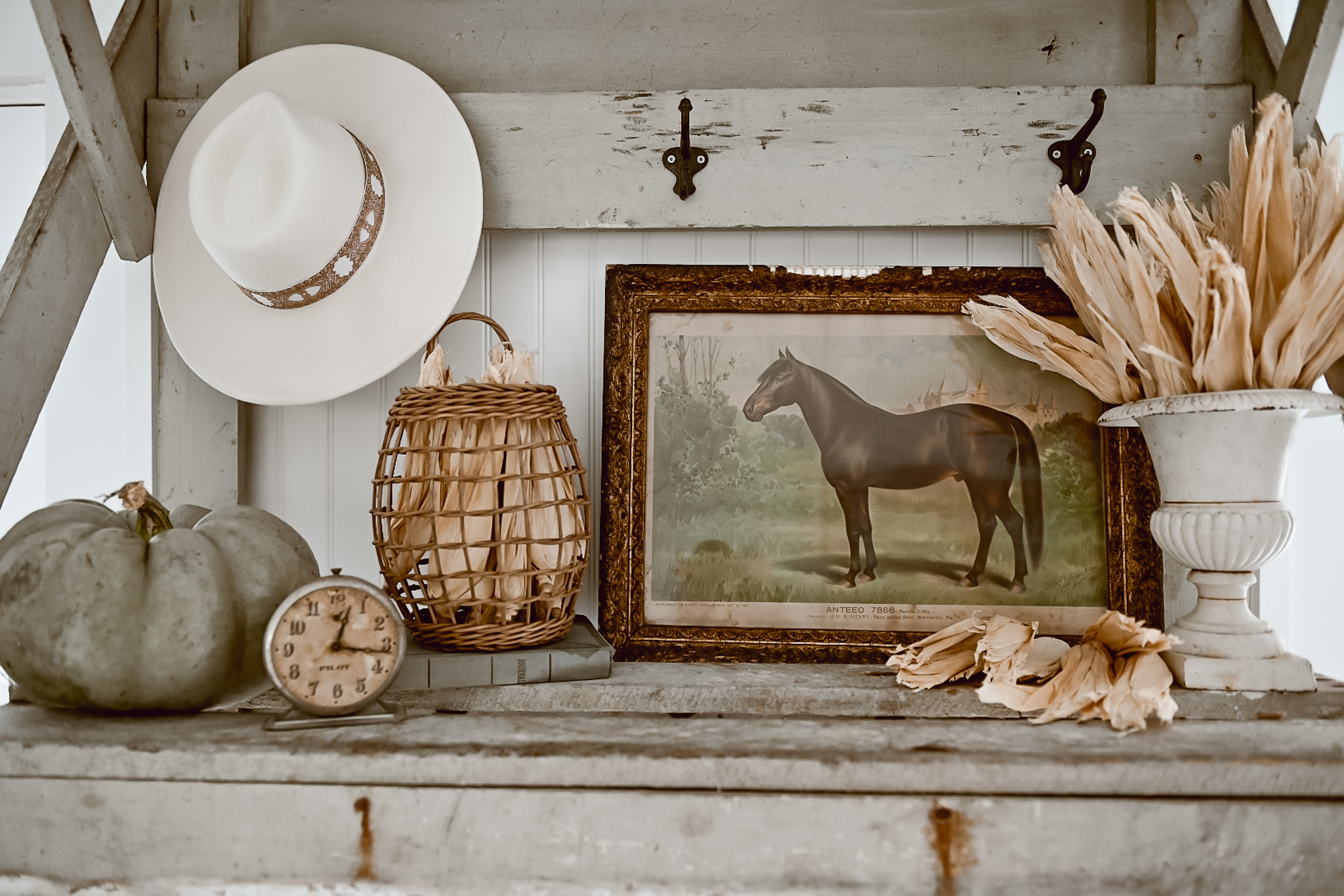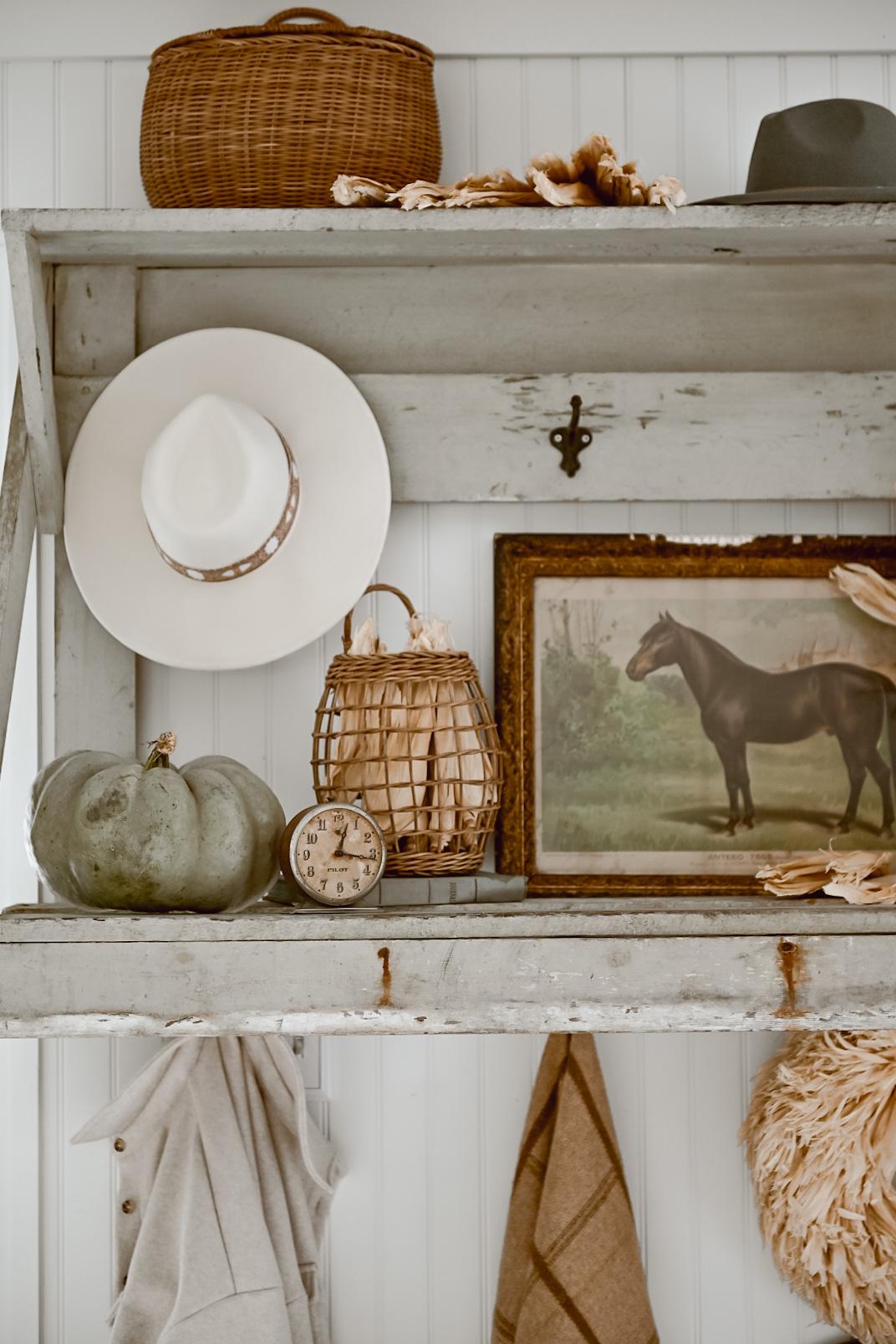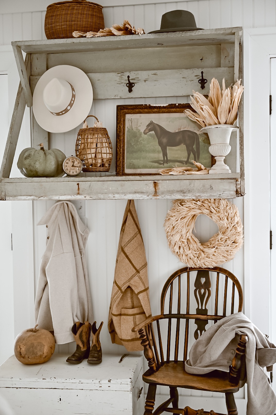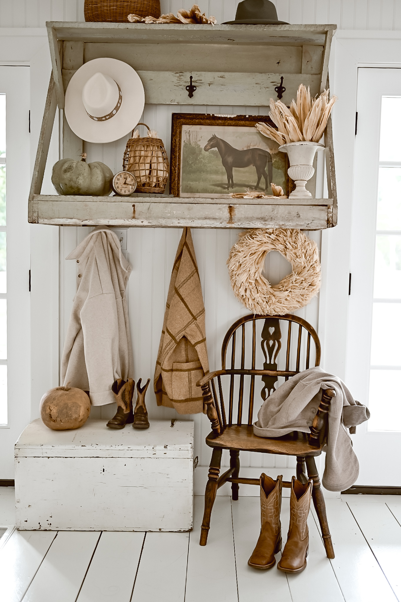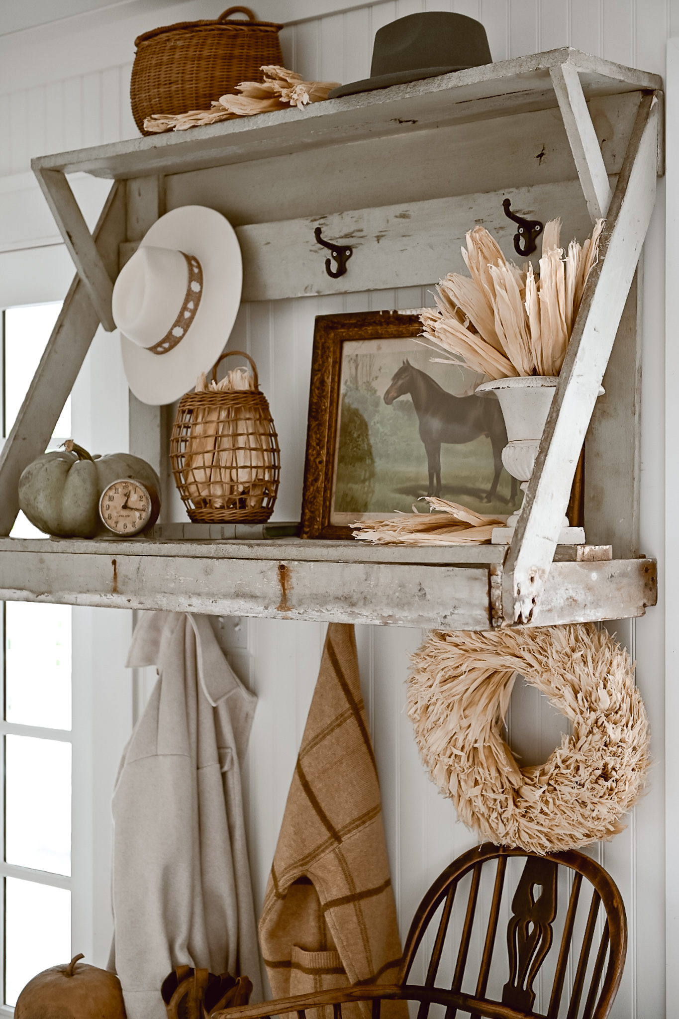 I used some pumpkins, gourds, a corn husk wreath, and corn husk bundles. To add some more seasonal textures, I also gathered some other small antique finds like a small urn, basket, and hutch. Function can be found at the piece but also in the space. I usually will always place a chair or a bench in my entryways to offer a seat for those taking boots or shoes on and off. Having a hutch or small table is also nice for catch-alls and loose items. Since this is off a seating area with a fireplace, the trunk serves as a functional element with blankets nested inside.