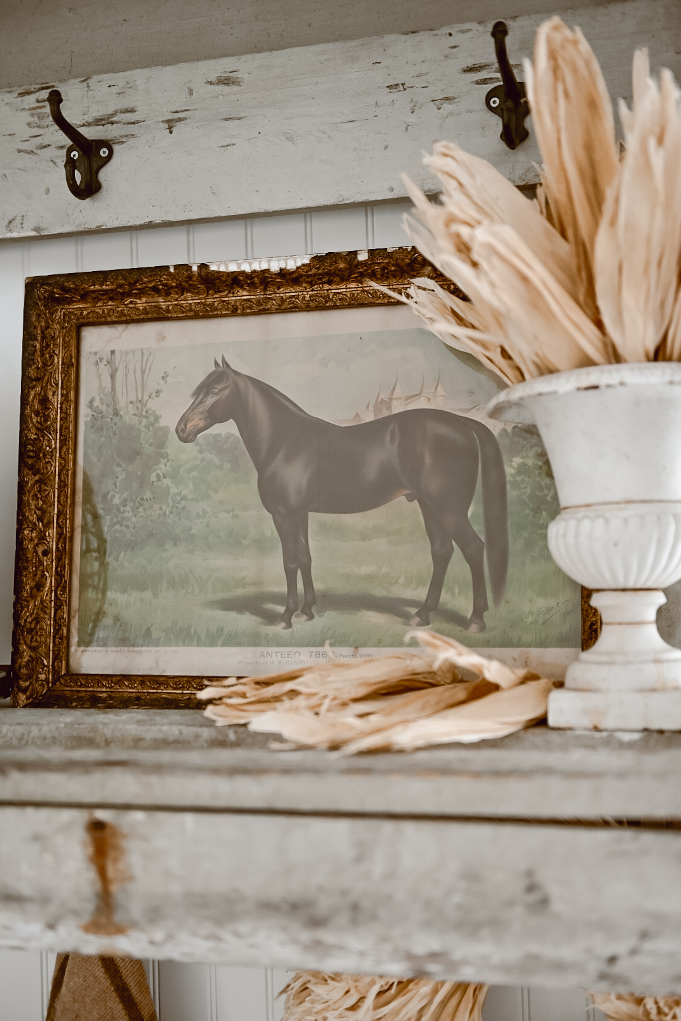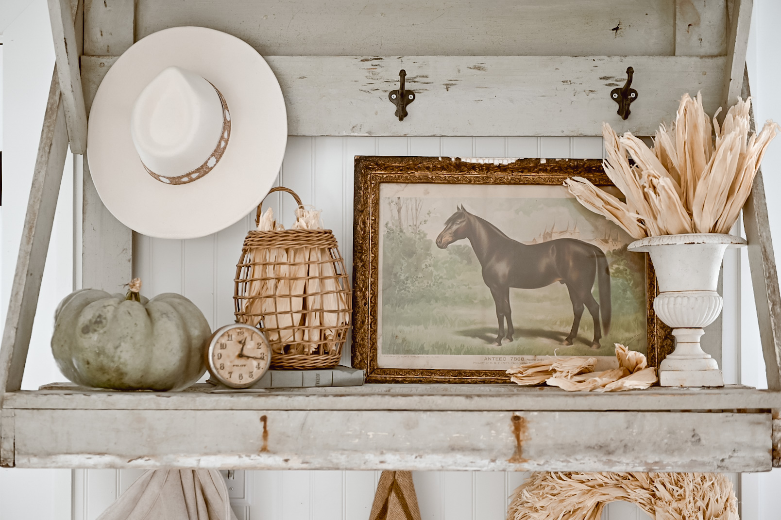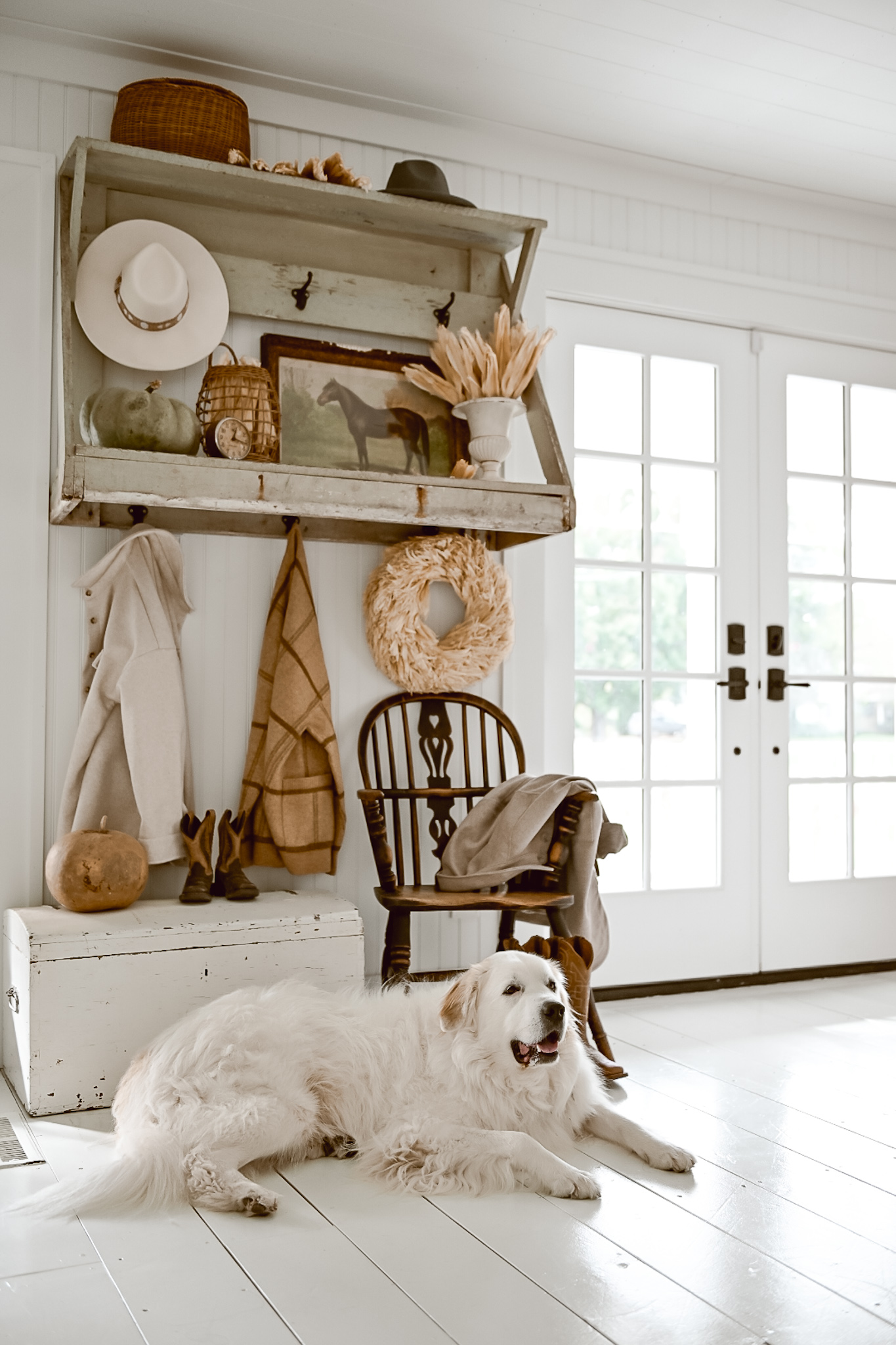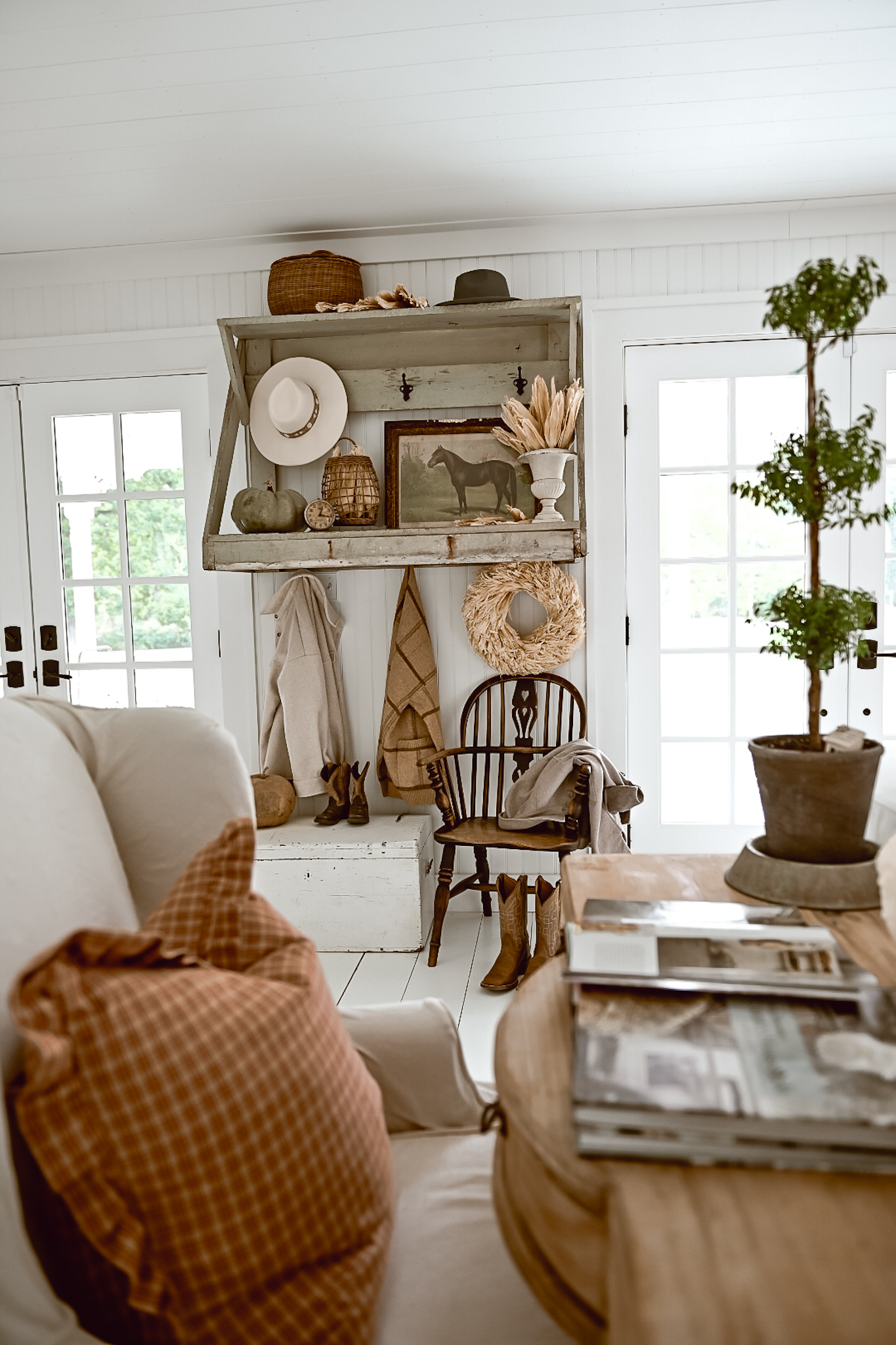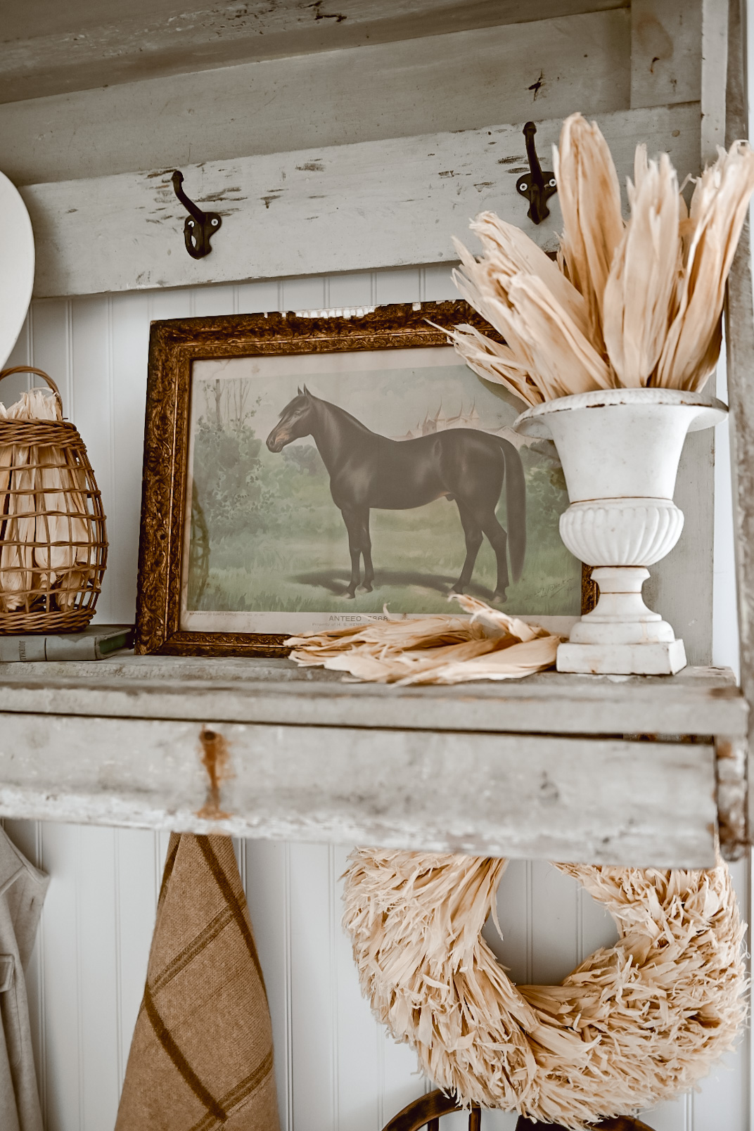 I used some pumpkins, gourds, a corn husk wreath, and corn husk bundles. To add some more seasonal textures, I also gathered some other small antique finds like a small urn, basket, and hutch. Function can be found at the piece but also in the space. I usually will always place a chair or a bench in my entryways to offer a seat for those taking boots or shoes on and off. Having a hutch or small table is also nice for catch-alls and loose items. Since this is off a seating area with a fireplace, the trunk serves as a functional element with blankets nested inside.