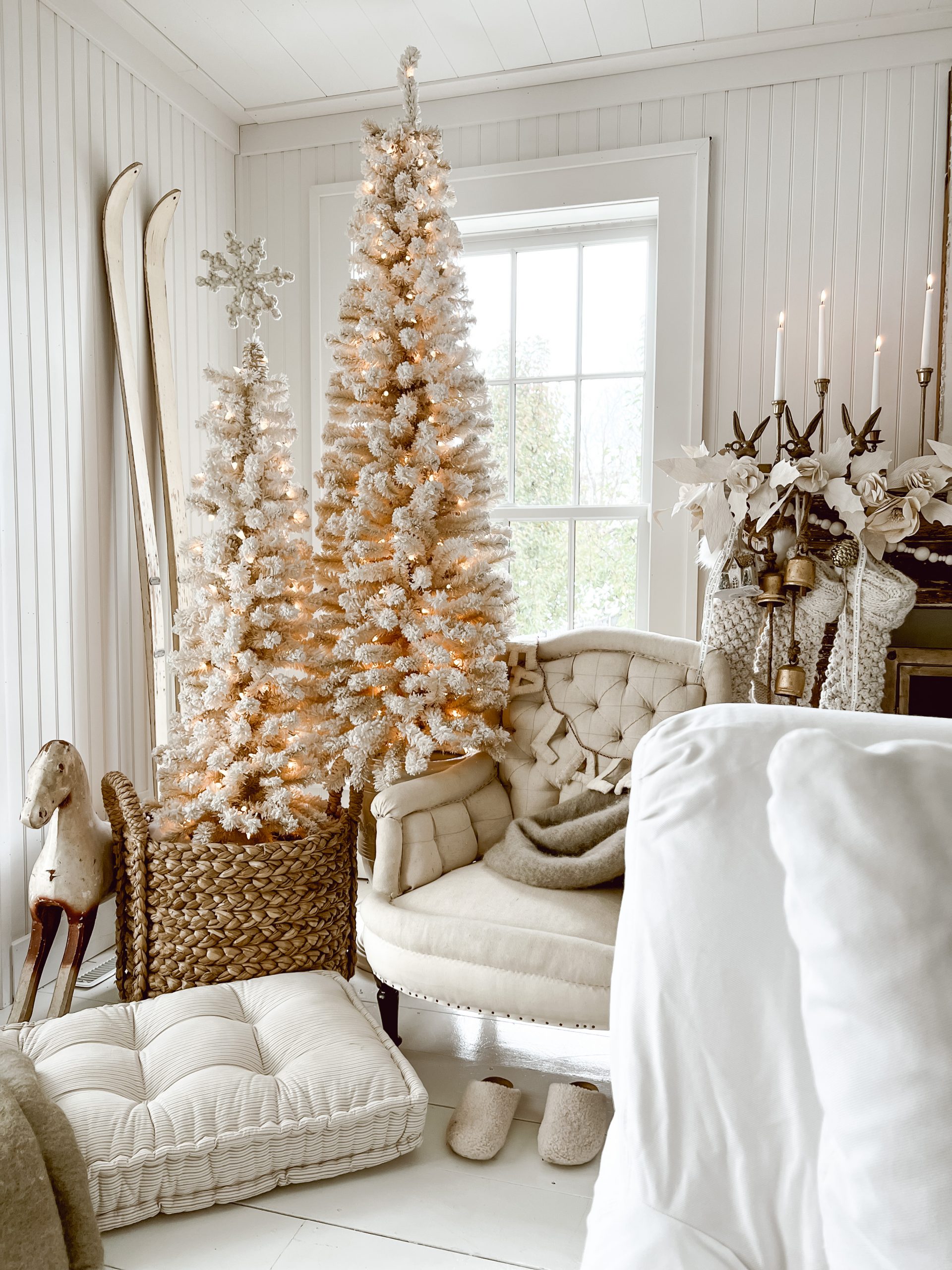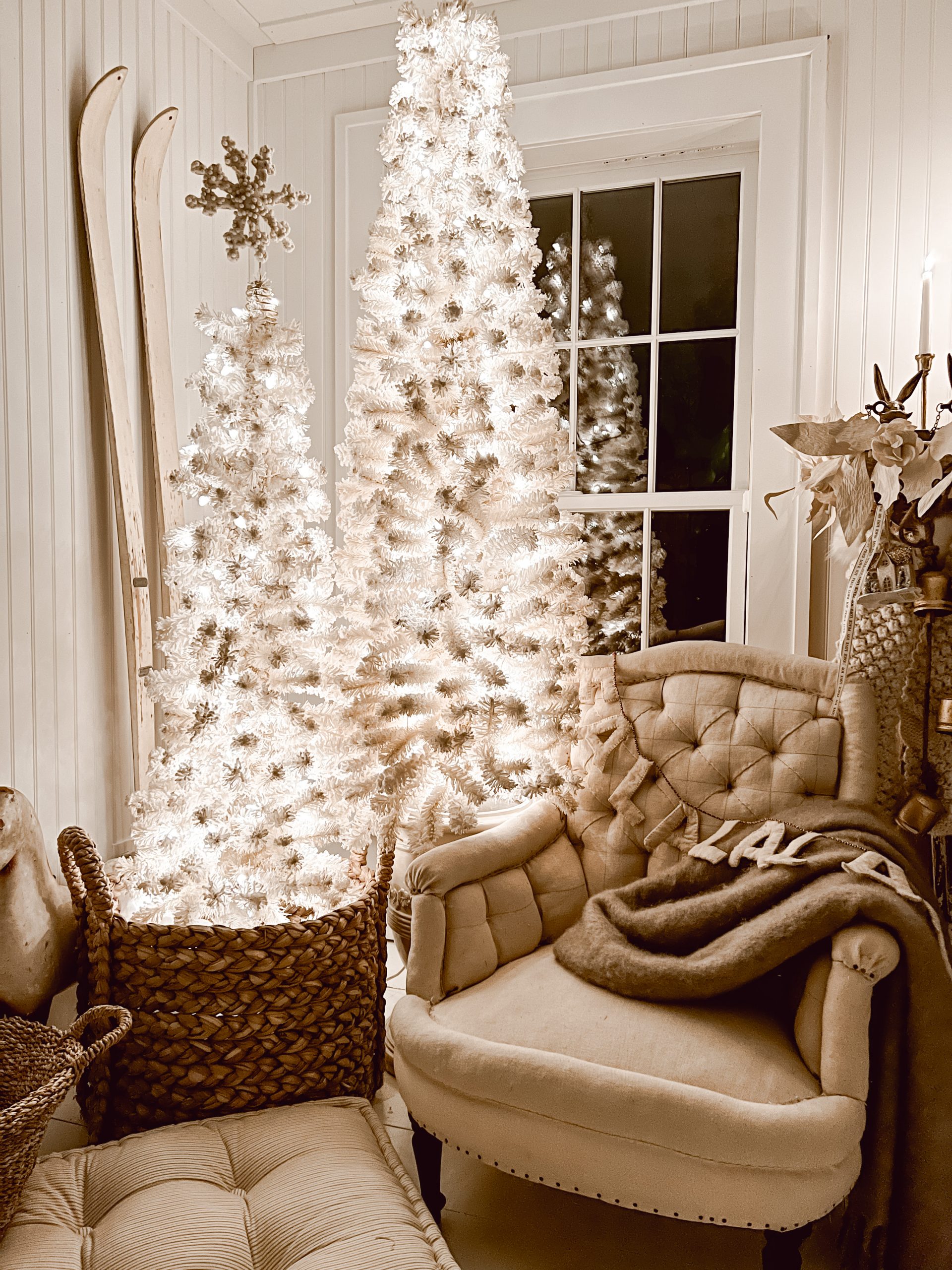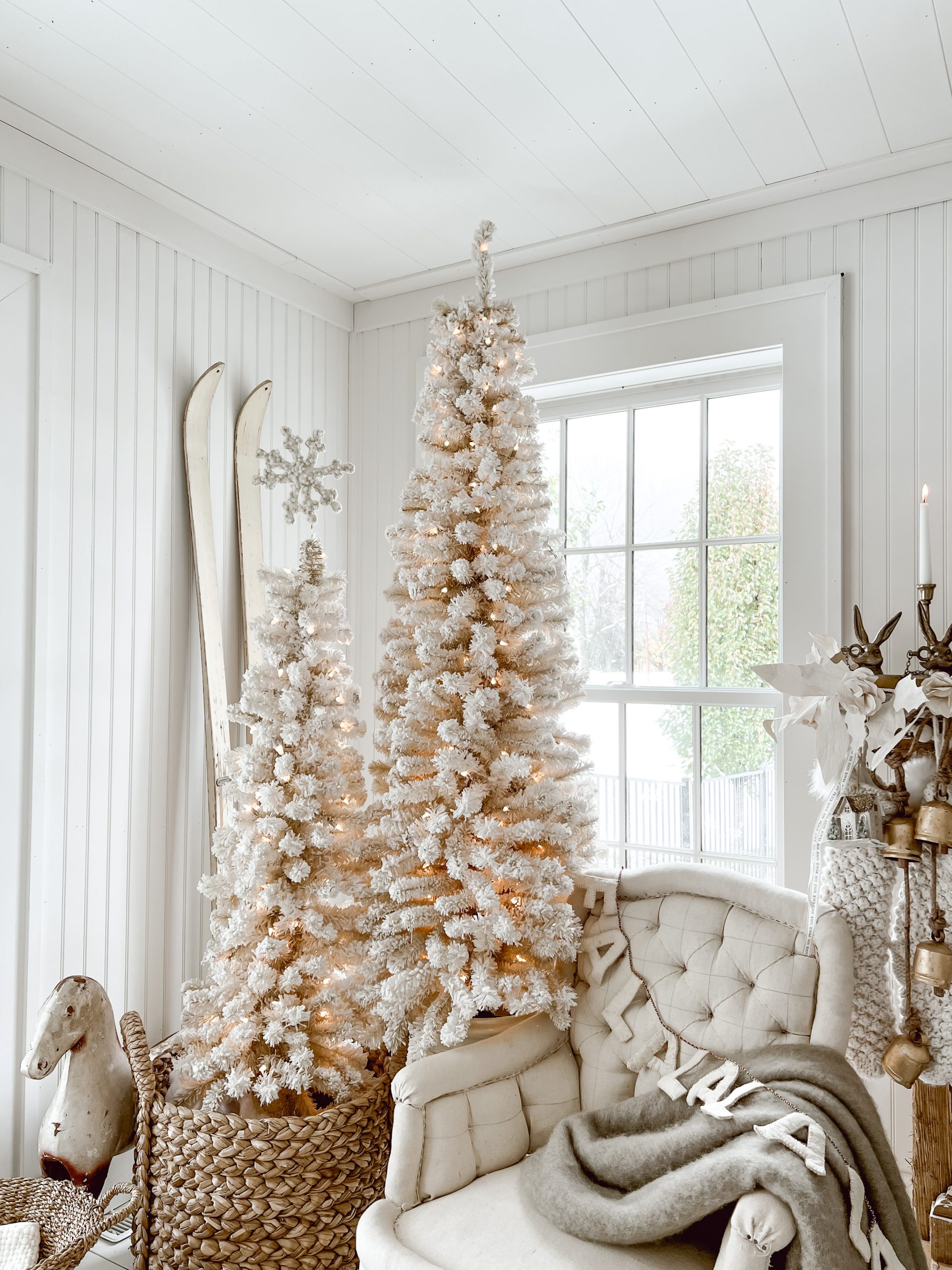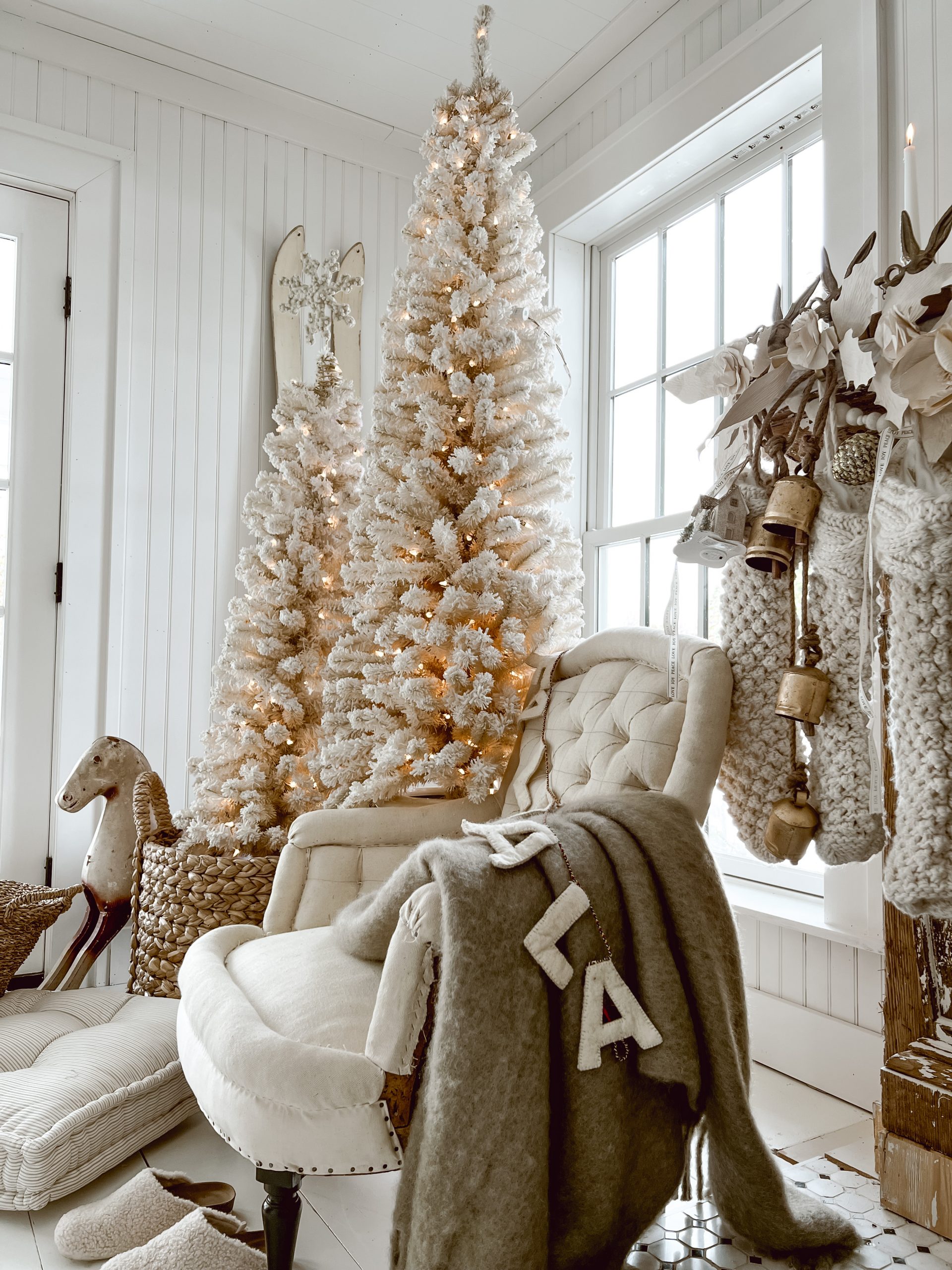 The White Christmas Tree’s I picked up from one of our antique vendors at The Found Cottage, The Cotton Shed. I have had them for a few years now and are just so in love with them both. When I style these, based on their size, I like keeping them staggered and paired to help create a larger footprint for the space. A tip, when shopping for vintage or new, if you can find a pair of trees individually thinner or smaller, look for different sizes and pair them together in a space. It is a great focal point, and can make seemingly smaller tree’s demand more of your eye.