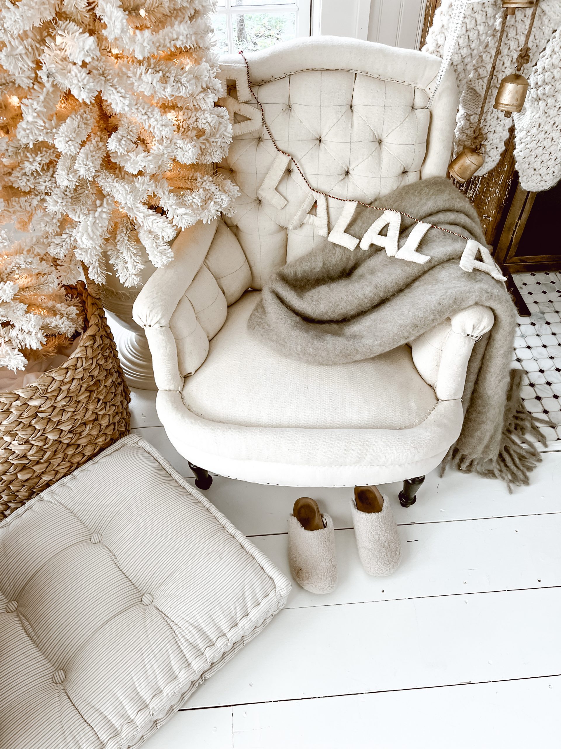 The vintage French chair. This chair I actually purchased from an English antique dealer, and have two of them. The quality in the design, as it sits, is so amazing, these are definitely some forever pieces for me. I love how the tufted texture adds so much cozy to this corner & just invites you to come take a seat by the tree! You can look for tufted chairs at any retail location to get a similar look or you could be like me & check out your local antique shops!