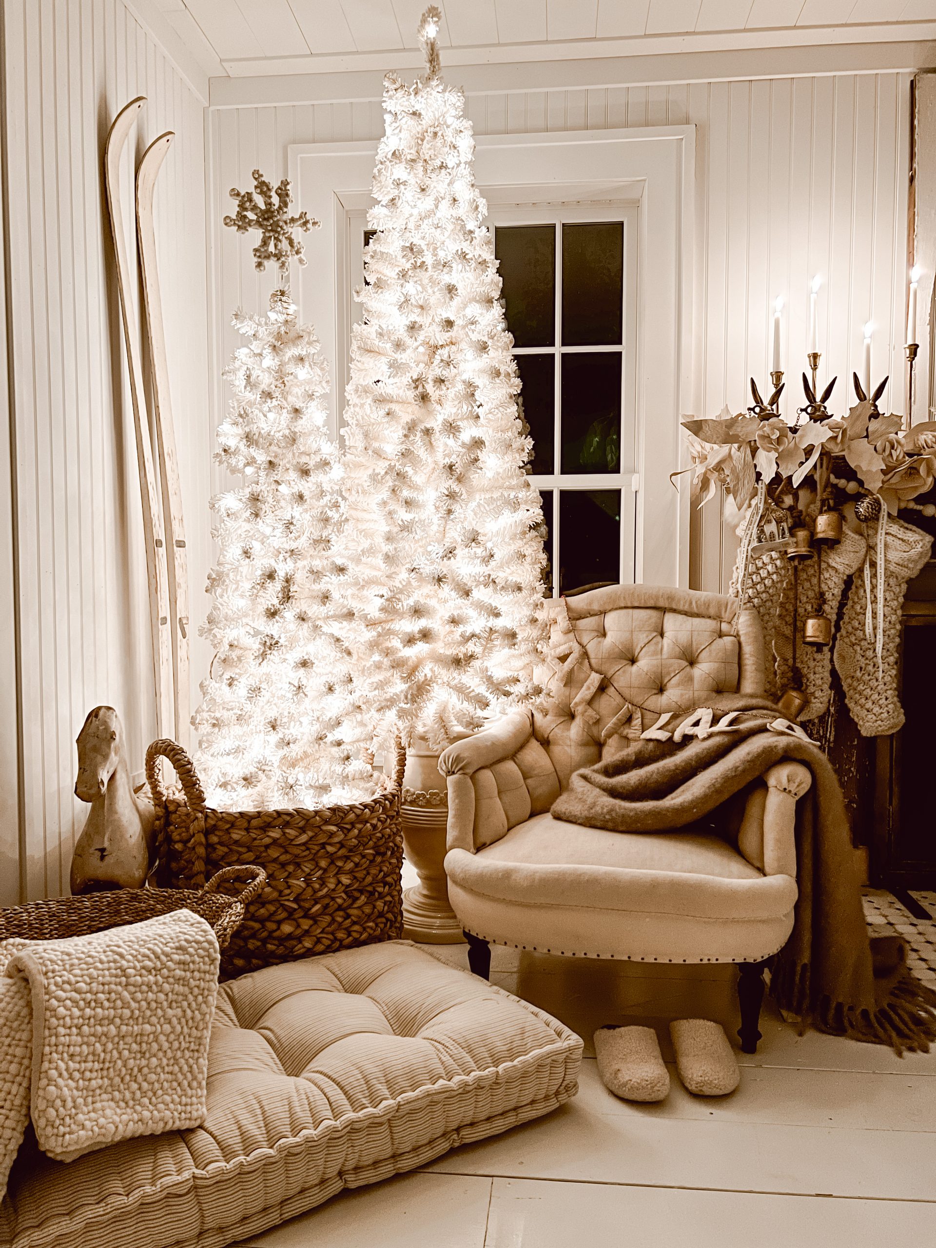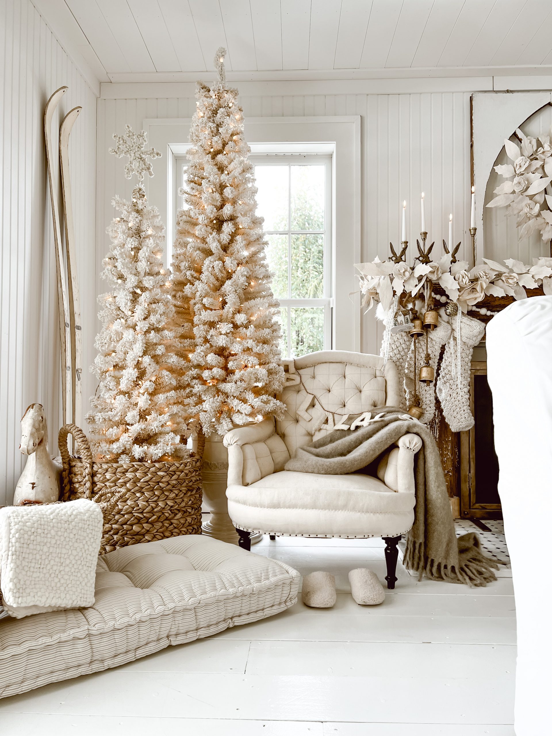 I scattered some older Christmas items I already owned like those ski’s, golden bells, and paper garland to tie it all together. I think this space turned out so very cozy and inviting, and I am so happy with it and share it with you. A monochromatic look to a space like this all white Christmas space is perfect to display your fine collections you may have in your home. An all white Christmas look, like this one is a great addition to nearly any little space in your home from the main Christmas gathering to an accent space. I hope you truly enjoyed this one of many Christmas looks I have planned to inspire you with this year. As always I am so very grateful for you stopping by the blog today and every other day, it truly means the world to us here on the blog.