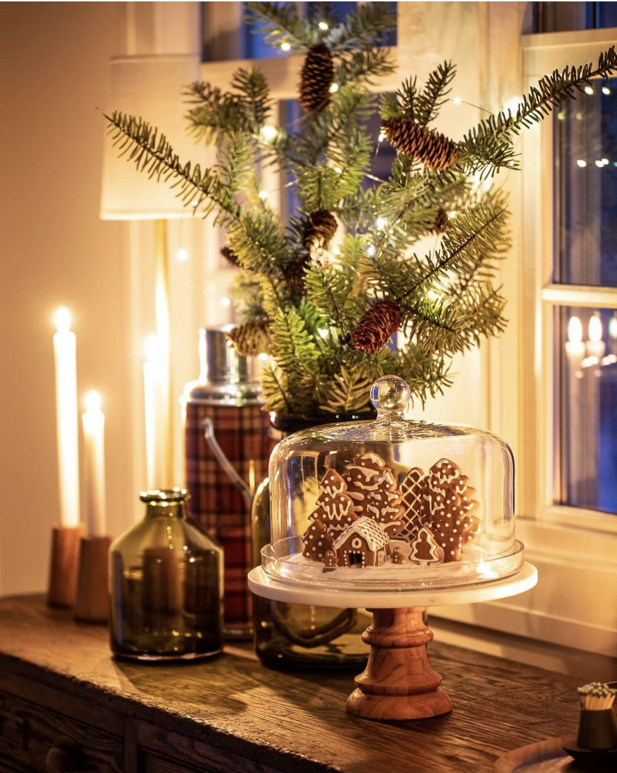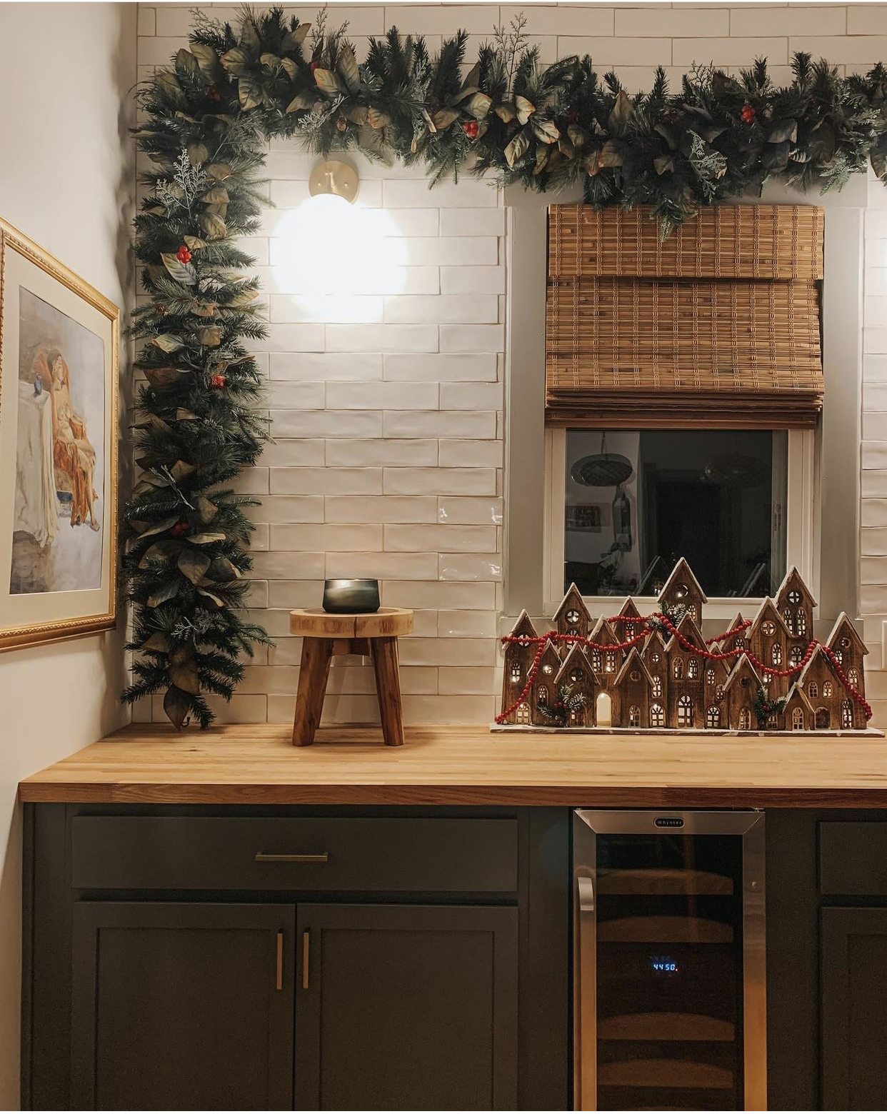 This cozy Christmas corner by @sixvintagerugs features a fun gingerbread decor item along with some amazing garland and berries. I love the pops of re mixed with the dark green in the cabinets and greenery.