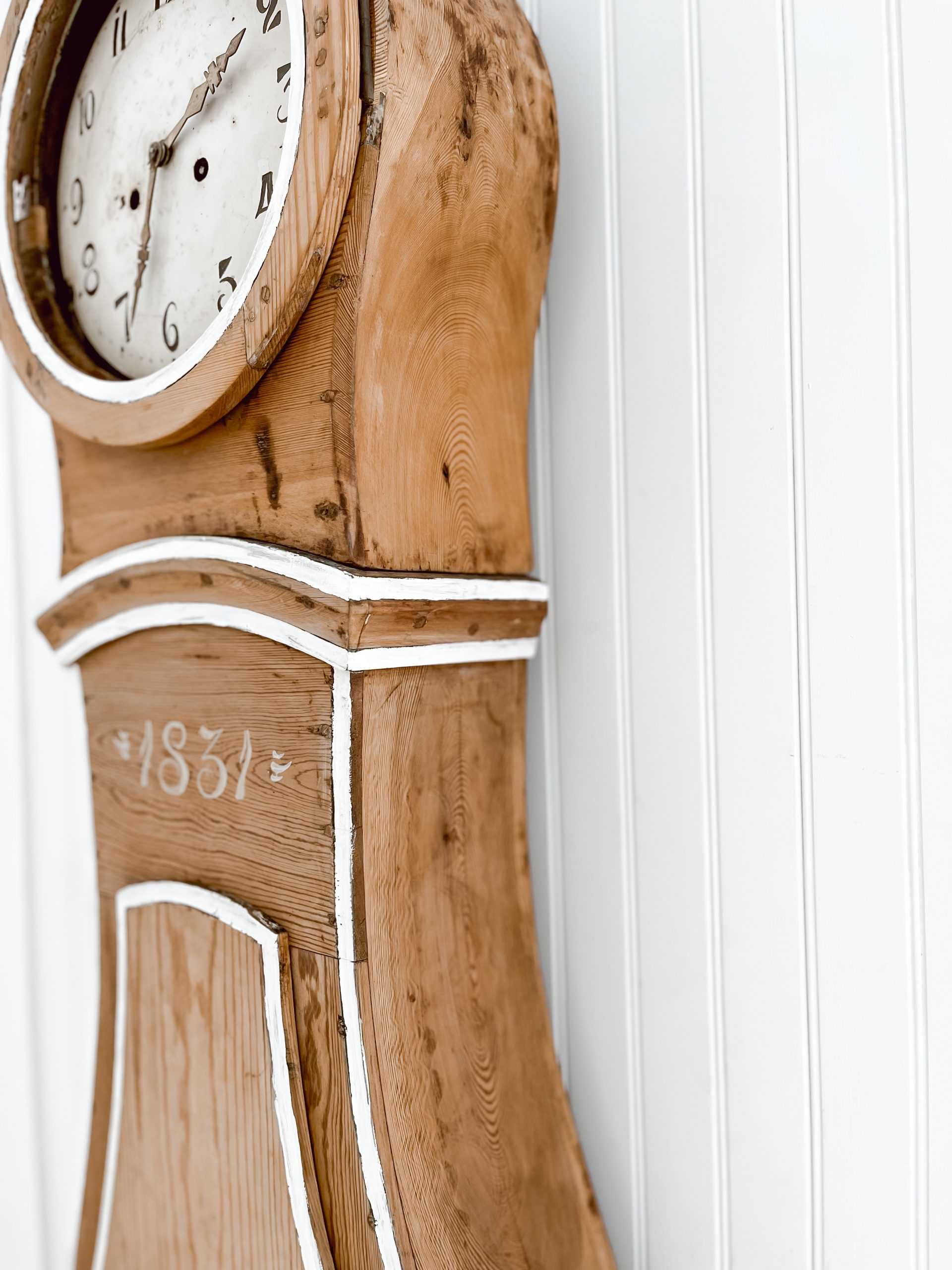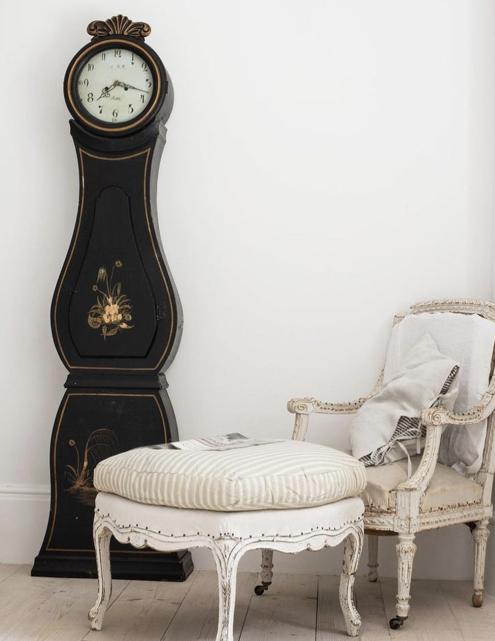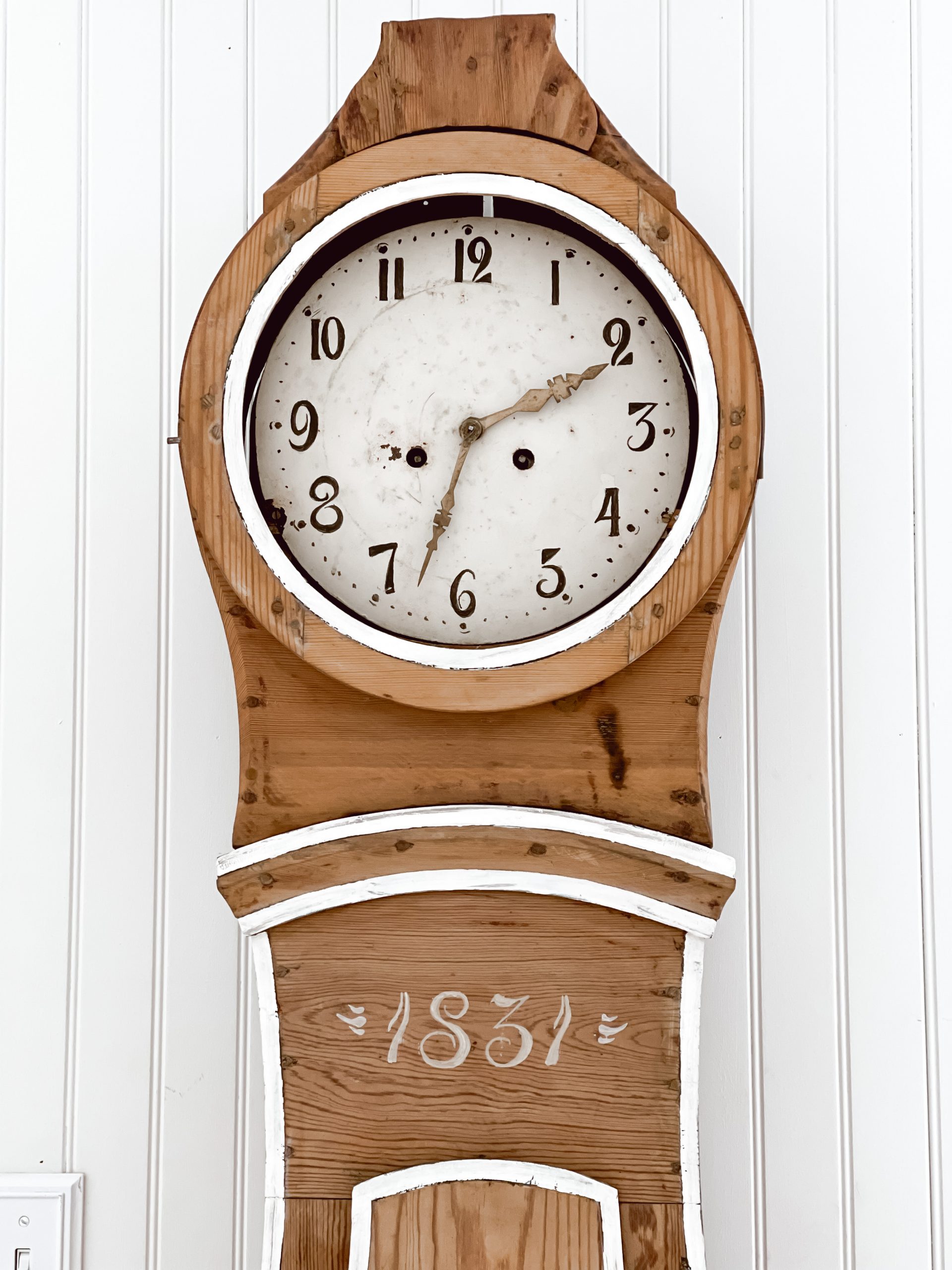 These beauties are a beautiful statement in every space and a guaranteed conversation starter. They are intended to be decorative, however Jose did get one to work for a little while, so some of them do have the antique functioning hardware behind the clock face. So if you are handy and understand pendulum clocks, these may be able to come back to live, but we are selling them solely as decorative beautiful ladies, I have a few White & Faded Mora clocks of my own collection at the farm and can tell you whole heartedly that I love them and I am completely happy with each of them. Each clock is unique and comes with different parts. Another option is you can make the clock battery powered with a kit & it will keep time for you and also chime for you too! If you would like to read about my personal collection of mora clocks, click here [HERE] and here [HERE].