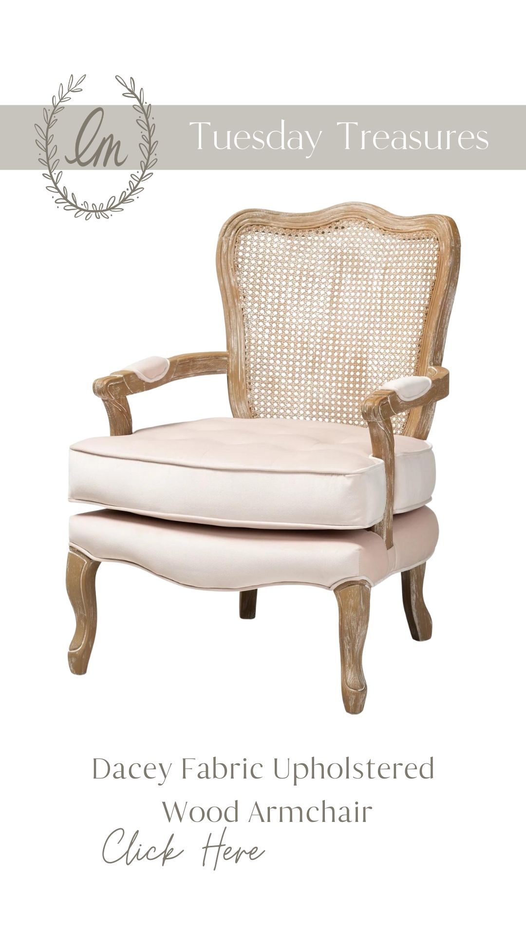I love this cane-back upholstered chair and I even have something similar in our home! These chairs are truly functional in several different rooms, from a dining room into an office. Shop this chair above by clicking the image below: