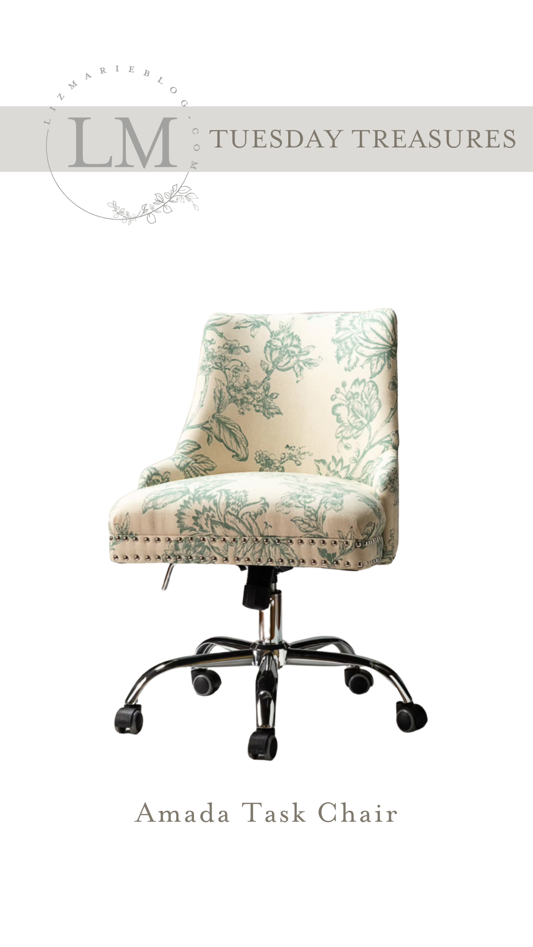 This desk chair has the perfect antique fabric upholstered. Having a cozy workspace makes all the difference and sitting in a pretty chair may make all of your tasks a little more doable. Shop this task chair by clicking the image below: