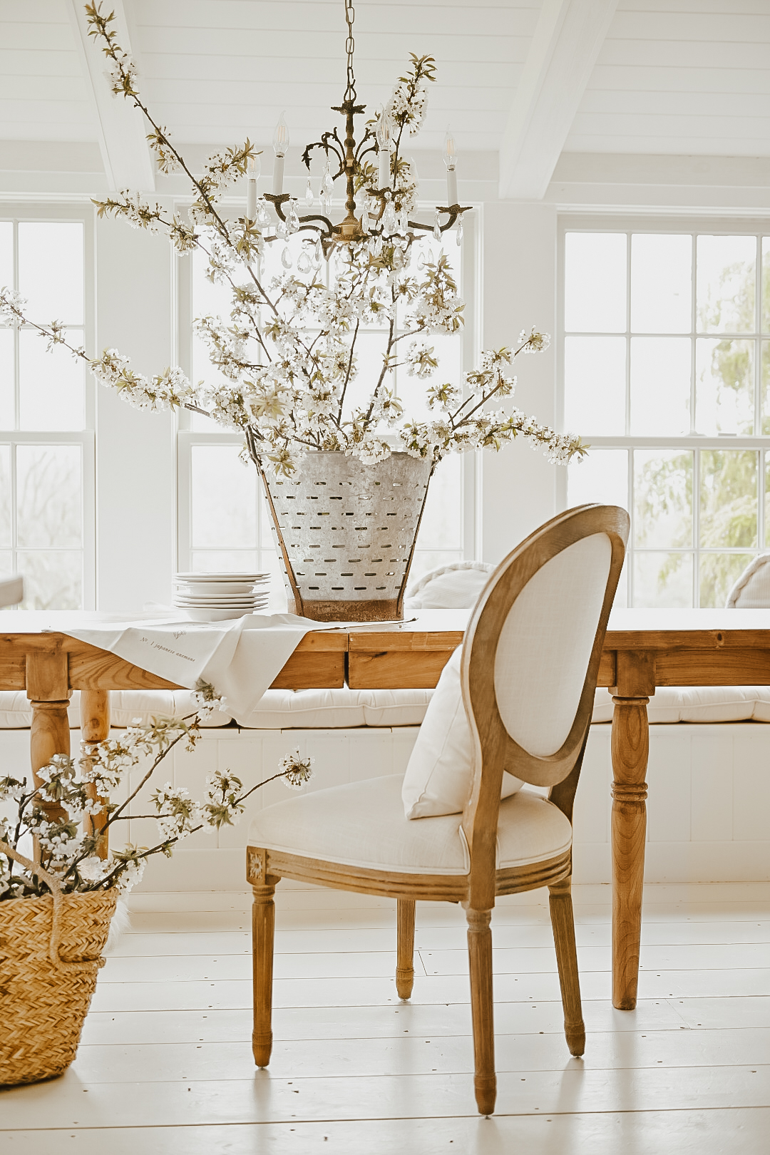 In my new design book, Cozy White Cottage Seasons, I share this cozy tip that I also wanted offer here on the blog. If you are like me, the struggle comes along when we try to style the vessel. Some vases are too large to properly hold up stems, and some are not the right shape for styling. My trick to making stems and plants work in any vase is to put another vessel inside of it. The smaller vessel inside the vase can hold the water, prop up the stems, and prevent any damage.