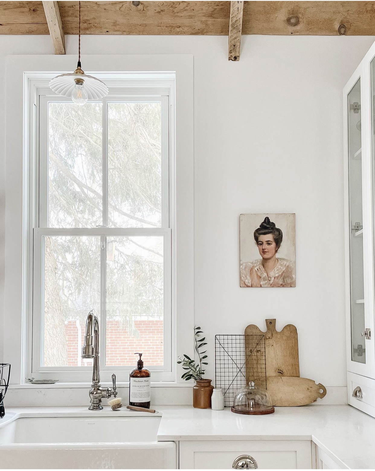 There are many things that I enjoy about this photo by @the_village_farmhouse. The Antique painting, the small gathering of kitchen items, and of course, that petticoat shade above the sink. This also is a great photo to refer back to if you are thinking about using silver hardware against white cabinets!