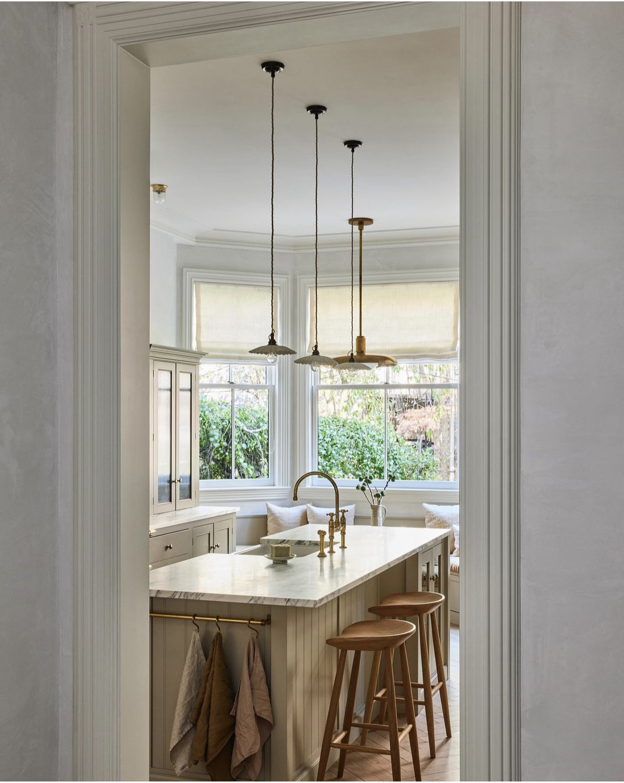 I love that @and.studio.interiors decided to place 3 lampshades above this kitchen island. The peek into this kitchen space is so cozy.