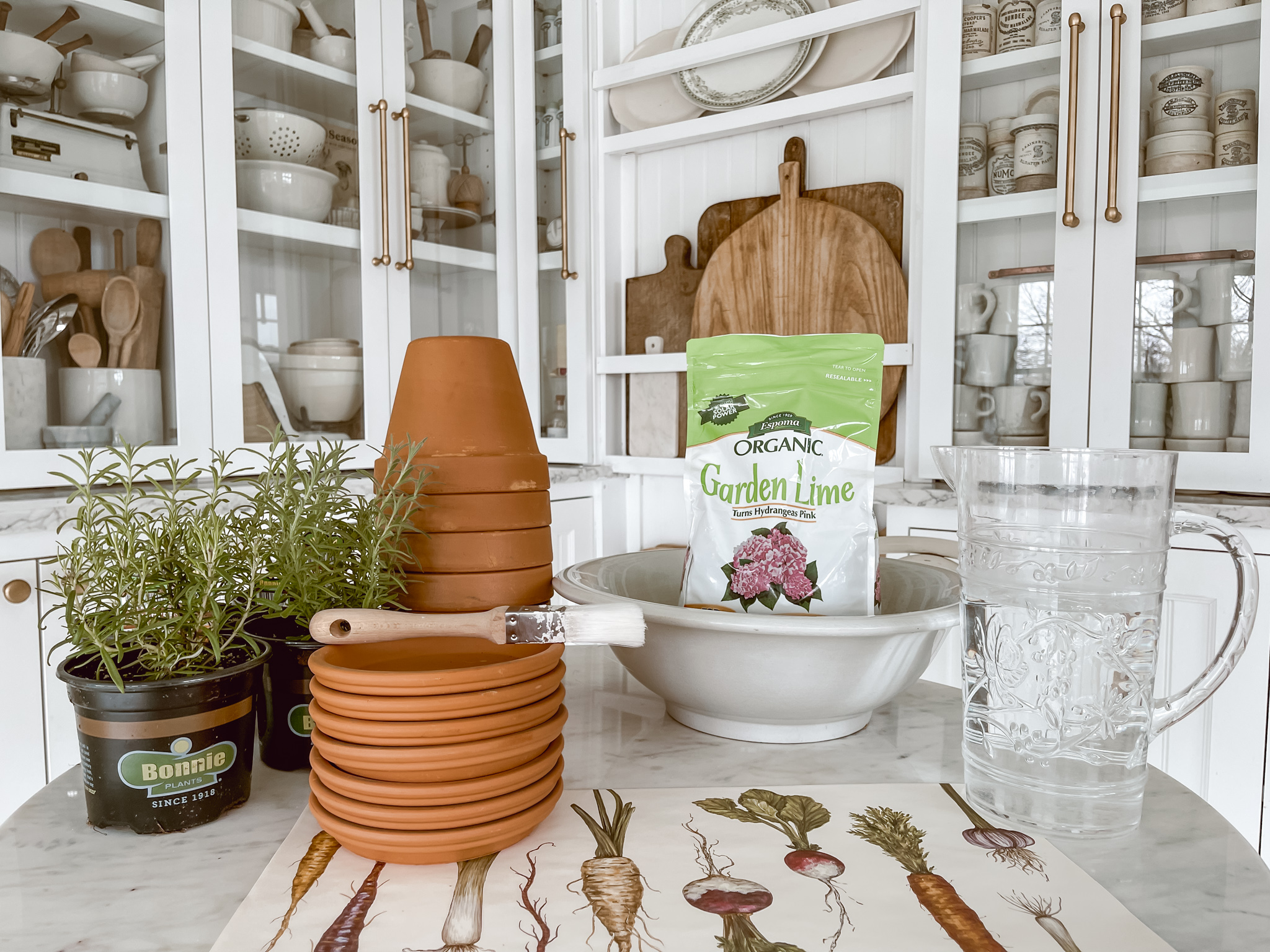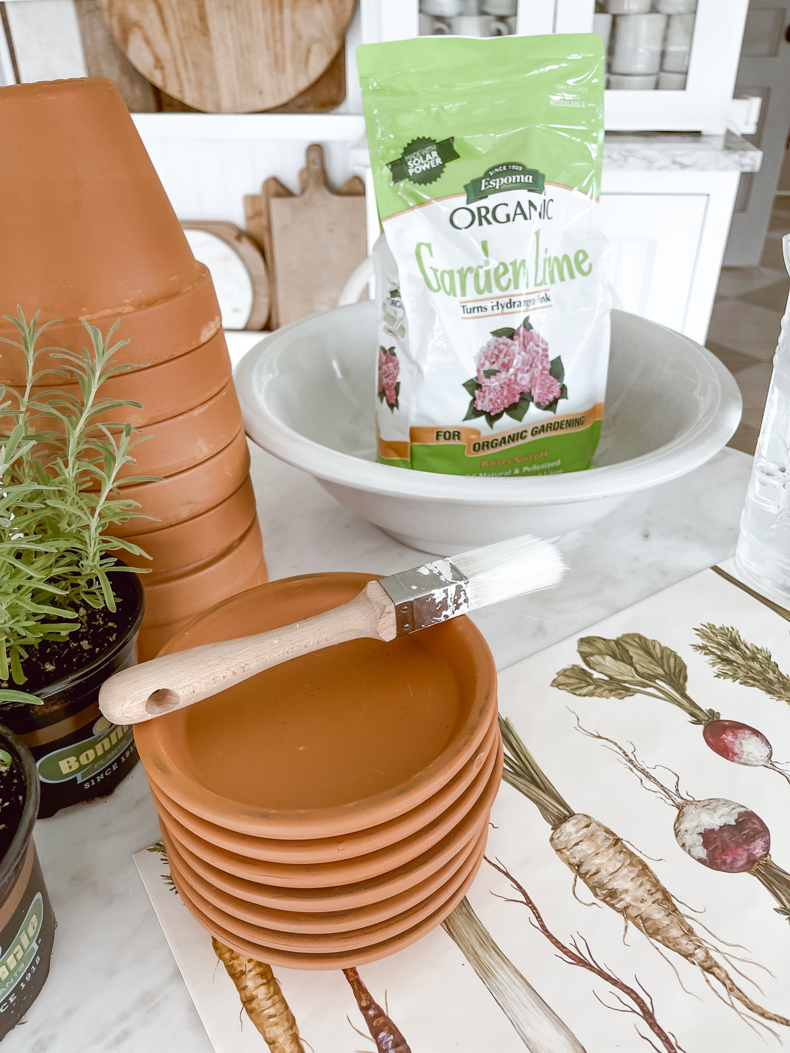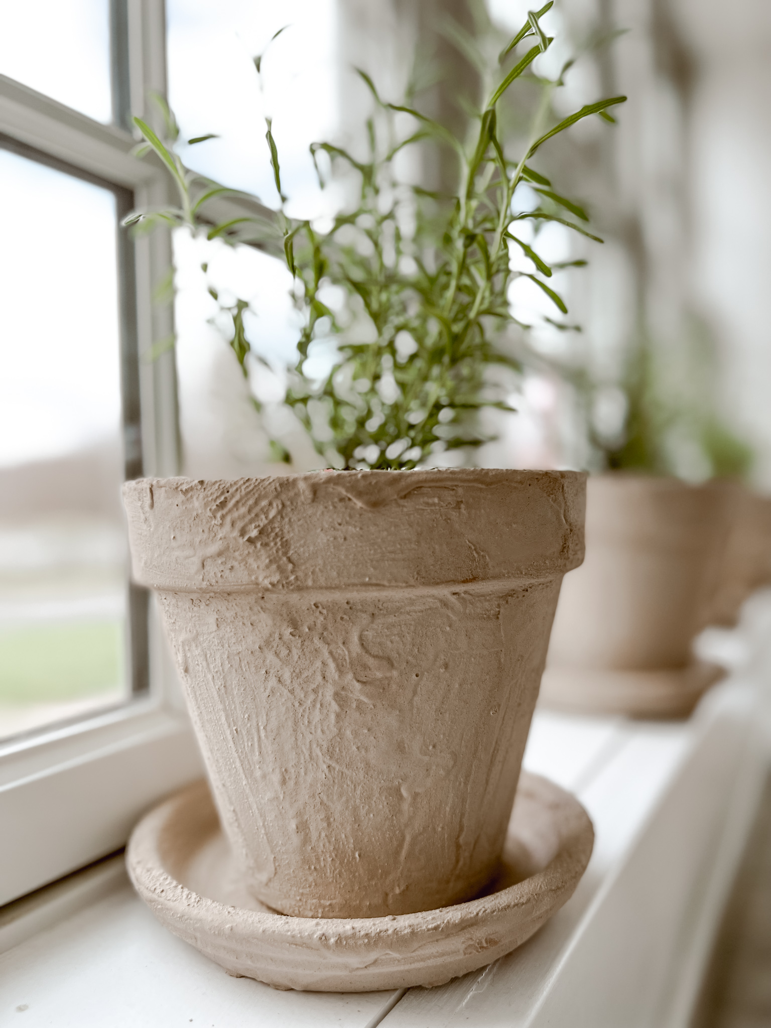 These DIY pots will probably end up outside, but for now they are starting my spring inside garden, filled with Rosemary and Lavender. I have house plants all year long, and love a few extra around spring that eventually make their way out to the greenhouse or in a planter somewhere around the house. There is something fun and special caring for something like a little plant that, even inside, can connect you with Mother Nature. I love this DIY aged Terracotta for many reasons, one of how easy & affordable it is to do, two connecting with Mother Nature, and three is welcomes spring into your life.