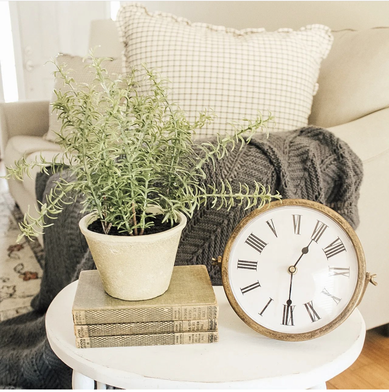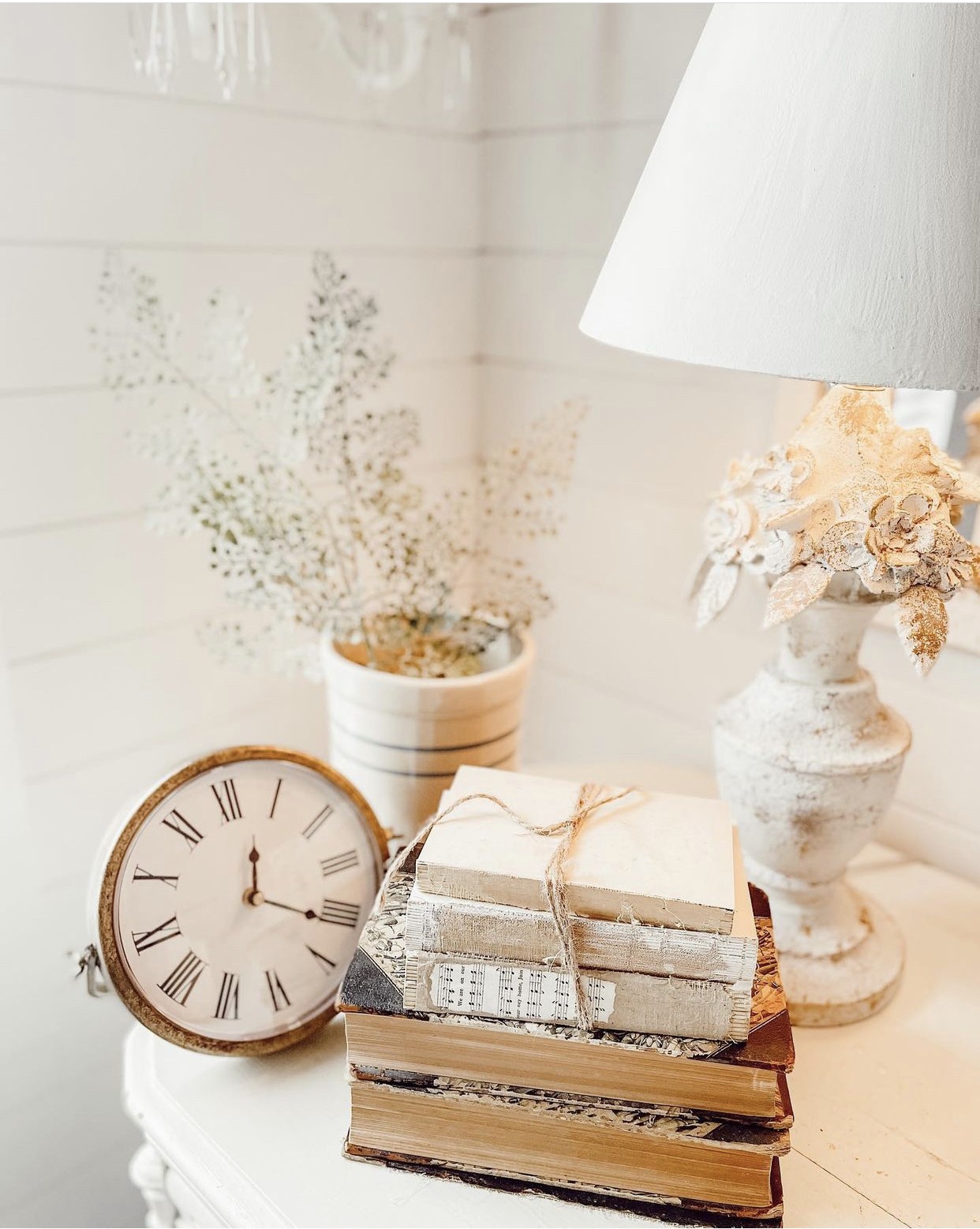 Another cozy size table for inspiration! This time, @tarastexasfarmhouse is sharing her brass table clock and I love everything she paired with it!