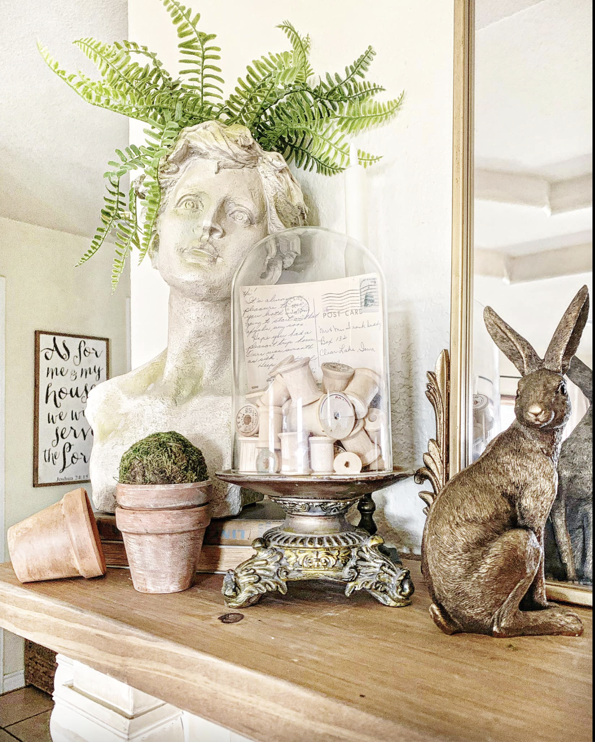 Over in my Community Facebook Group, Victoria Salas shared this photo with me of her cozy mantel! I love the bust planter and the rabbit that she chose to style together. The one thing I love about this QVC collection is all of the decor works so great mixing and matching together.