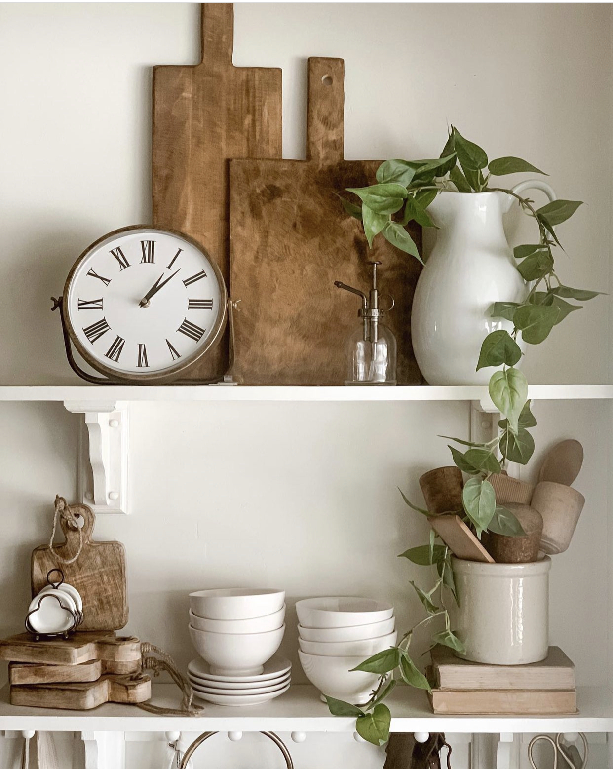This open shelving shared by @mimis.fauxfarmhouse is so pretty mixed with functional AND cozy decor. This is the large table clock from my collection and I love how it looks paired with kitchen decor!