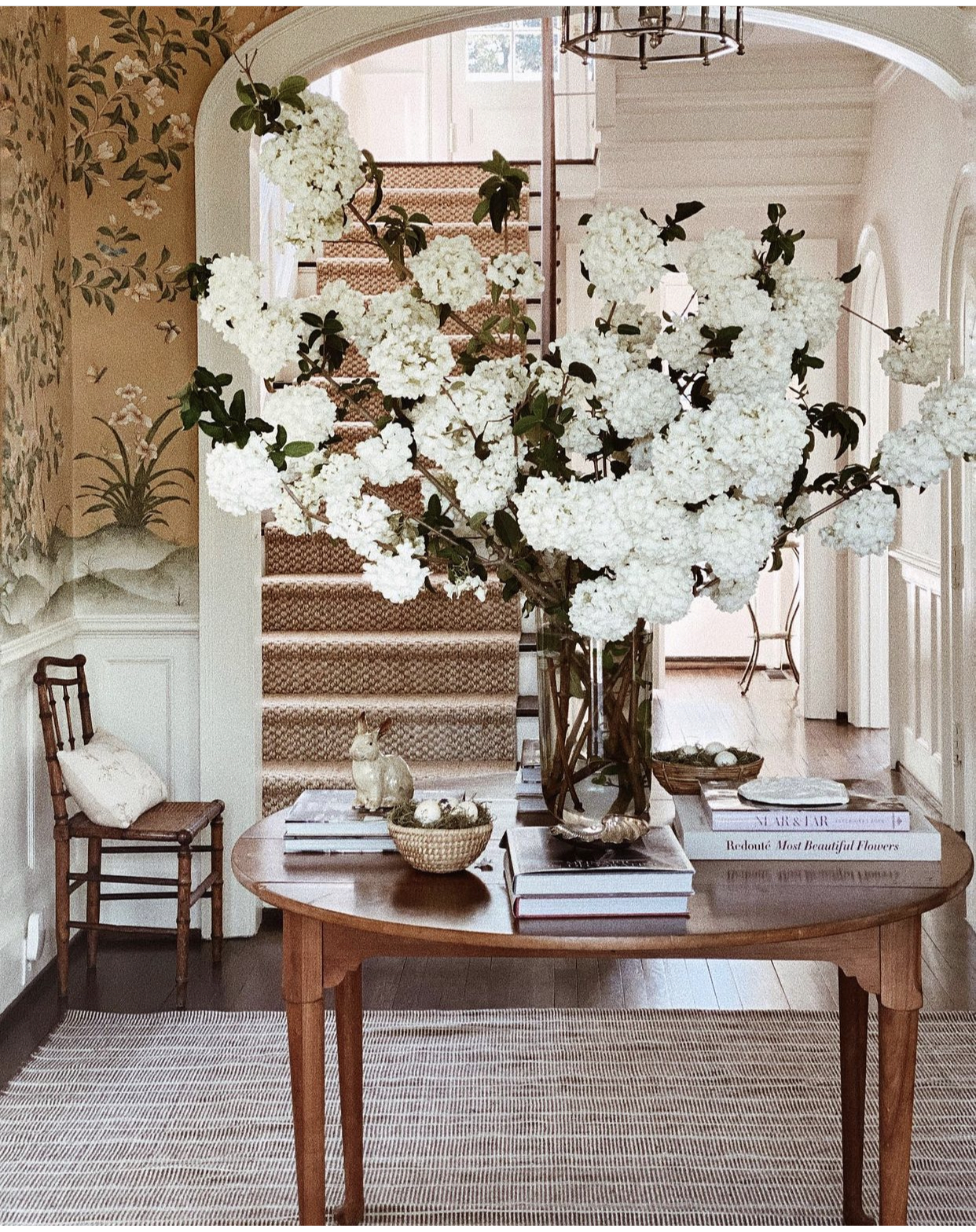 Not only are these large hydrangea stems so striking (and I’m looking forward to cutting a few down of my own this summer) the staircase peeking out behind the arrangement is also so pretty and a design element that I am taking in! The photo, shared by @gadabout is so inspiring and I love her use of space to make things feel so cozy.