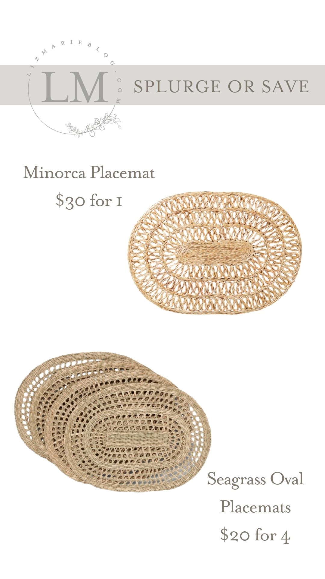 I love these seagrass placemats for both indoors and out. They are a great addition of texture to any tablescape and are easy to wipe clean! Shop both splurge or save seagrass placemats above by clicking the images below: