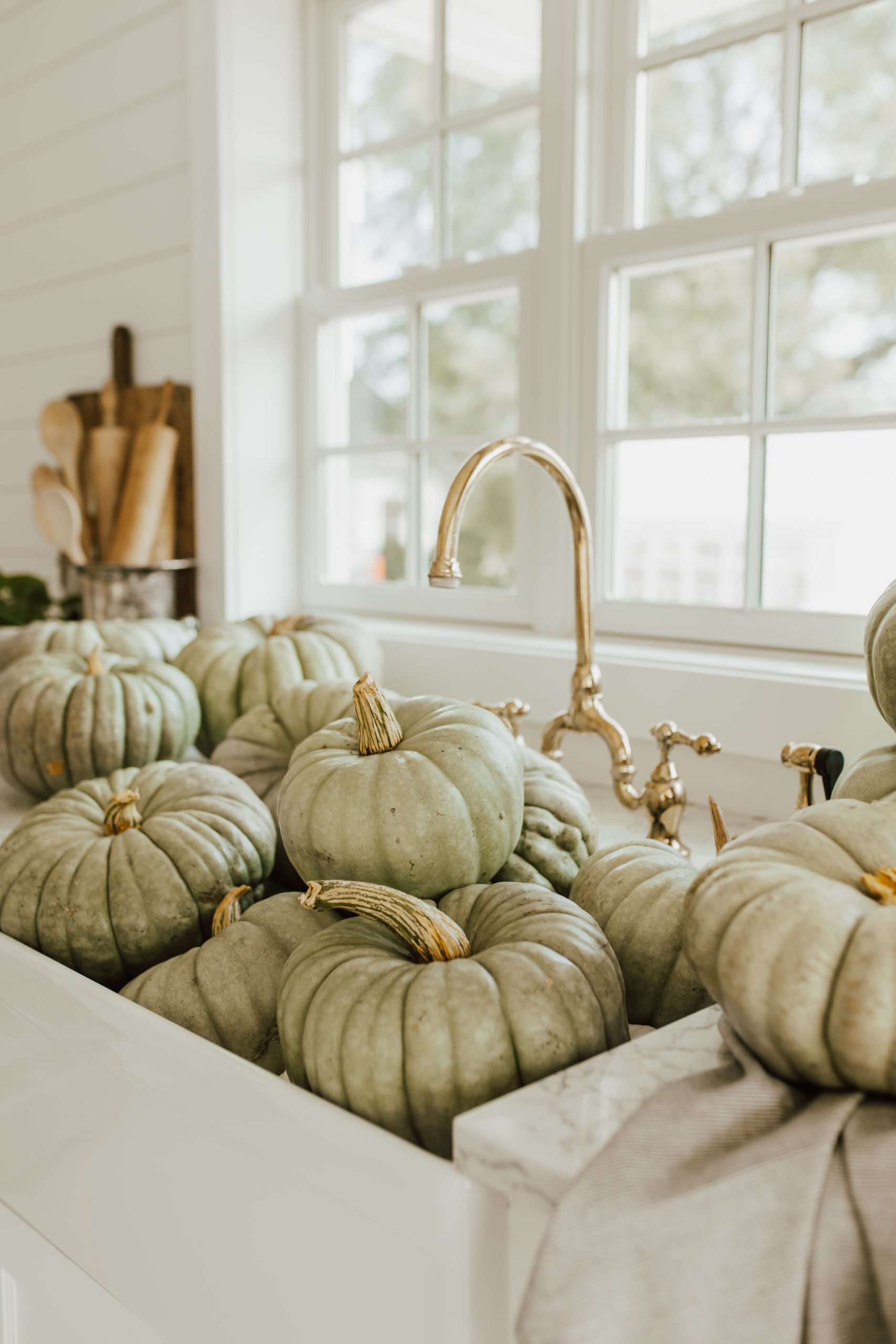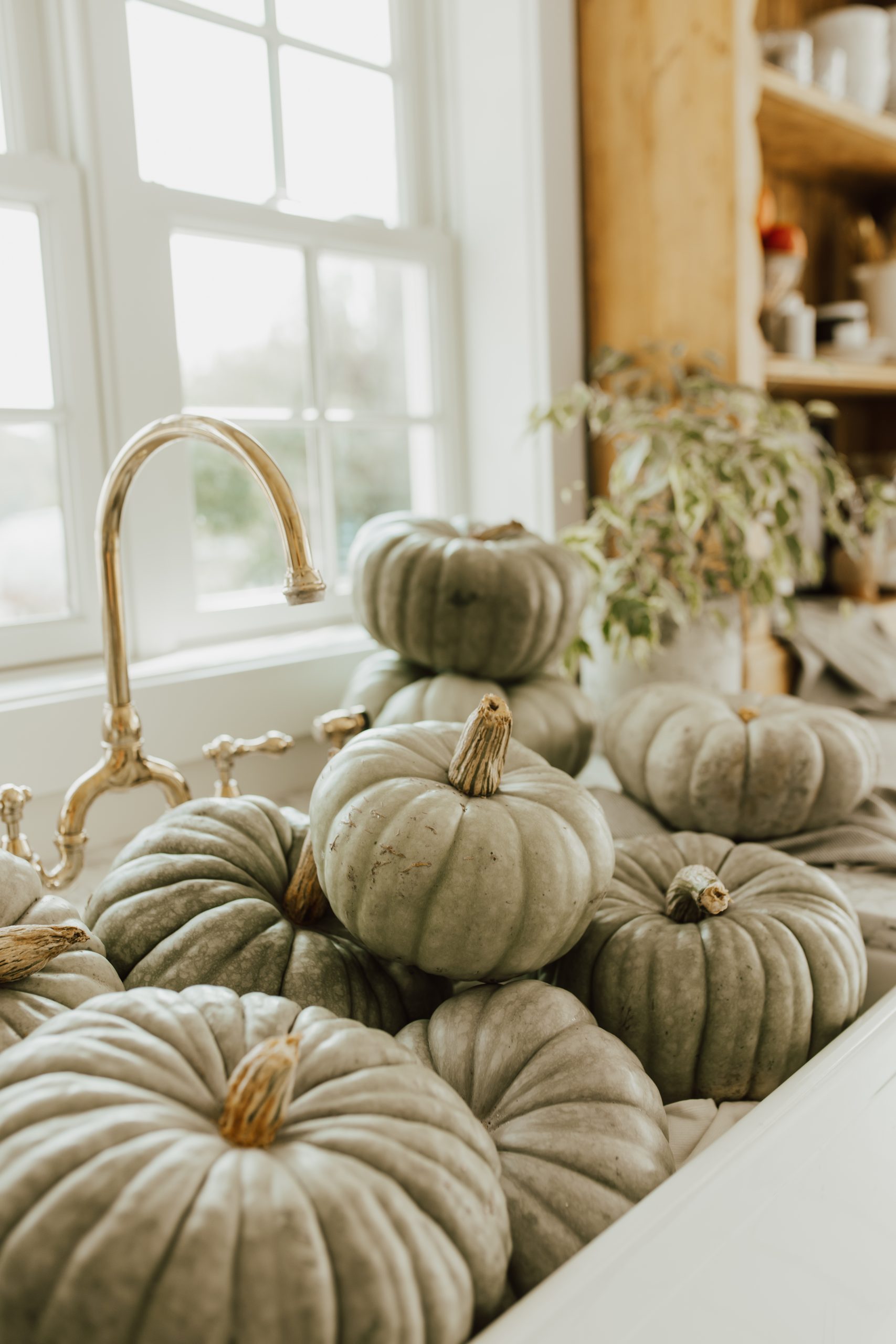 To really set the pumpkins up for success, wash any dirt and debris. We have noticed that pumpkins with heavy dirt, causes coloring fading and leads to rot. I bring my pumpkins into the sink, and give them a nice sink bath with Dawn dish soap, and brush off the debris with a vegetable brush. Once they’re clean, I rinse and pat dry.