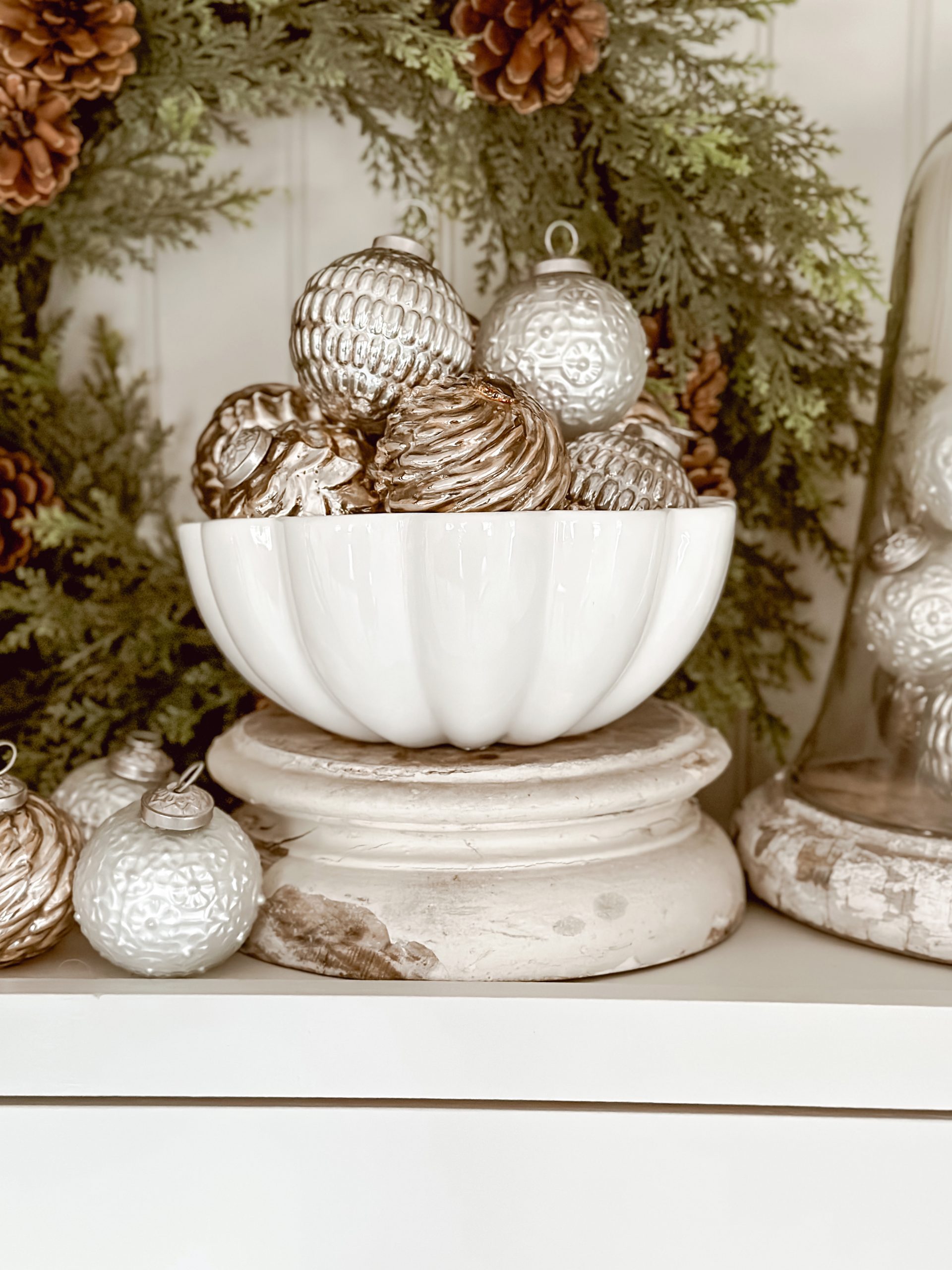 Today on my Instagram I shared a Christmas decor hack that I love. It’s so simple, but adds such a big impact. I love grabbing a pretty bowl [the one above linked here] & filling it with ornaments that I love to place on bookshelves, coffee tables, entry tables, & more. It adds so much cozy texture & a festive touch to any space. And again, it is so easy! I also love that you can customize it with different bowl sizes, shapes, colors, & styles & also different colors, textures, & patterns of your ornaments. I have been busy gathering Christmas items from tree toppers to pillows to gingerbread decor & more [HERE]. Today I gathered up 60+ festive ornament sets that fit that cozy cottage farmhouse christmas decor that I love so much. You can shop them below by clicking the images of the ones that you love: