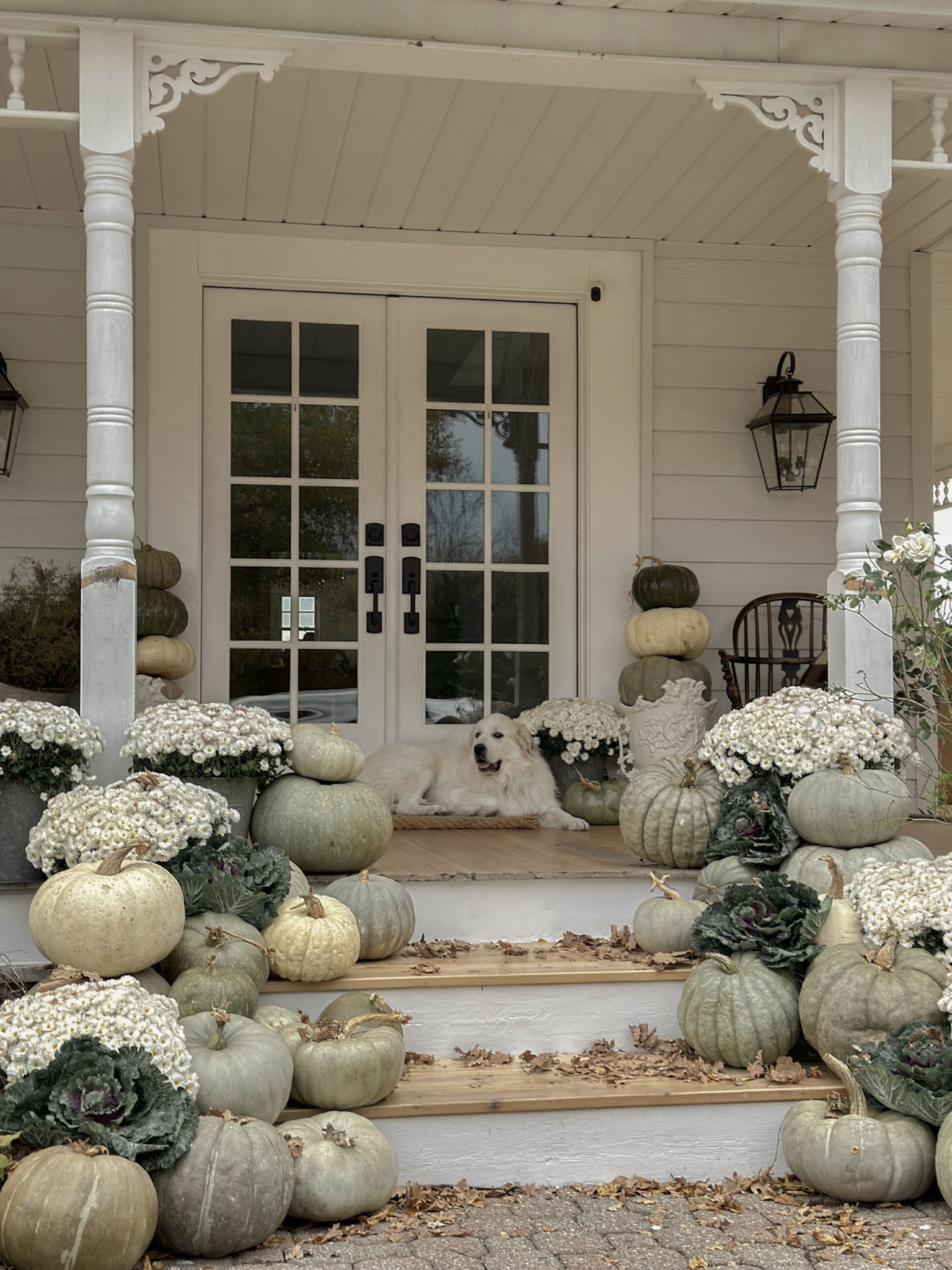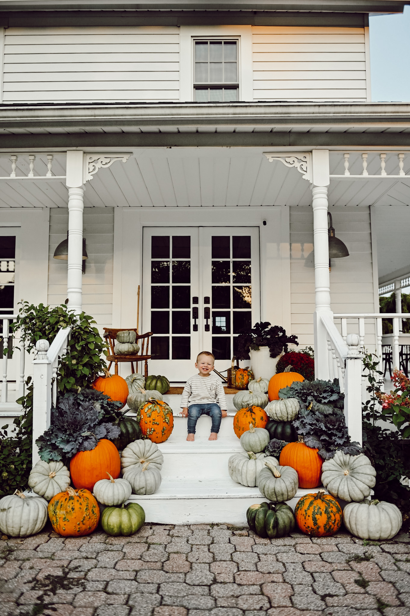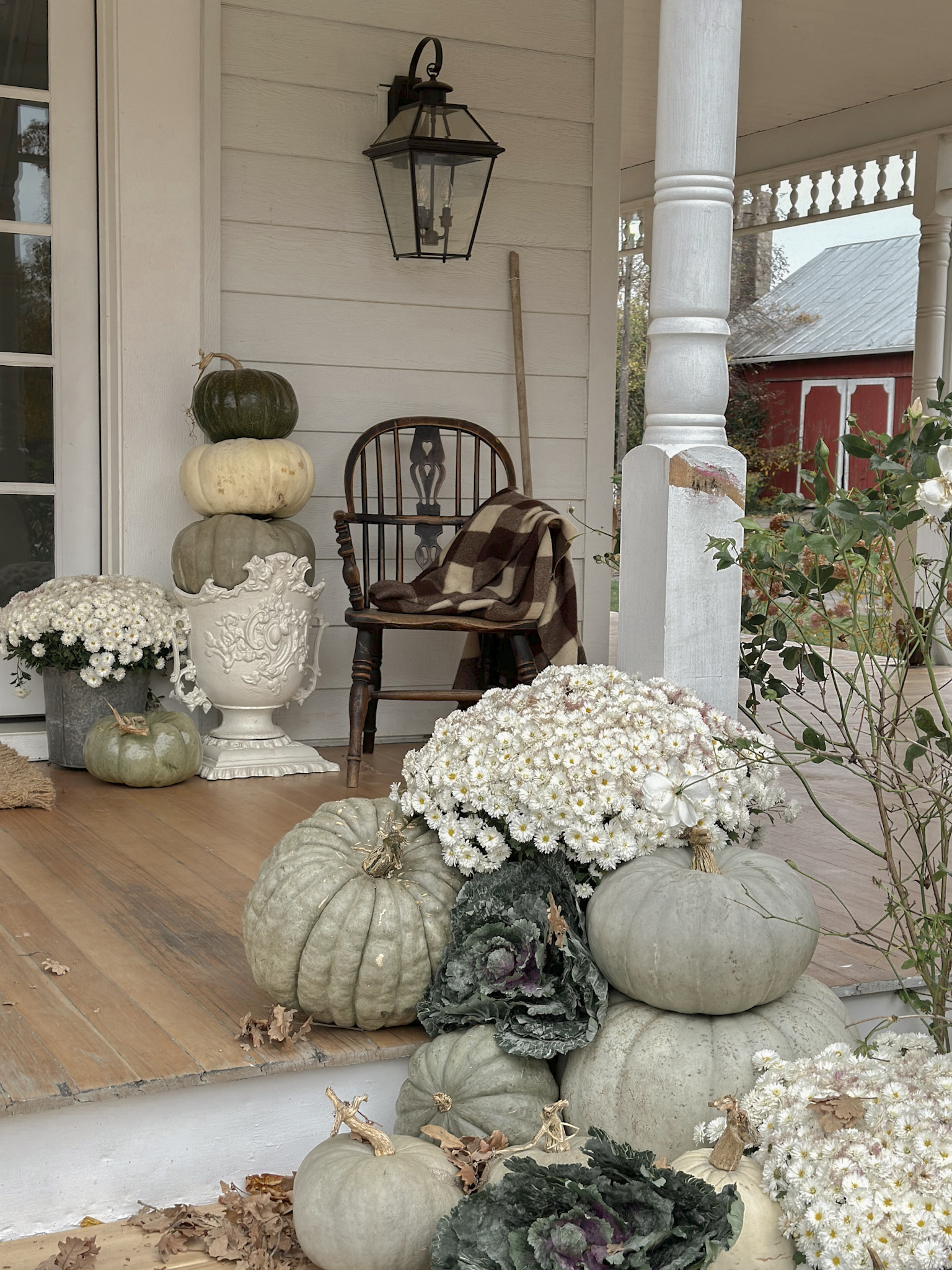 Hi friends! Well, nothing like posting my fall decor here on the farm last minute. Let’s face it, after halloween I start decorating and sharing more Christmas decor so this truly is last minute for me. BUT the important part is that I am sharing it right? Actually, to be quite honest I wasn’t feeling very inspired or motivated this fall to decorate or share a lot. I didn’t know what it was, but I feel like my mental health had a lot to do with it, but the good news is I am starting to feel motivated & inspired again for the next season ahead. Burnout? Creative block? Whatever it is, it’s normal so I wanted to share that with you in case you were feeling alone in those feelings. Even though I wasn’t feeling it, you know I had to stack some pumpkins on our farmhouse porch like I do every year & I especially had to do it because we have been working on our farmhouse porch that had been falling apart. The porch isn’t done, but we made a ton of progress & the pumpkins look good sitting on the steps now..