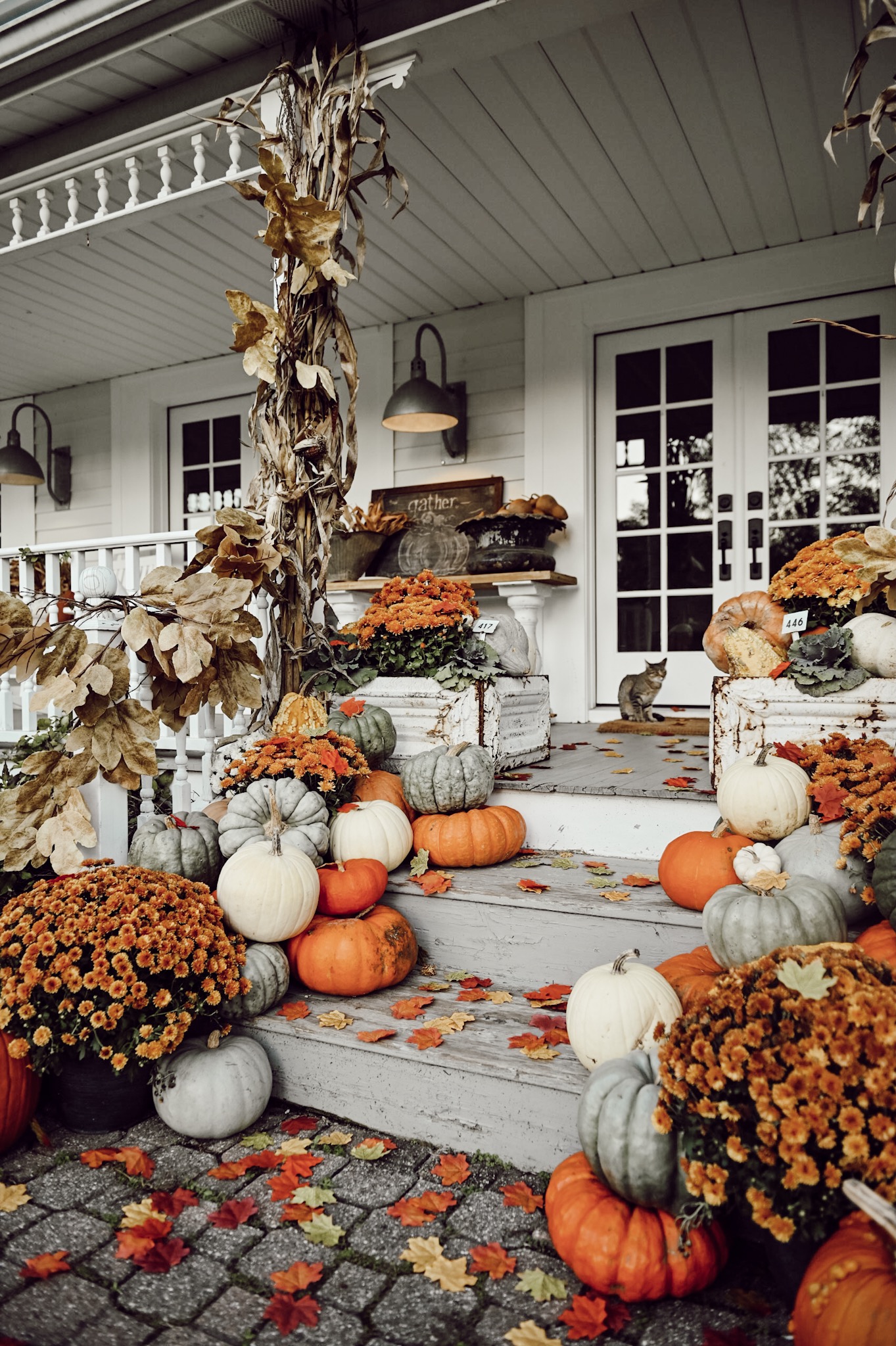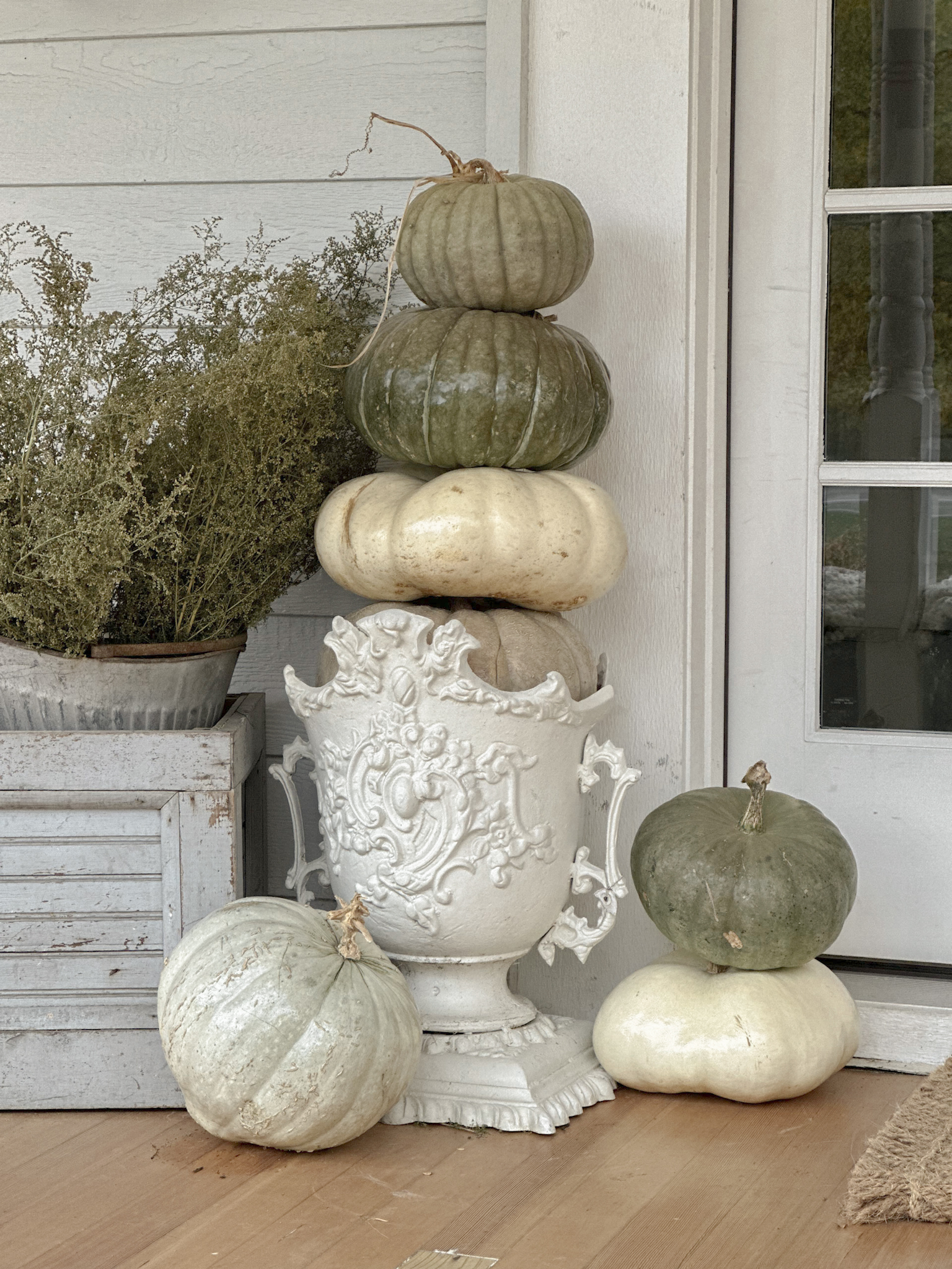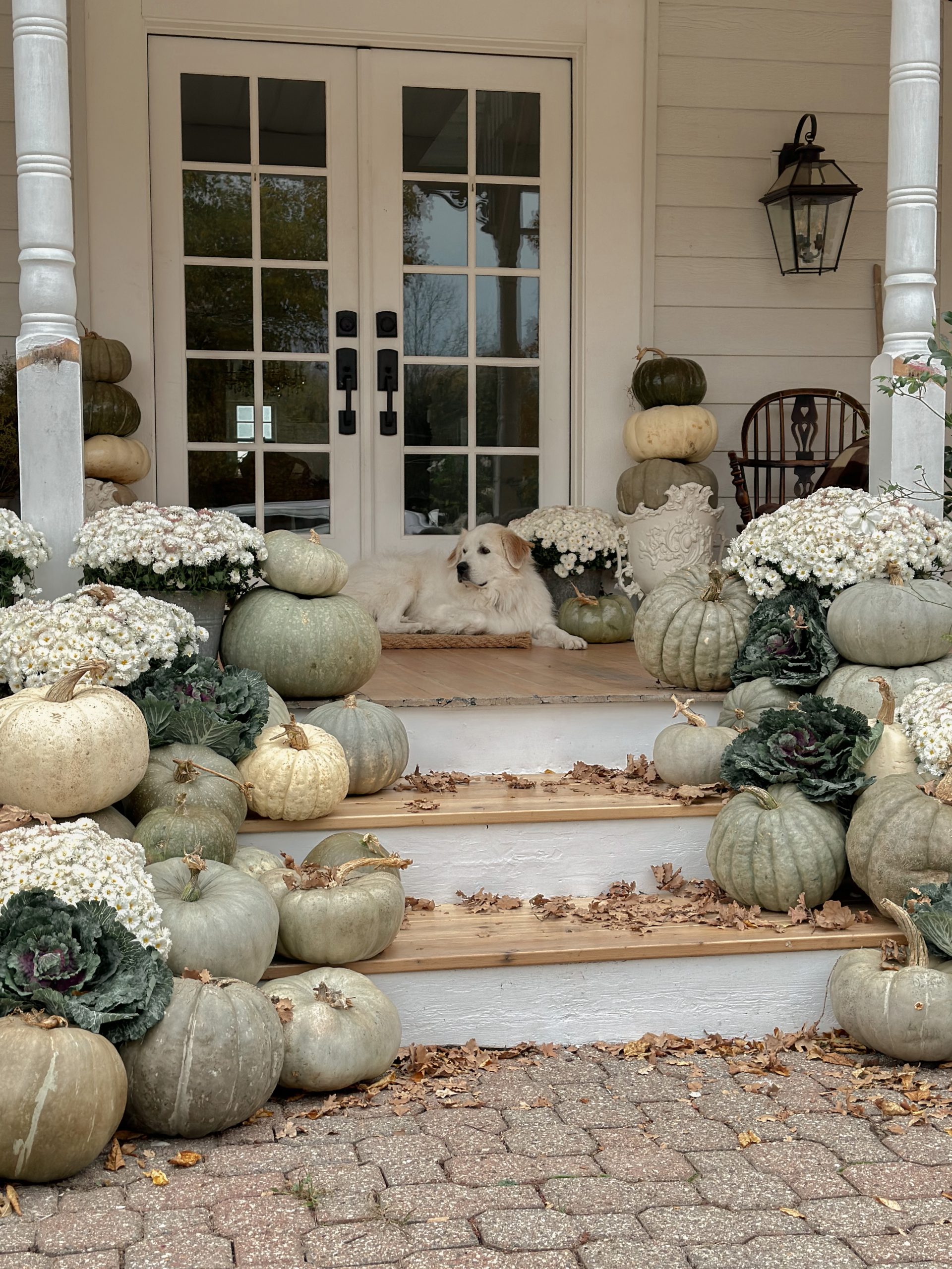 Hi friends! Well, nothing like posting my fall decor here on the farm last minute. Let’s face it, after halloween I start decorating and sharing more Christmas decor so this truly is last minute for me. BUT the important part is that I am sharing it right? Actually, to be quite honest I wasn’t feeling very inspired or motivated this fall to decorate or share a lot. I didn’t know what it was, but I feel like my mental health had a lot to do with it, but the good news is I am starting to feel motivated & inspired again for the next season ahead. Burnout? Creative block? Whatever it is, it’s normal so I wanted to share that with you in case you were feeling alone in those feelings. Even though I wasn’t feeling it, you know I had to stack some pumpkins on our farmhouse porch like I do every year & I especially had to do it because we have been working on our farmhouse porch that had been falling apart. The porch isn’t done, but we made a ton of progress & the pumpkins look good sitting on the steps now..