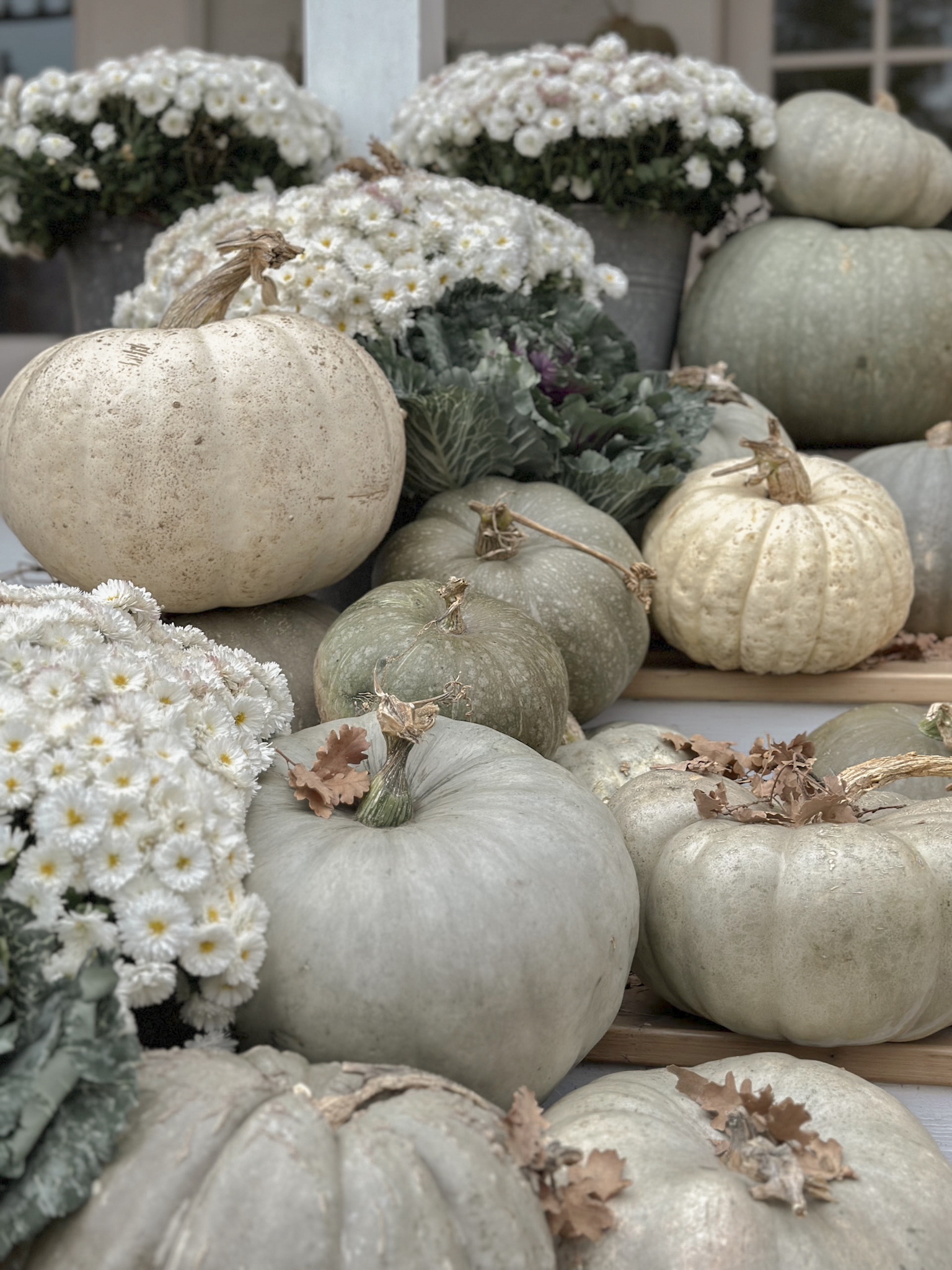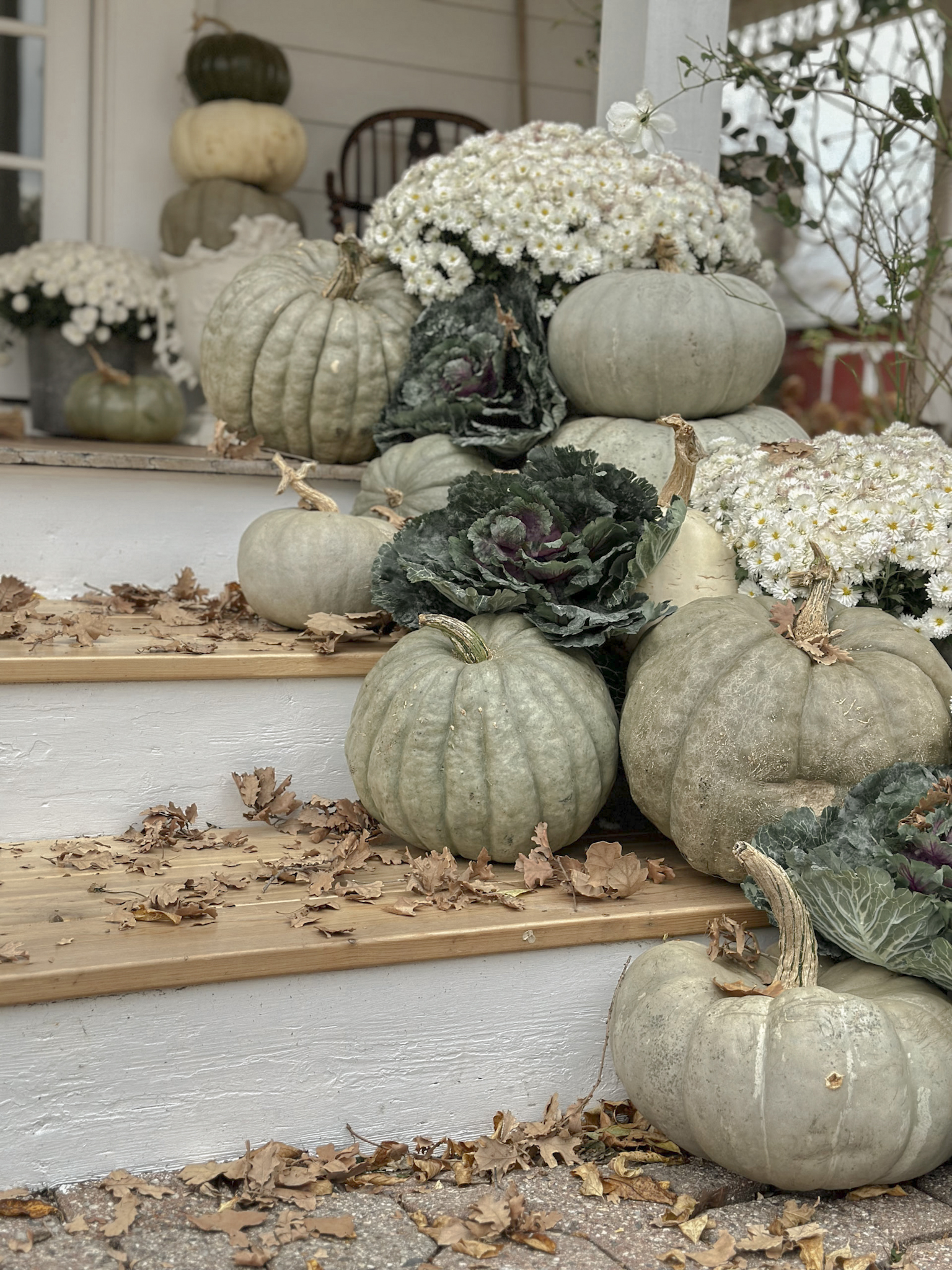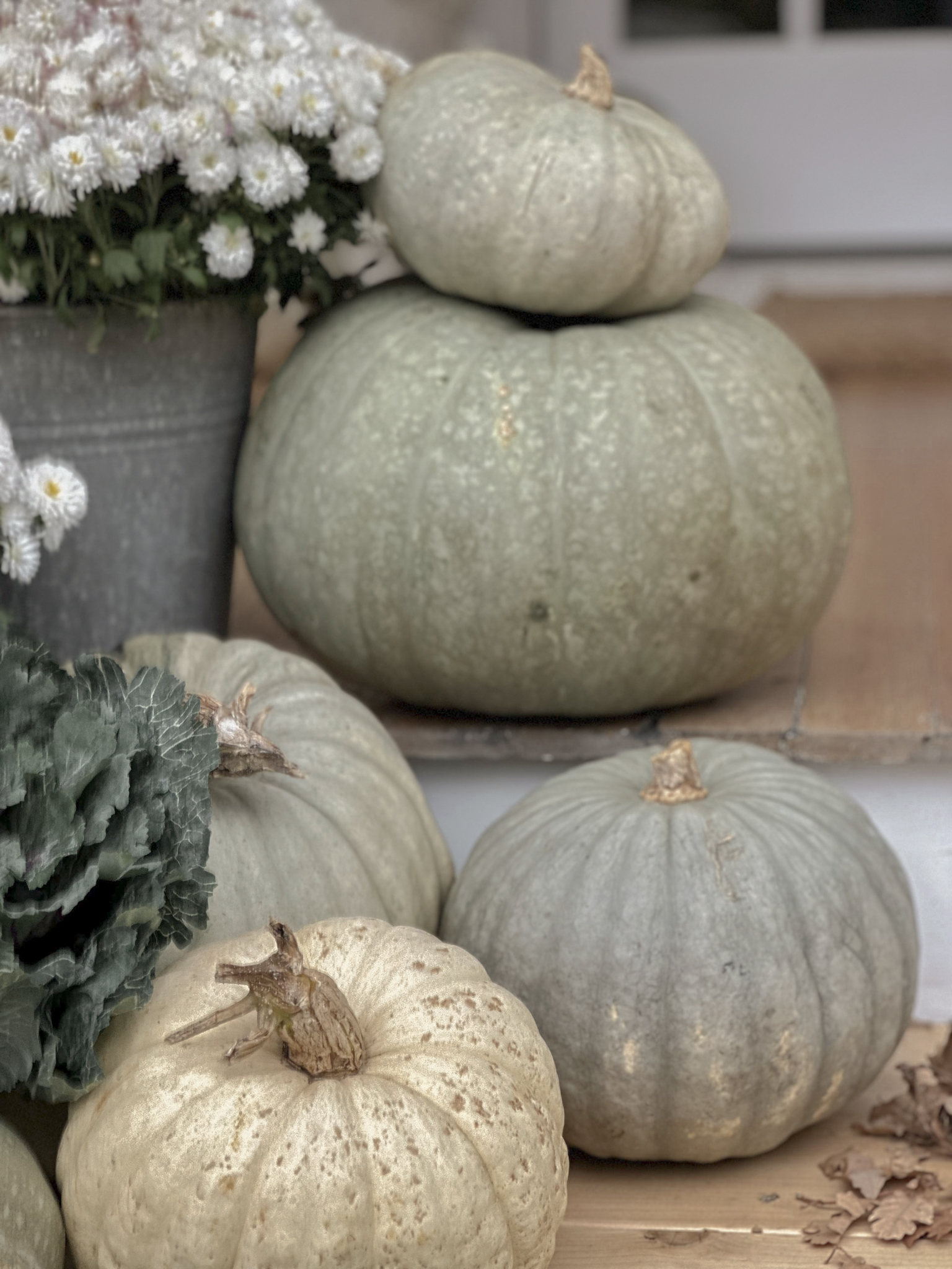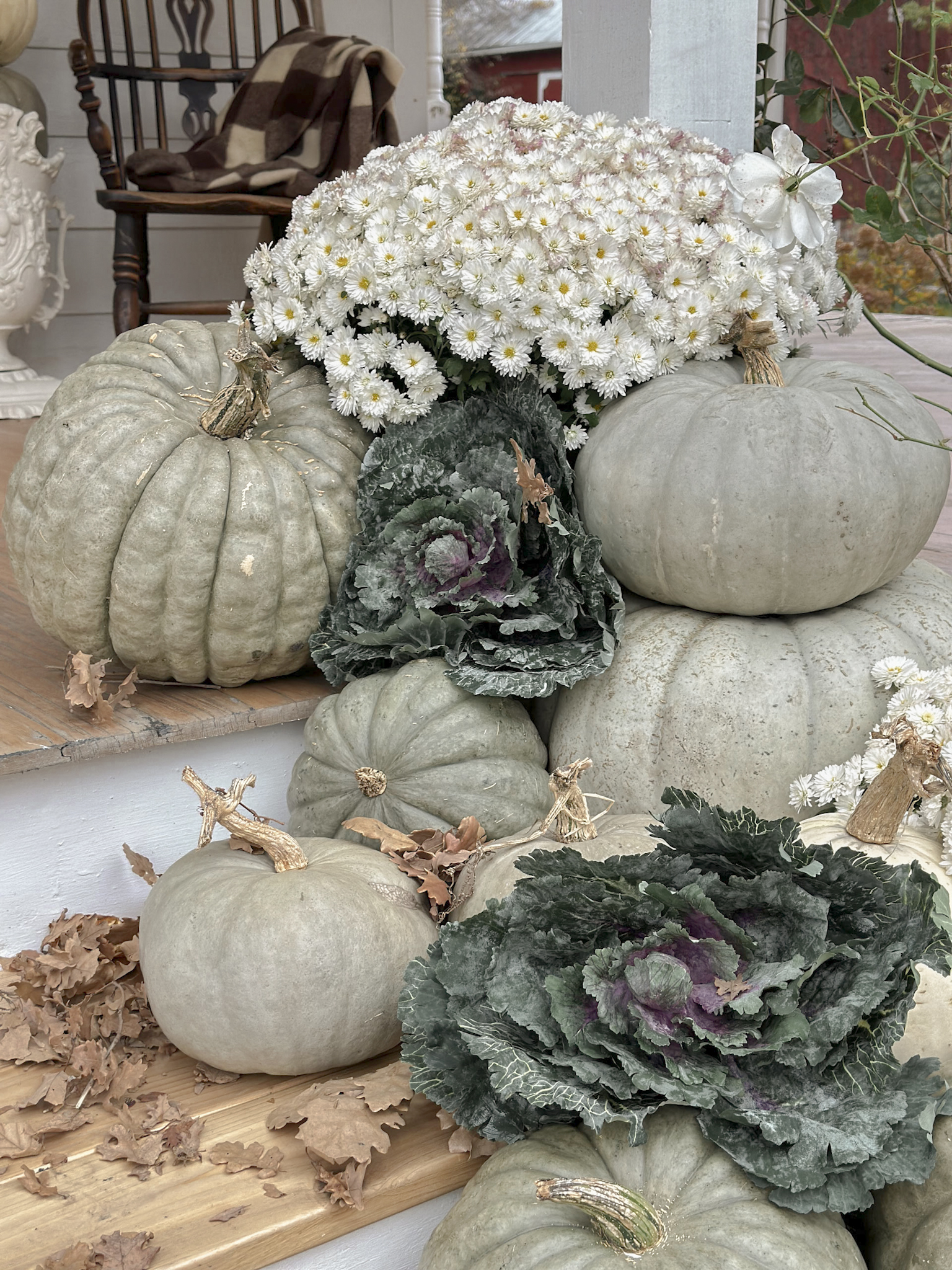 This year I went with white mums in some antique buckets I found in a local barn, pumpkins in blues/greens/whites, & some faux kale that I got from hobby lobby. I was going to use our kale from our garden, but some little creatures got to it before I could… faux will do!