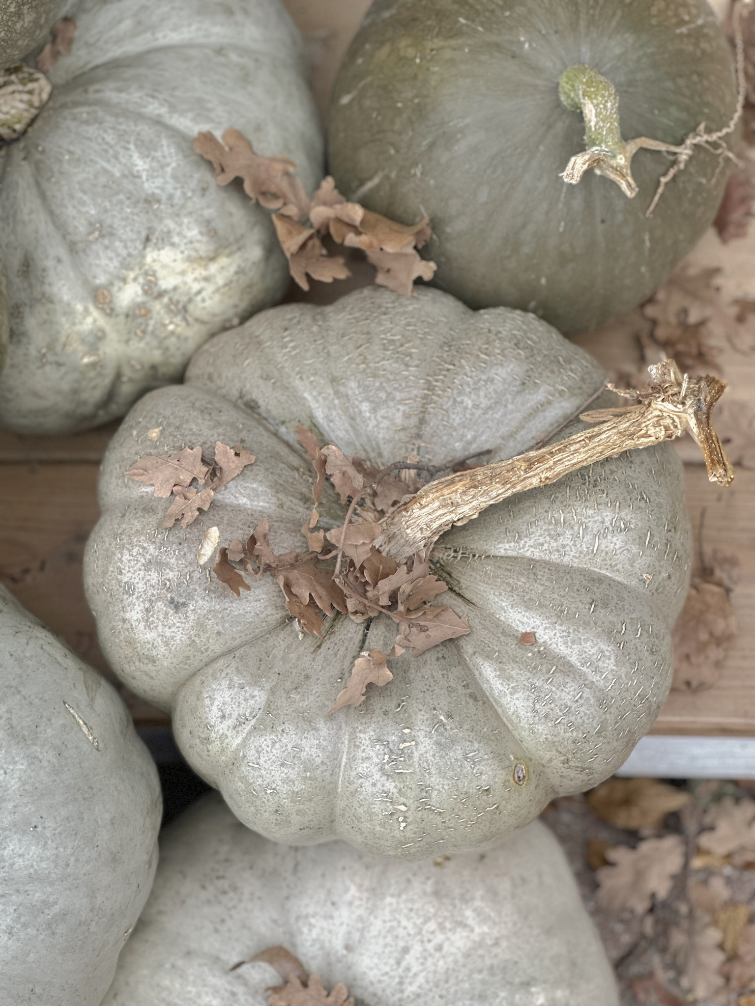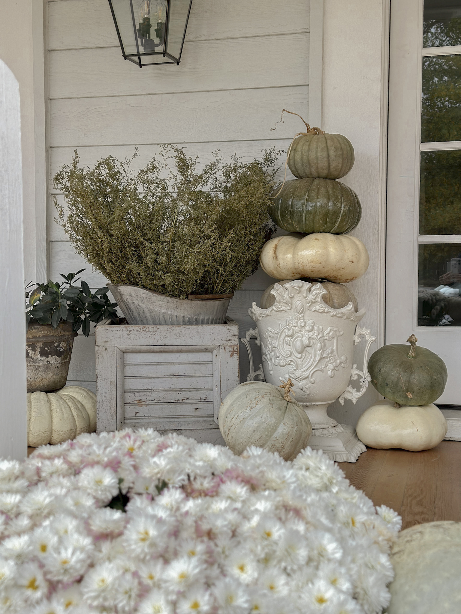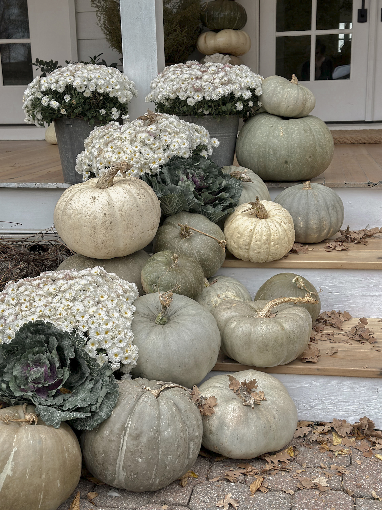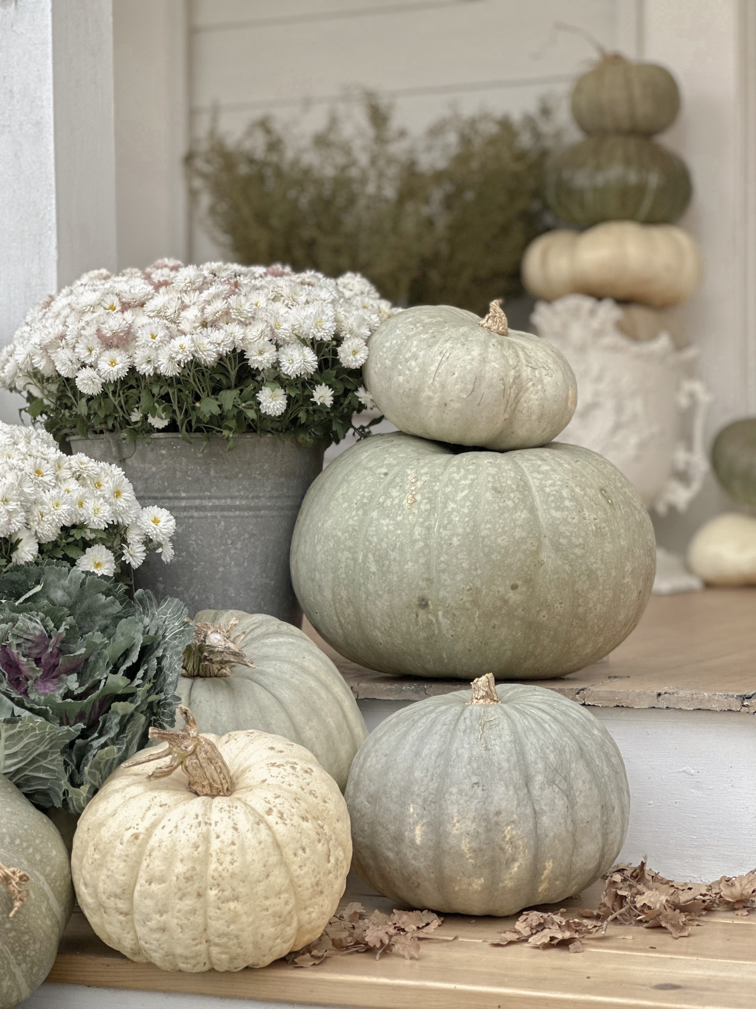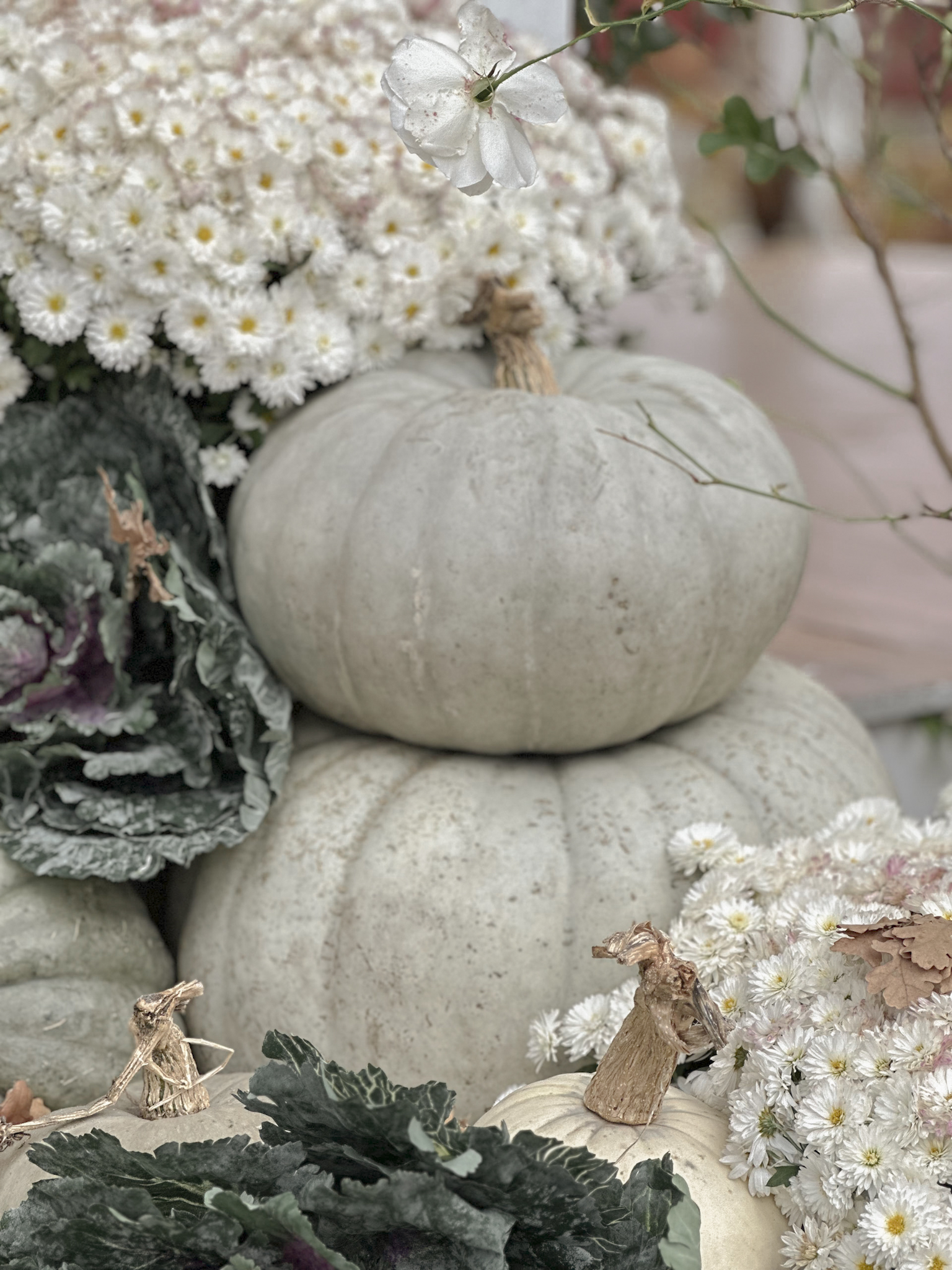 This year I went with white mums in some antique buckets I found in a local barn, pumpkins in blues/greens/whites, & some faux kale that I got from hobby lobby. I was going to use our kale from our garden, but some little creatures got to it before I could… faux will do!