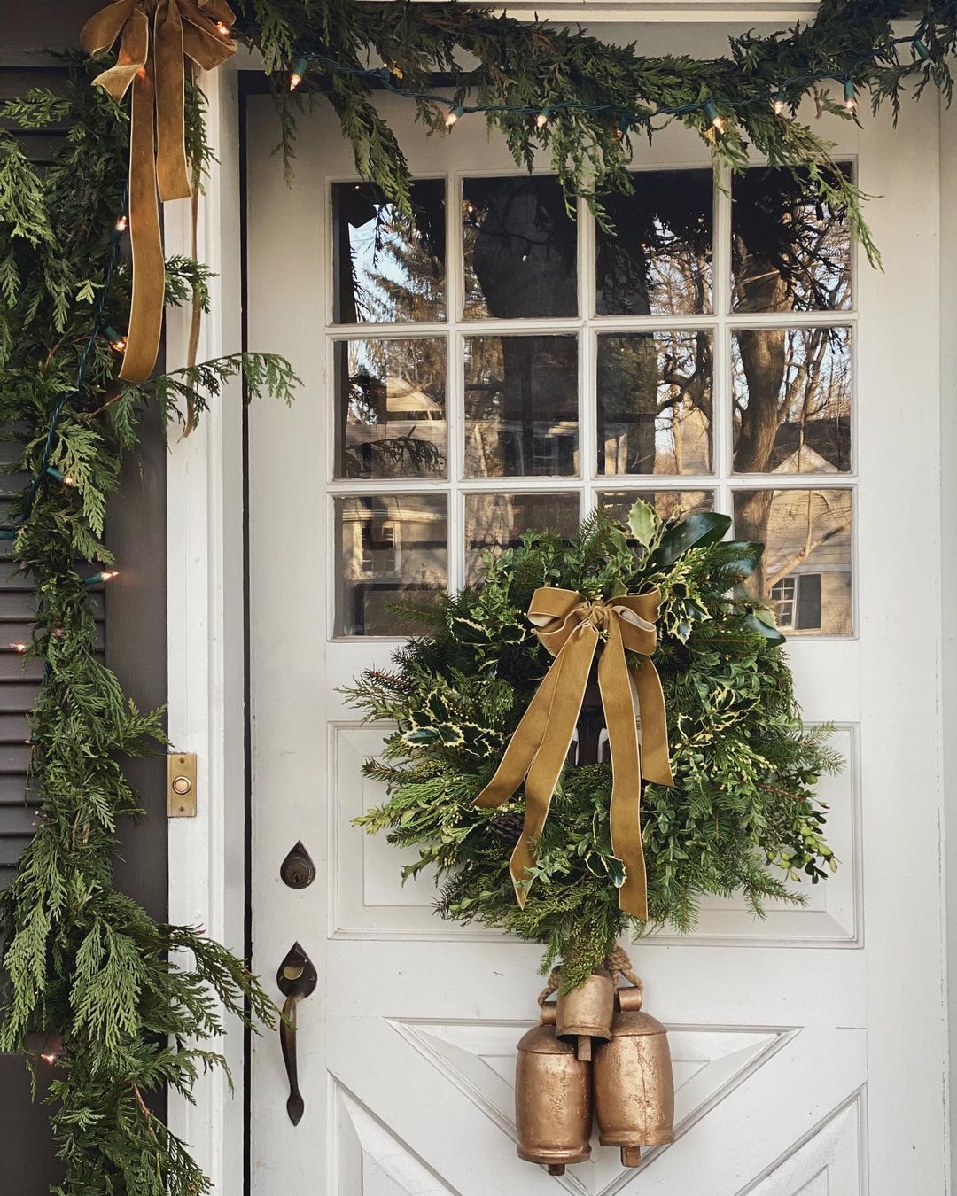 I love nineandsixteen so much. A favorite follow & I am always inspired by her shares & you will be too! I thought this idea was unique that she shared in the placement of the wreath on the door. I loved it hung low like this & those bells hanging over the solid portion of the door. Simply beautiful & so unique!