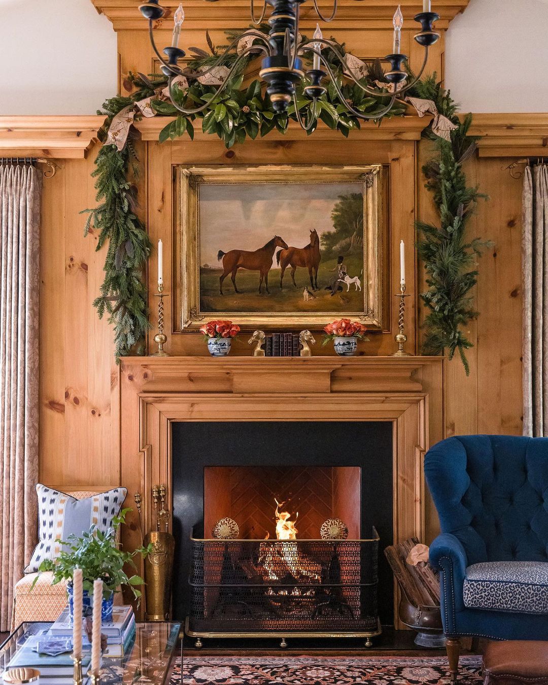 This share from ericrossinteriors caught my eye right away again with the greenery being brought up! I thought it was so nice that instead of styling the garland on the mantel it is brought up to the top of the trim of the fireplace. It really brings your eye up & shows off that beautiful wood finish & painting. So uniquely beautiful!
