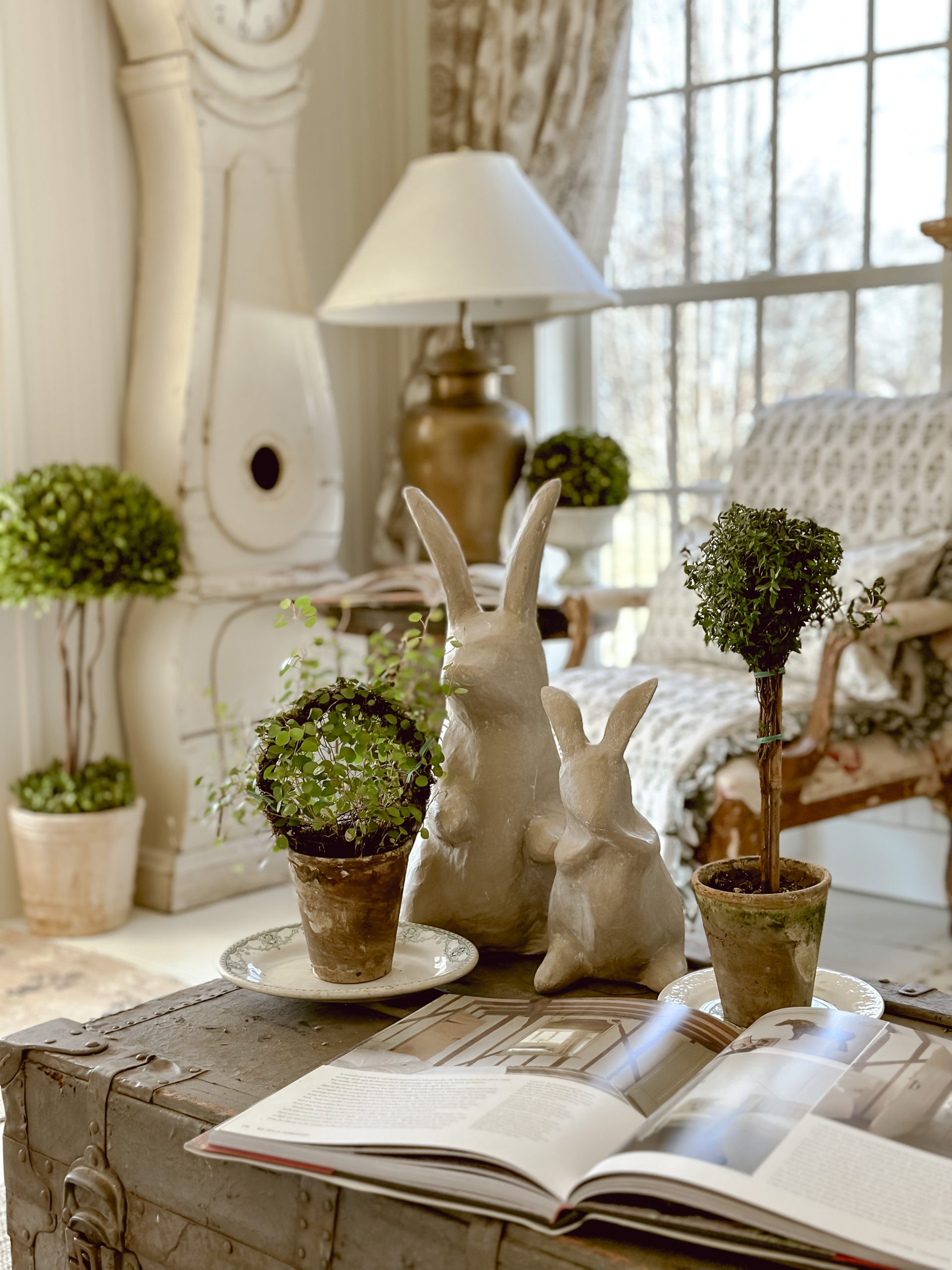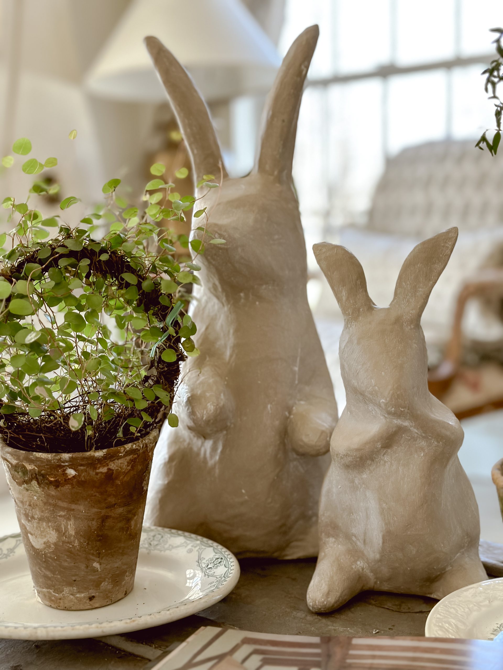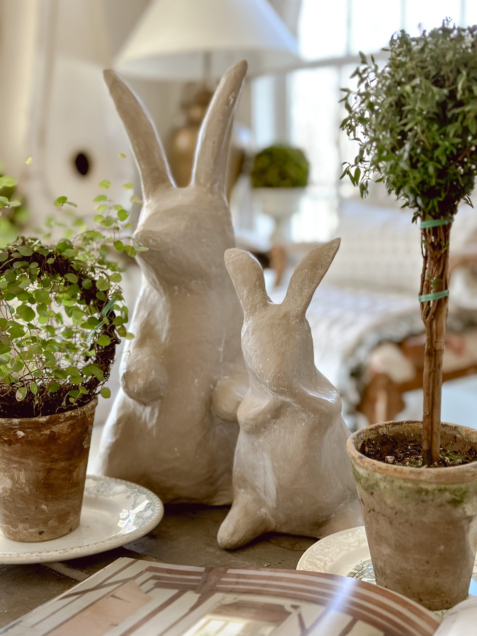 I used [this paint here in my DIY folder] in the color Algonquin & the [white or liming wax here] for the rabbits and I love how they turned out! I quickly styled them here to share with you, but you will be seeing them around the house in other looks. You can also apply more coats of white wax to get more of a stone look, but I just did one here to show you the DIY. You can see a video tutorial on my Instagram [HERE].