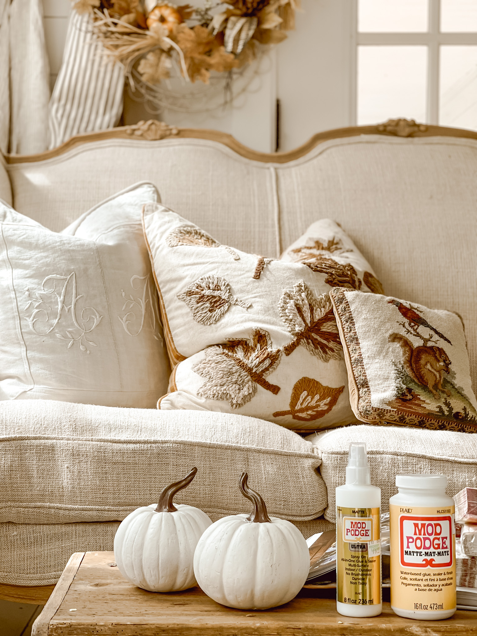 - Pre-Soak the Pumpkin: Before anything else, give your faux pumpkin a light coating with the Mod Podge spray-on. This helps the napkin adhere better and prepares the pumpkin’s surface.