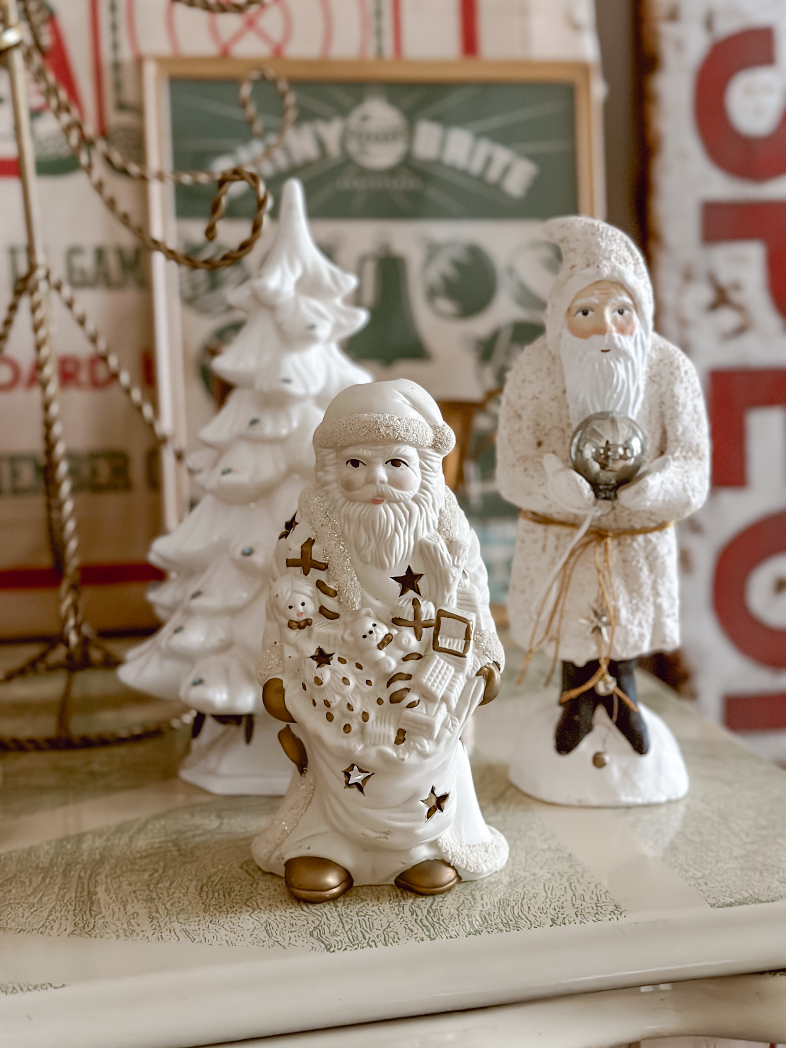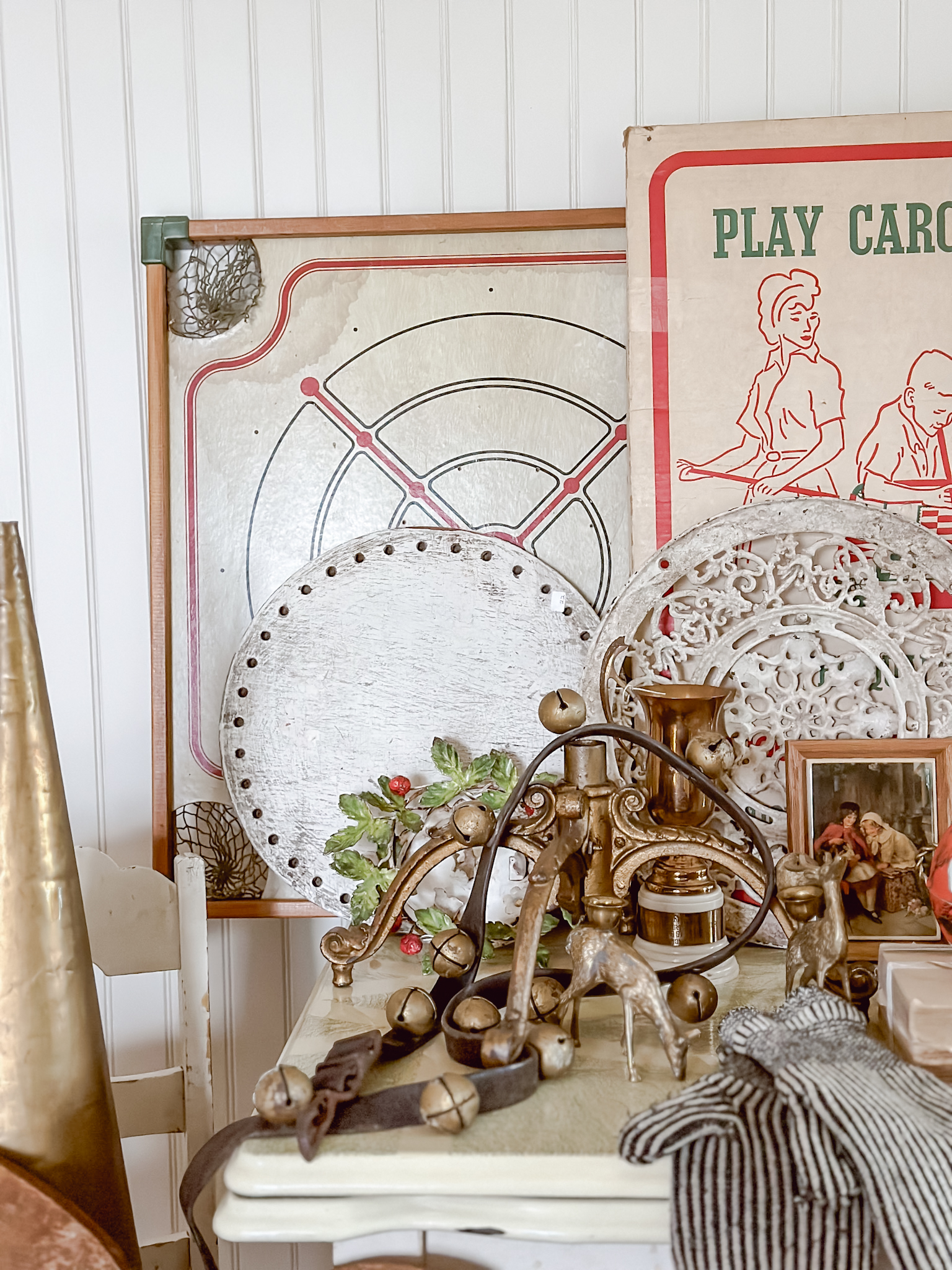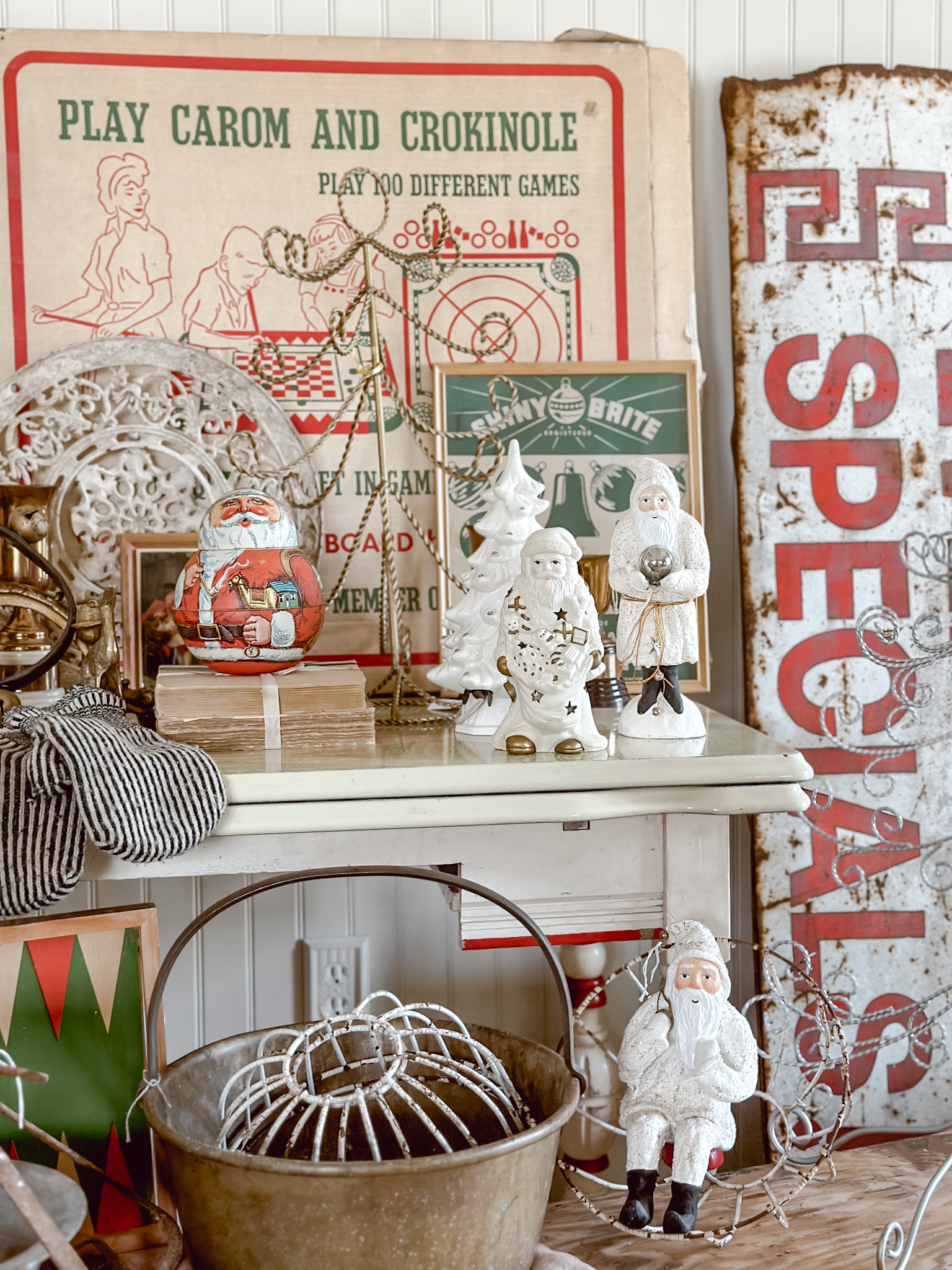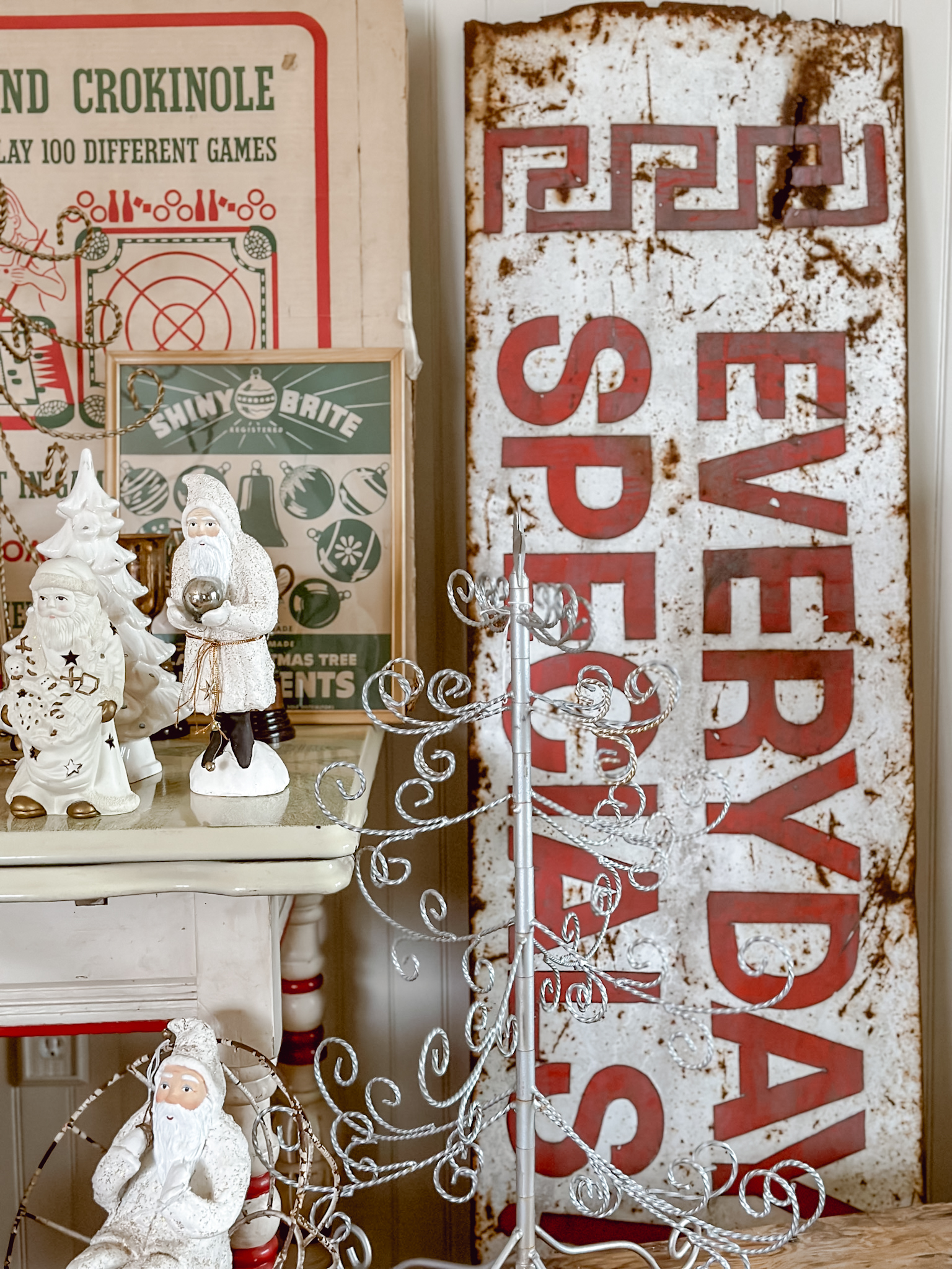 Decorating with antiques for Christmas decor is one of my favorite ways to decorate. It’s a great way to showcase how a few color ways along with some earthy tones and textures can really give off a large Christmas vibe, without being overly whimsical. Using game boards and signs to give off the pops of Christmas reds and greens along with more Christmas forward items like vintage Santa dolls, faux Christmas trees, or even some ornaments, are great ways to give the vintage and subtle Christmas vibe without being too Hallmark. I like decorate with “implied” Christmas decor… it doesn’t have to say Christmas to be Christmas decor.