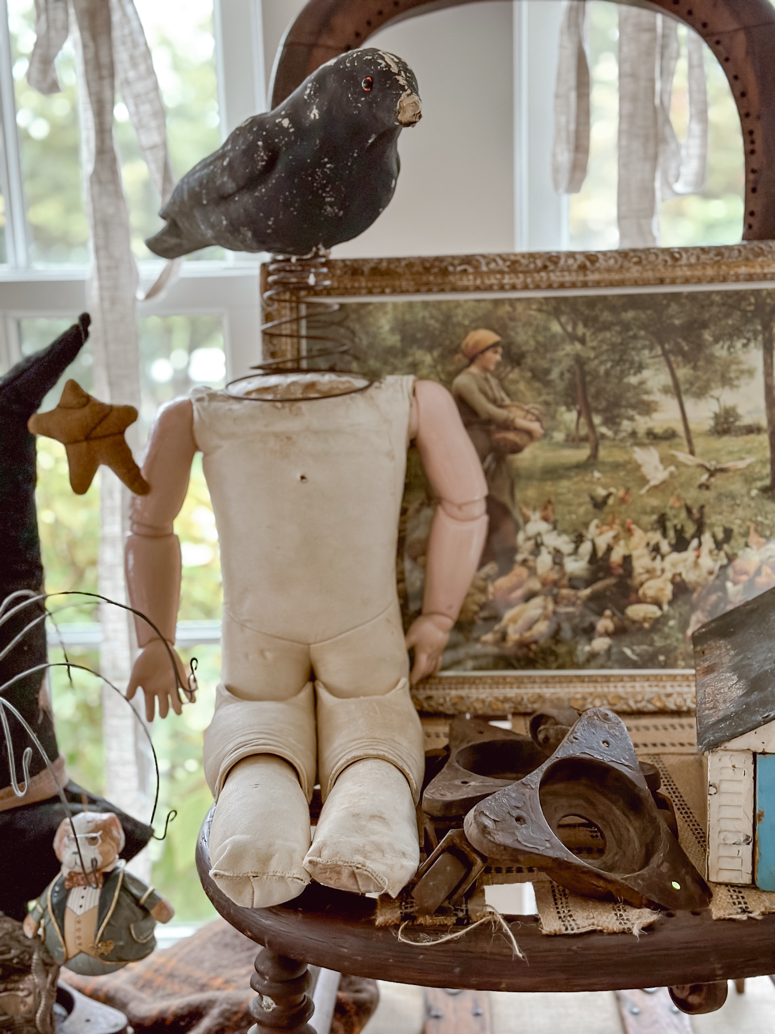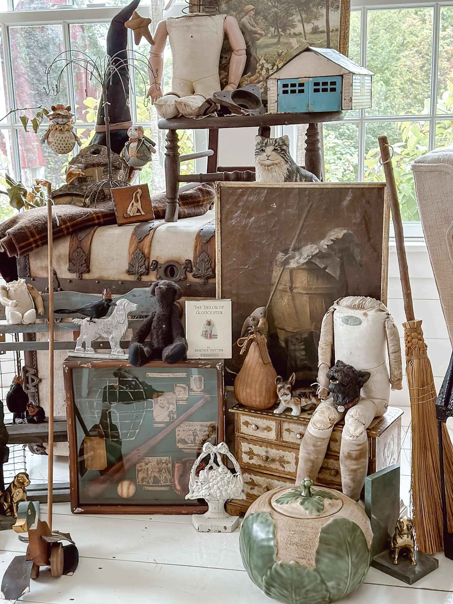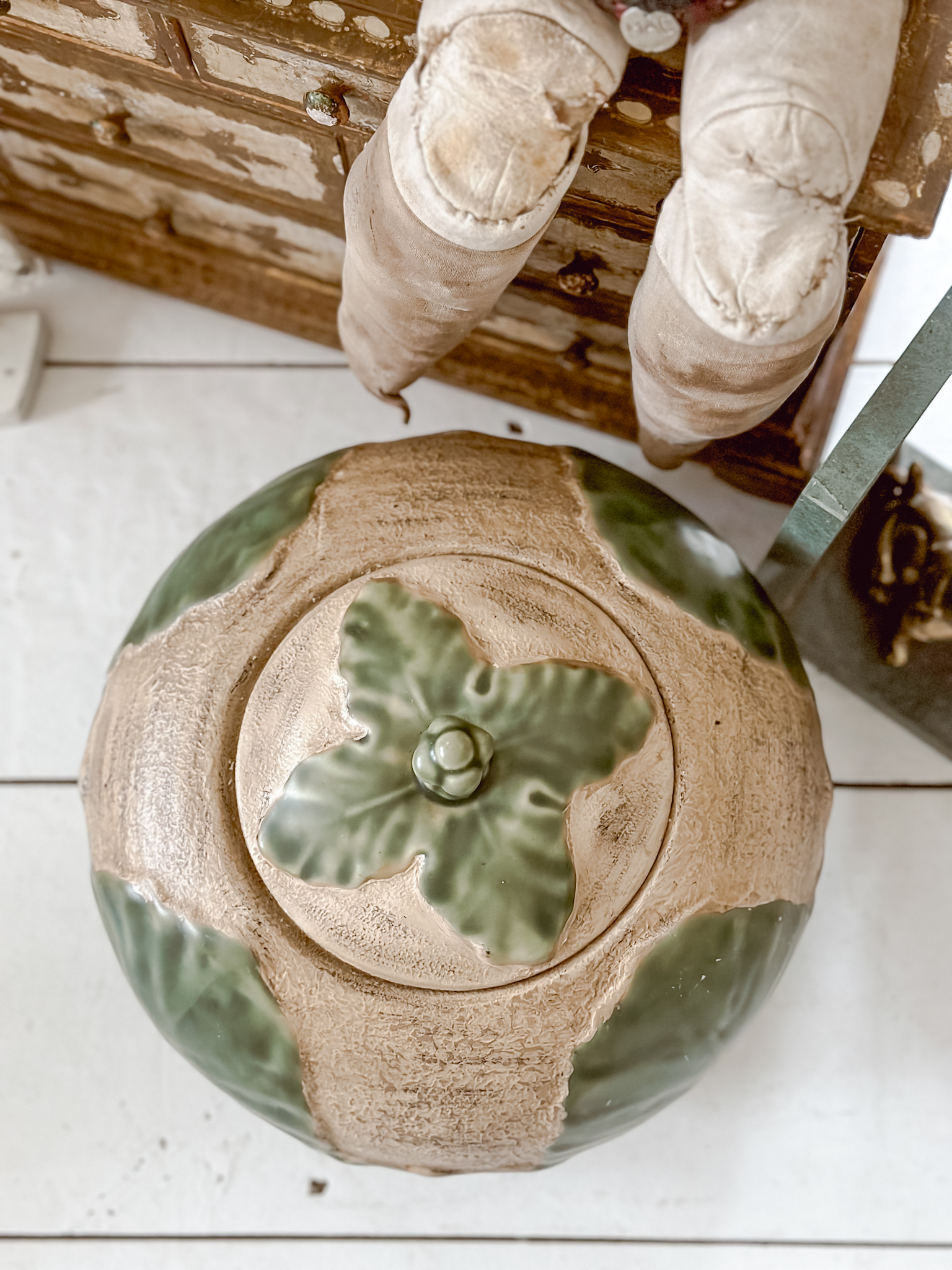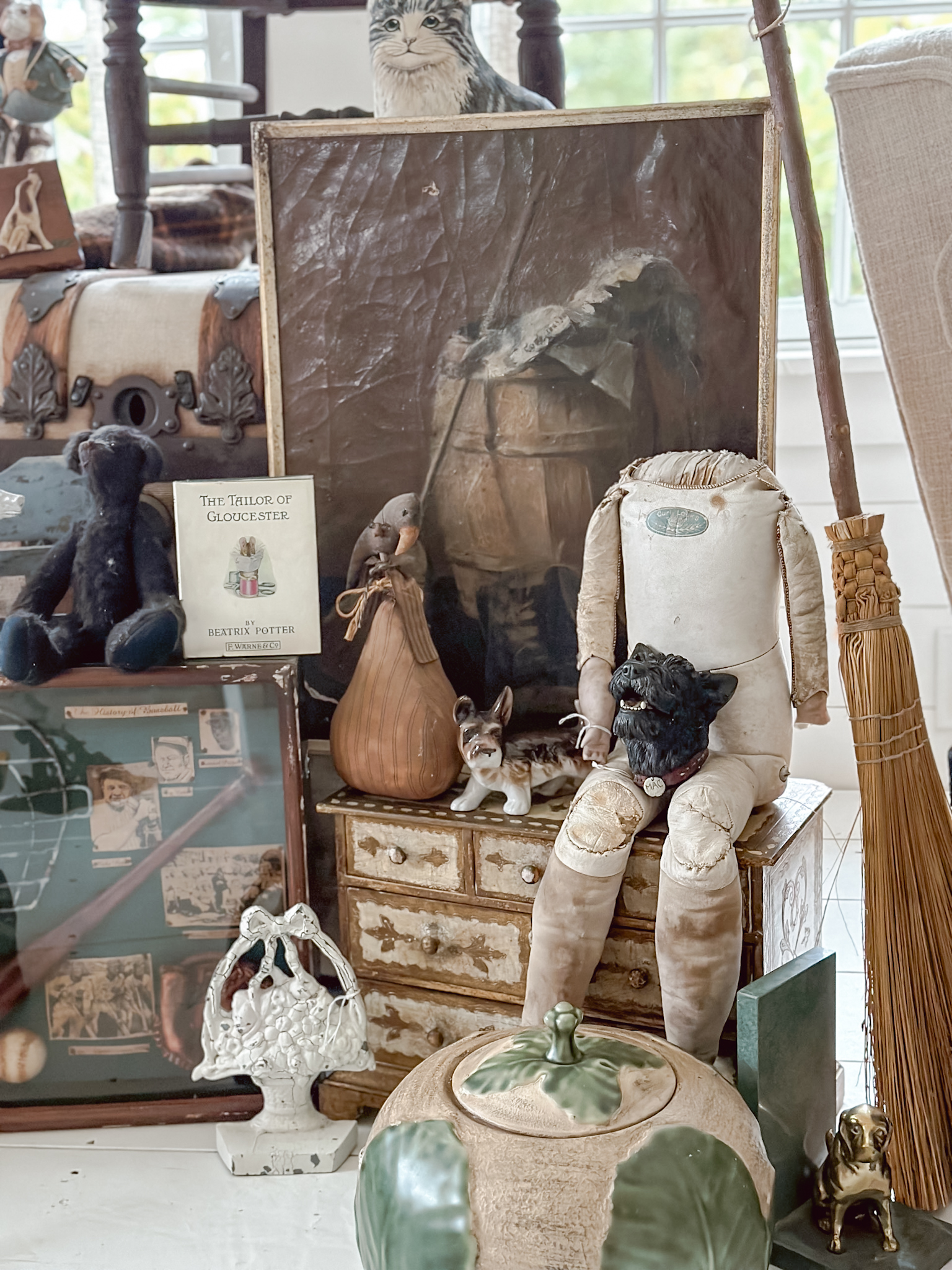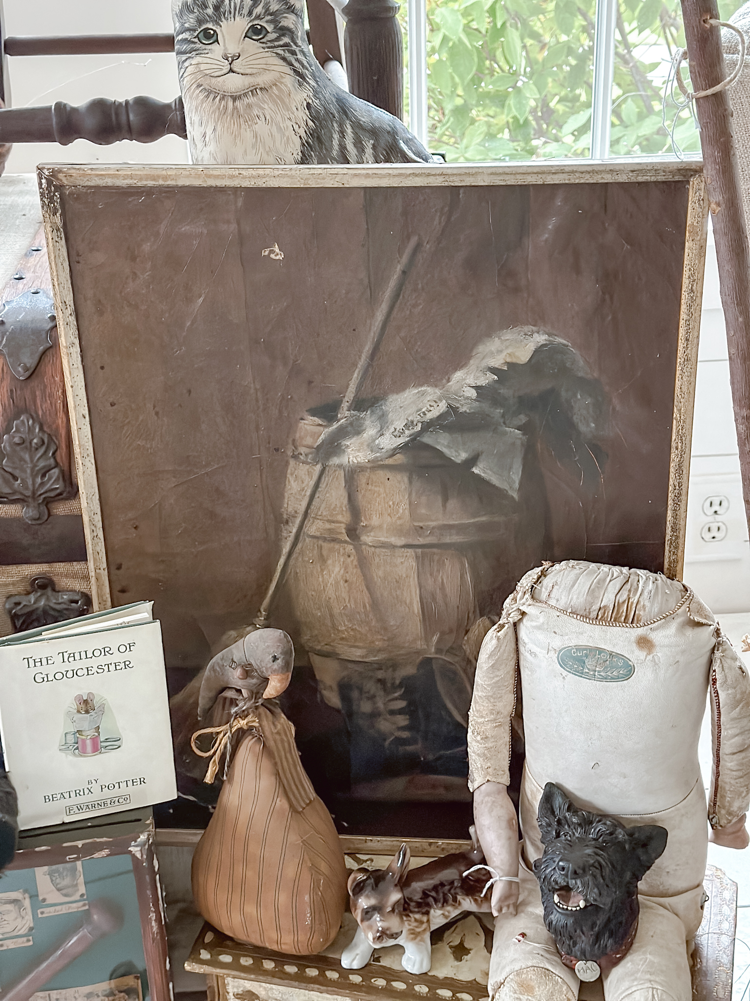 We have some everyday things we are going to weave into our decor and in our home. And also the additions to my dog focused room for copies new big-boy room. Anchoring the entire space is this canvas wrapped trunk. A beautiful find that I have’t really seen before. I have seen a lot of trunks, but this well-preserved trunk wrapped in a canvas was very unique and perfect for some added storage around the home. A few pieces of art to add to my collection and a newer interest in dolls are fun little ways to add a unique flair to a cabinet or room.