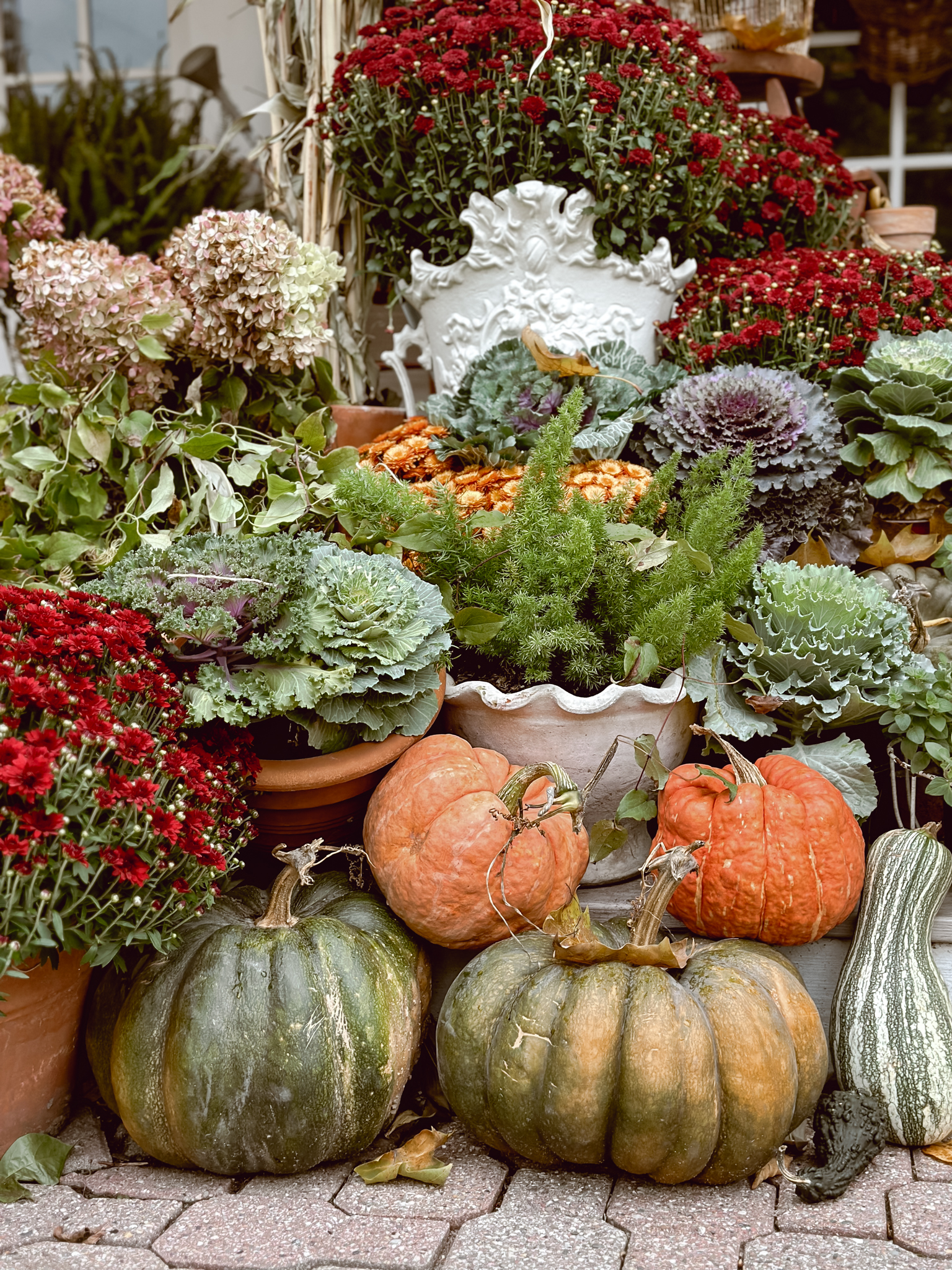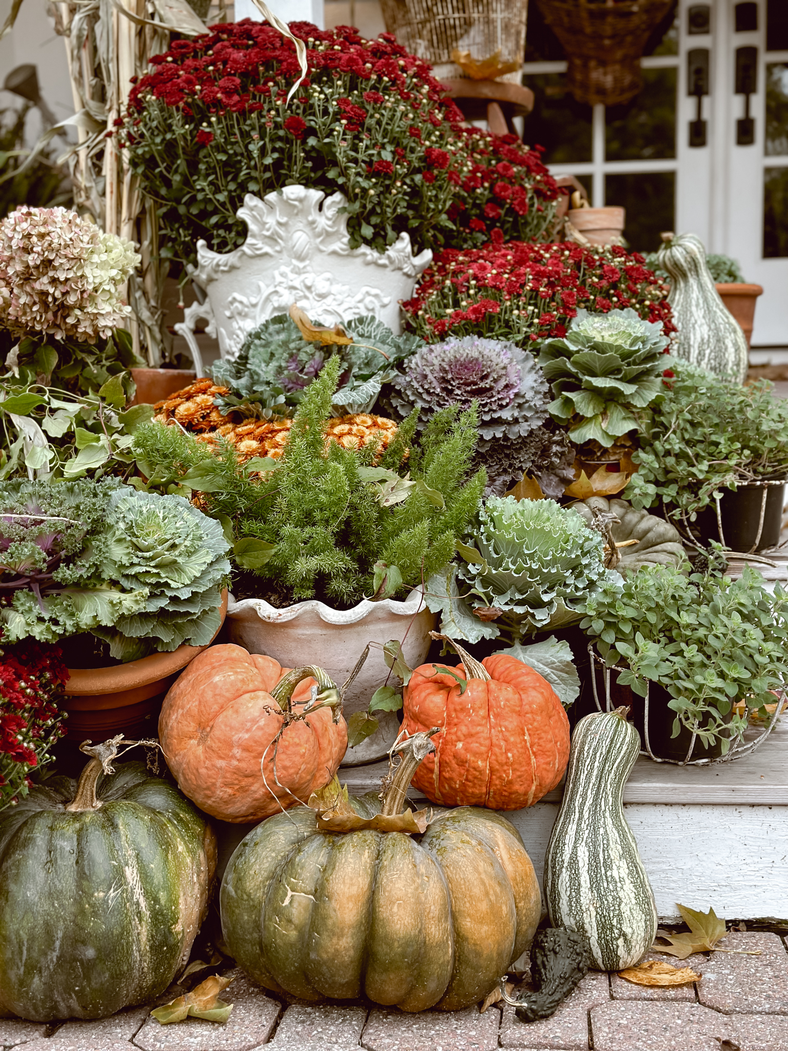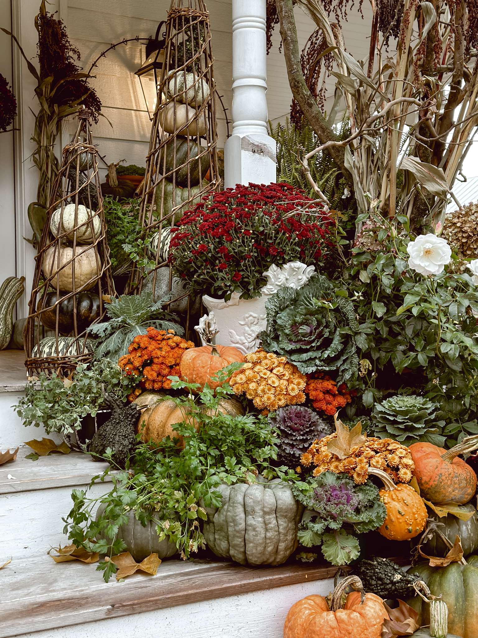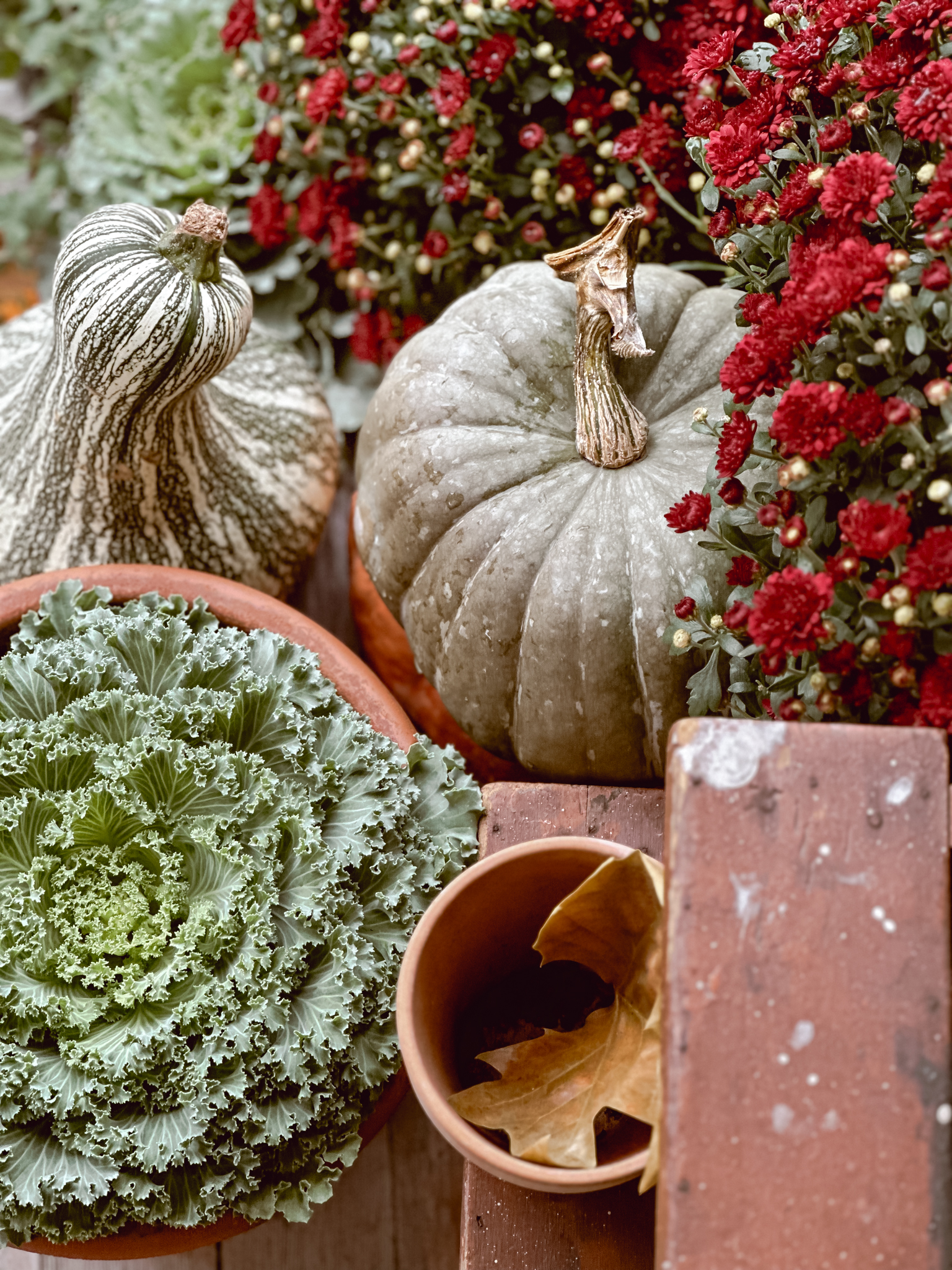 Welcome to my little corner of the countryside. As the leaves begin to change and the air takes on a hint of chill, I find myself drawn time and time again to the steps outside my front door. It’s here where I’ve created a harvest sanctuary, a pops of autumnal color and texture to greet each new day.Mums in shades of yellow and orange spill cheerfully over the edges of planters, their petals just begging for curious fingers to brush against. Kale plants stand at attention, their crinkly leaves waving in the breeze and promising a world of soups and salads to come. Round pumpkins nestle amongst them, waiting patiently to be carved into smiling jack-o-lanterns. Elsewhere, sprigs of parsley and gourds of all shapes add their own natural touches to the display.