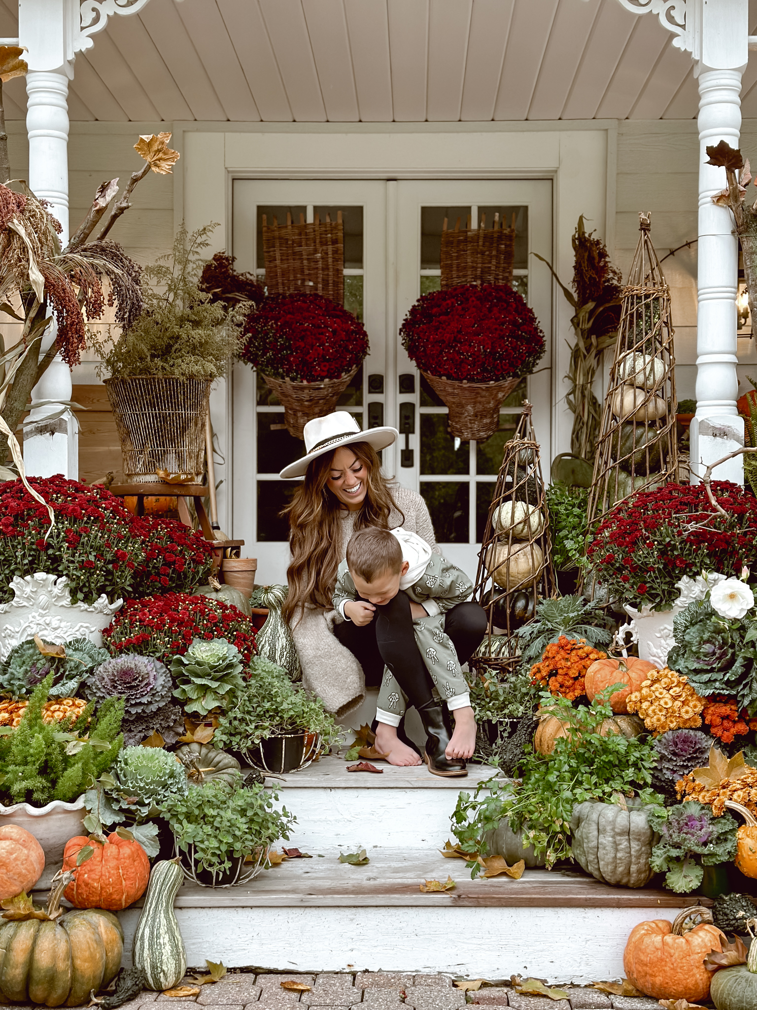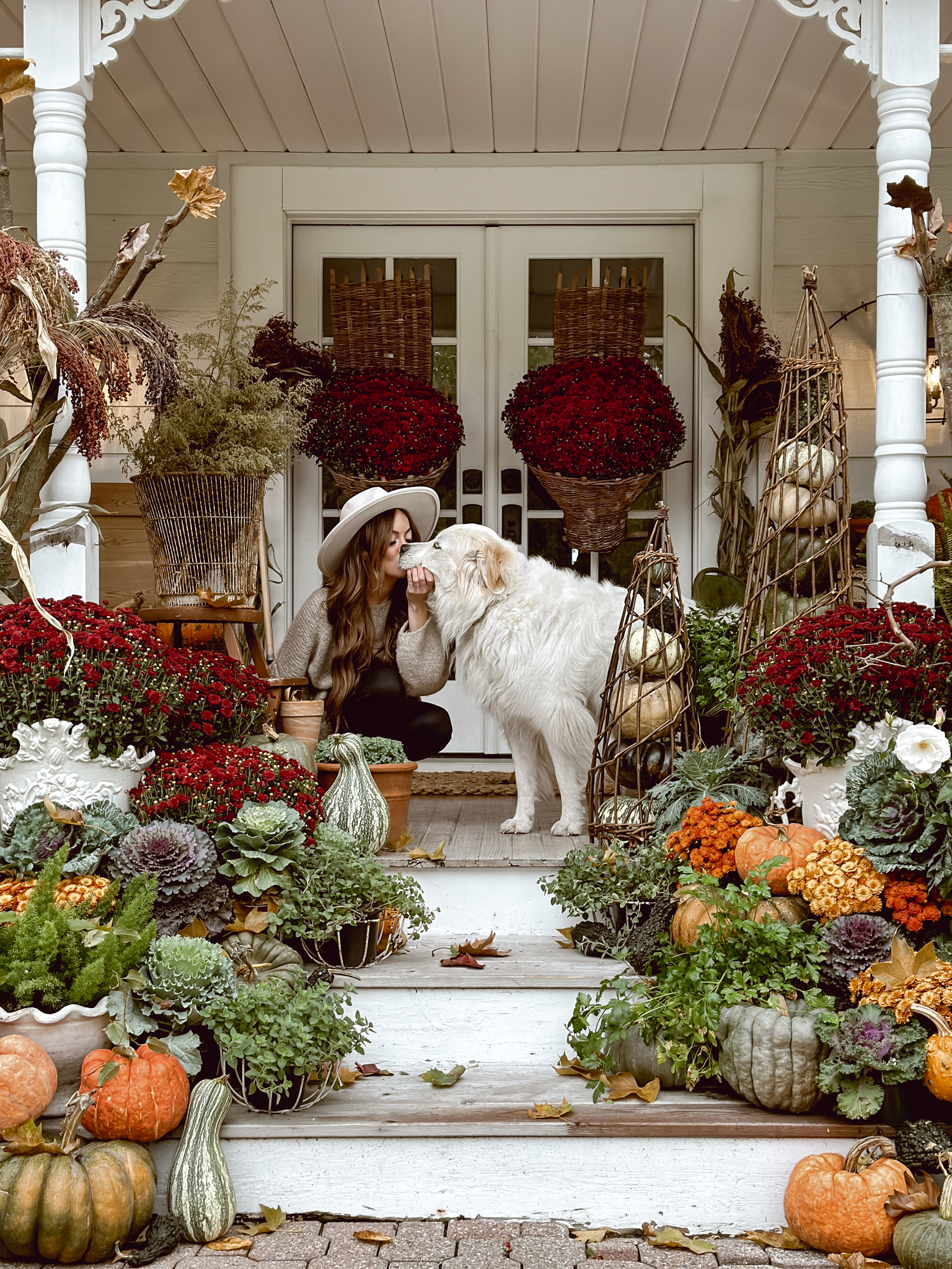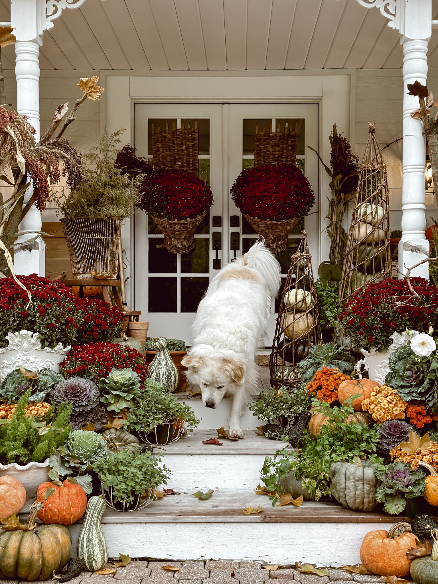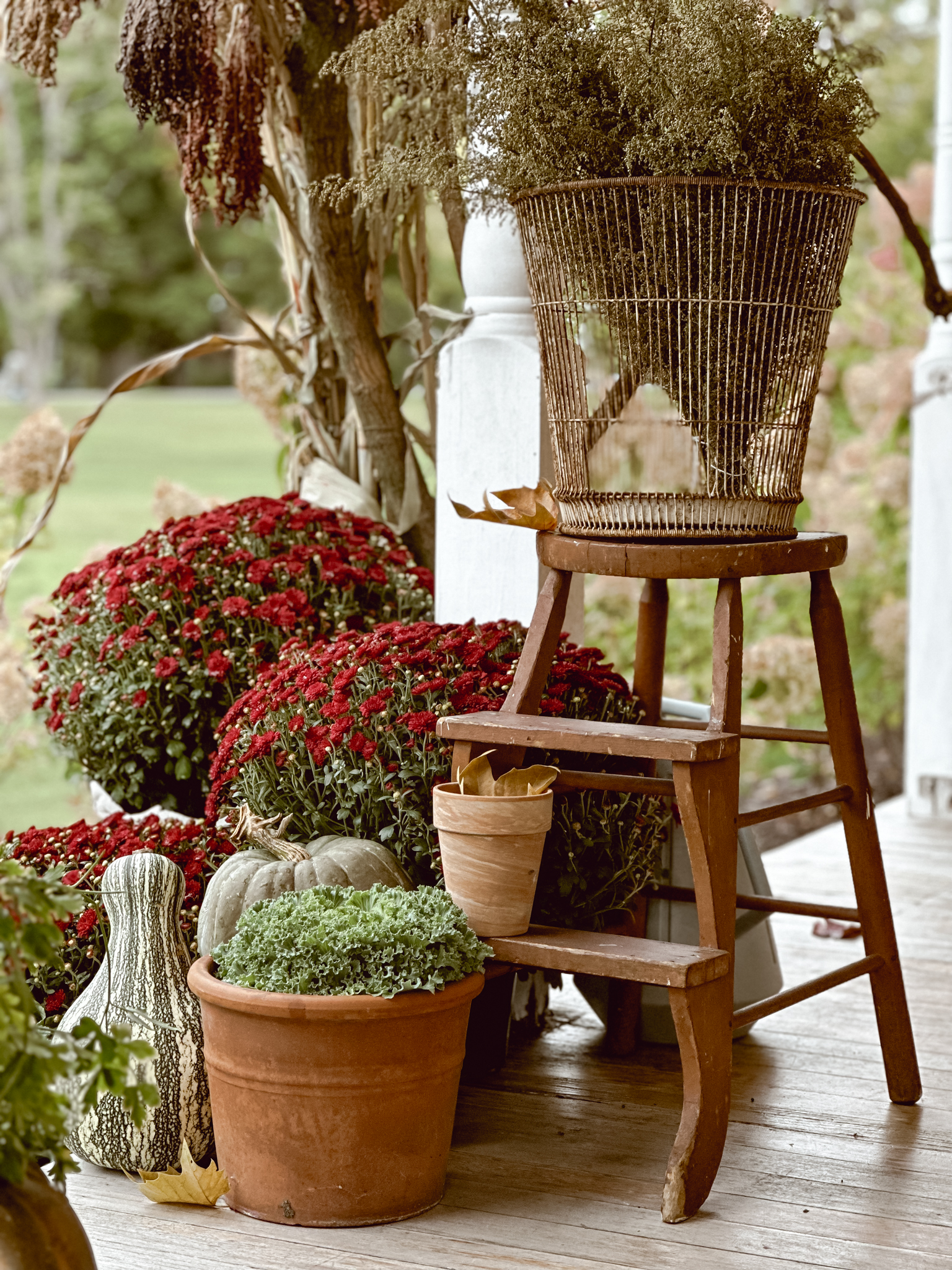 Welcome to my little corner of the countryside. As the leaves begin to change and the air takes on a hint of chill, I find myself drawn time and time again to the steps outside my front door. It’s here where I’ve created a harvest sanctuary, a pops of autumnal color and texture to greet each new day.Mums in shades of yellow and orange spill cheerfully over the edges of planters, their petals just begging for curious fingers to brush against. Kale plants stand at attention, their crinkly leaves waving in the breeze and promising a world of soups and salads to come. Round pumpkins nestle amongst them, waiting patiently to be carved into smiling jack-o-lanterns. Elsewhere, sprigs of parsley and gourds of all shapes add their own natural touches to the display.