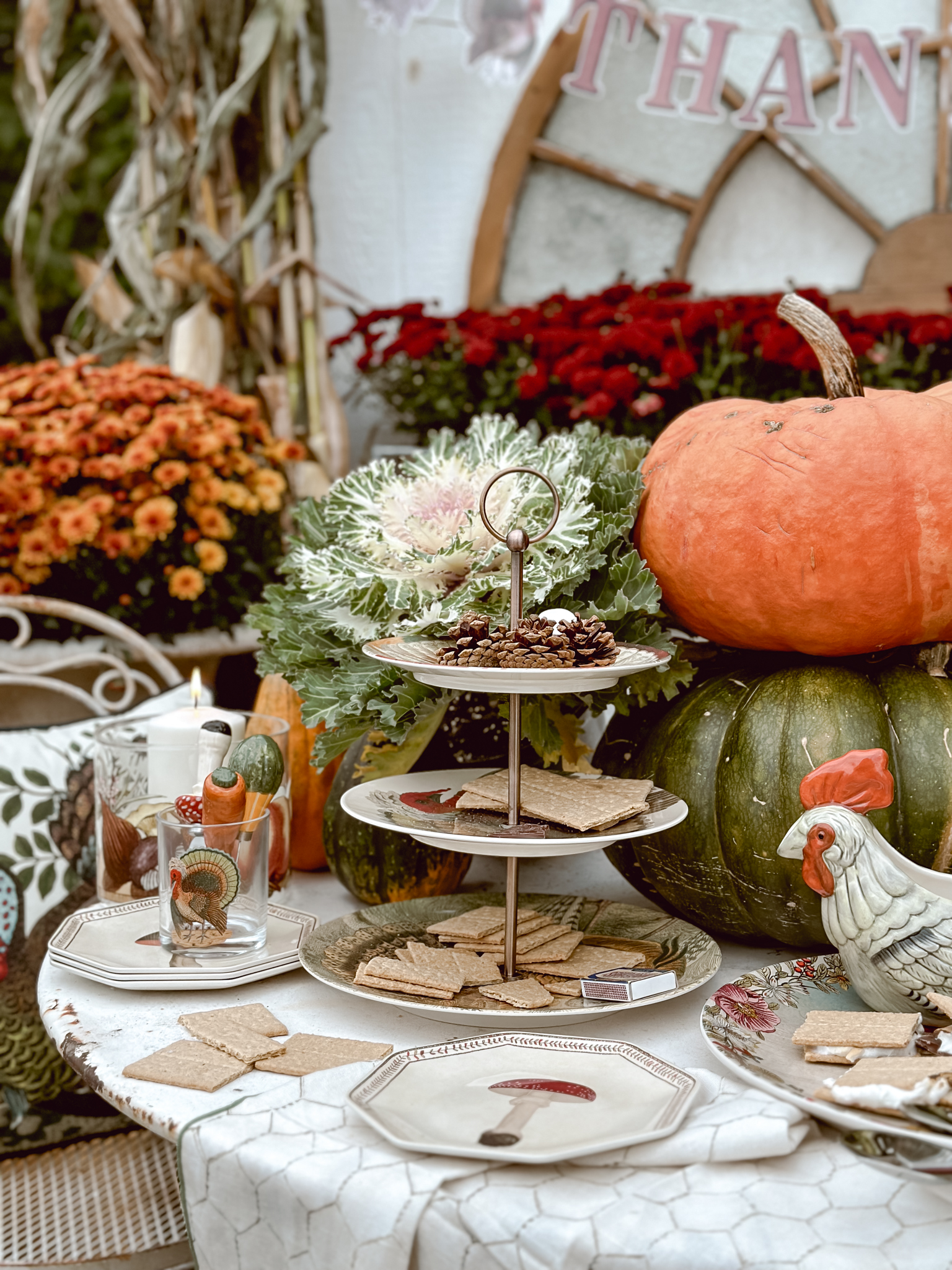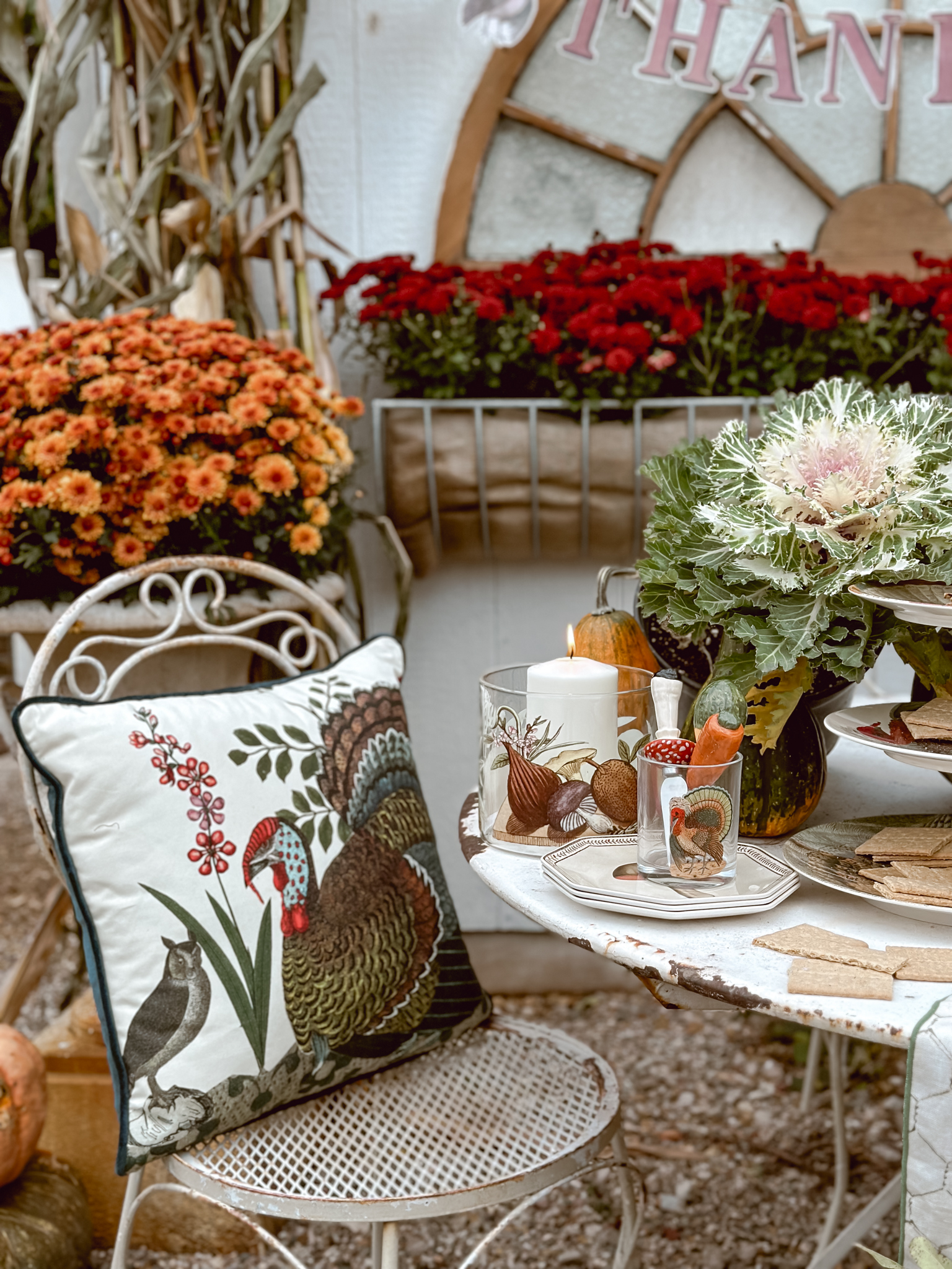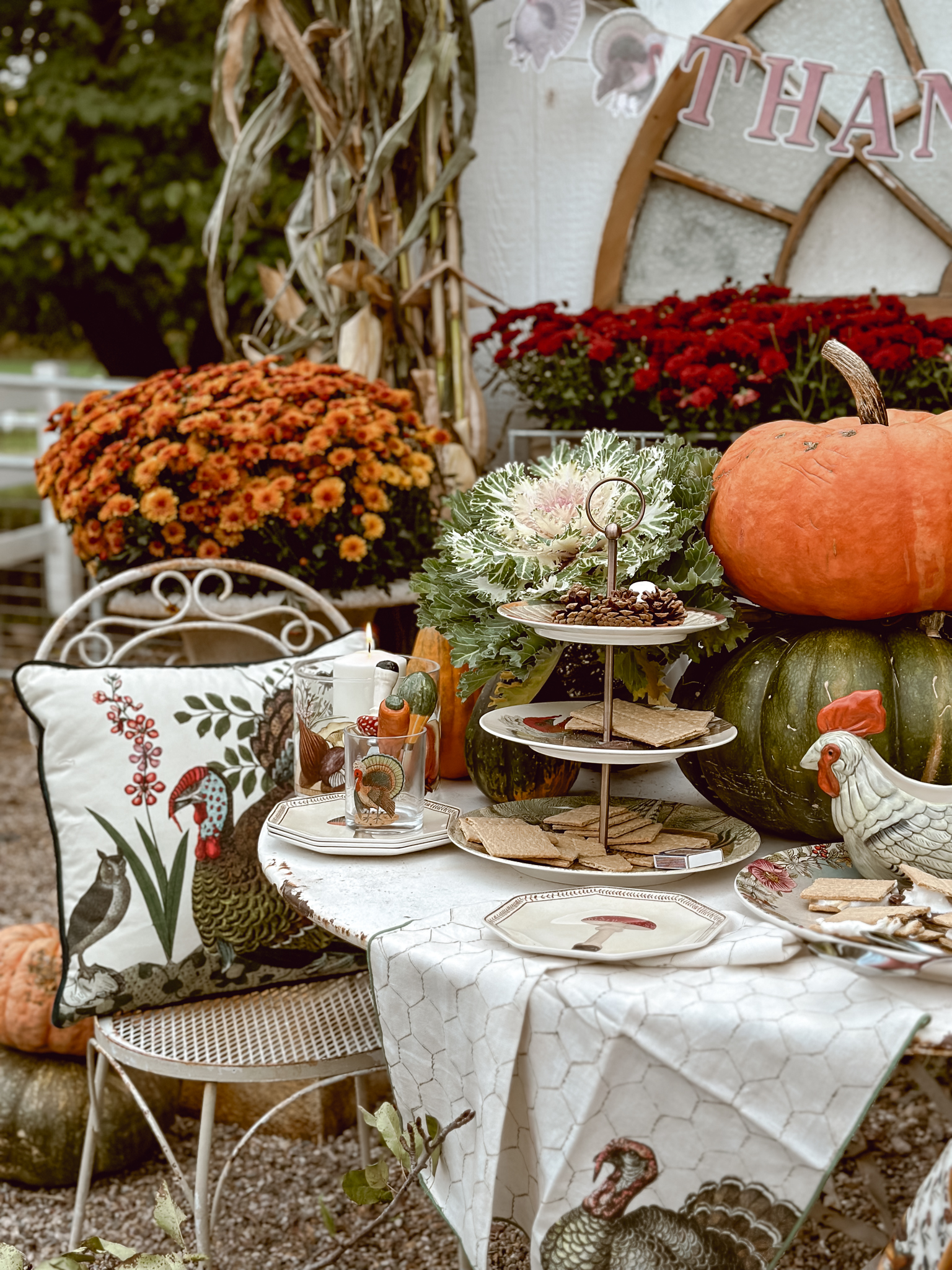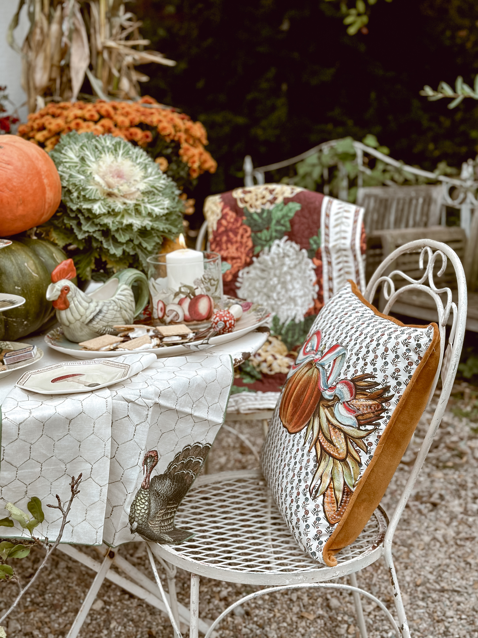 As the season’s first chill fills the air, I find myself itching to create cozy corners that celebrate all things autumn. There’s nothing more welcoming than a rustic tablescape surrounded by pumpkins and mums, and that’s exactly what inspired my latest outdoor oasis. With the new John Derian Thanksgiving Collection now available at Target, I couldn’t resist the opportunity to mix these vintage-inspired pieces among an abundance of natural elements. A stack of pumpkins & cabbage, bundled corn stalks and arrangements mums, what more do you need? As much as I’ve been loving putting together all these cozy autumnal displays outside, I can’t help but feel a tug of sadness each time I catch a glimpse at all of the colorful leaves. It’s like Mother Nature’s subtle reminder that the seasons just keep on changing whether we’re ready for them to or not. This year especially, it feels like summer slipped through our fingers before we could squeeze in all those lazy evenings around the fire pit.