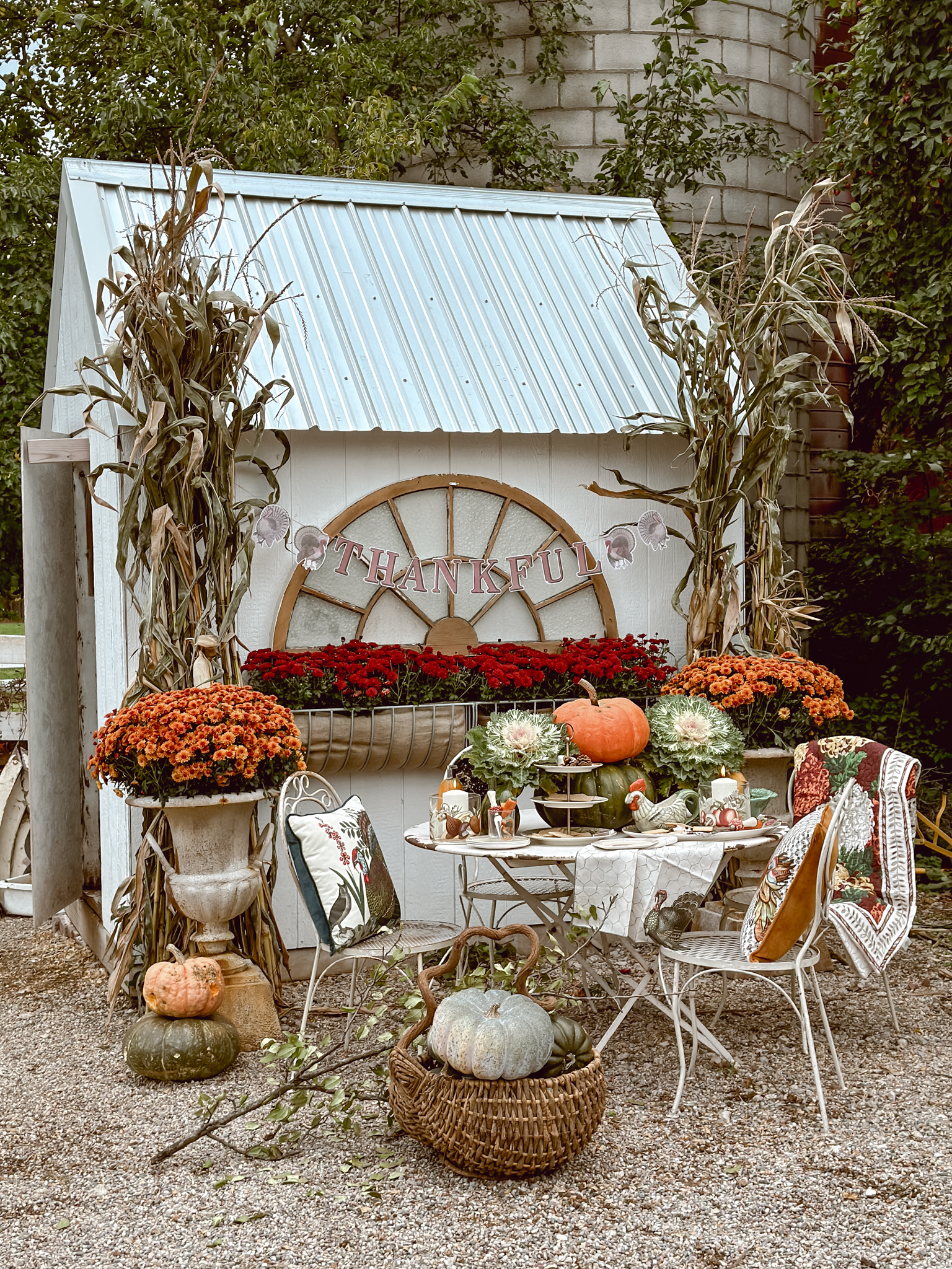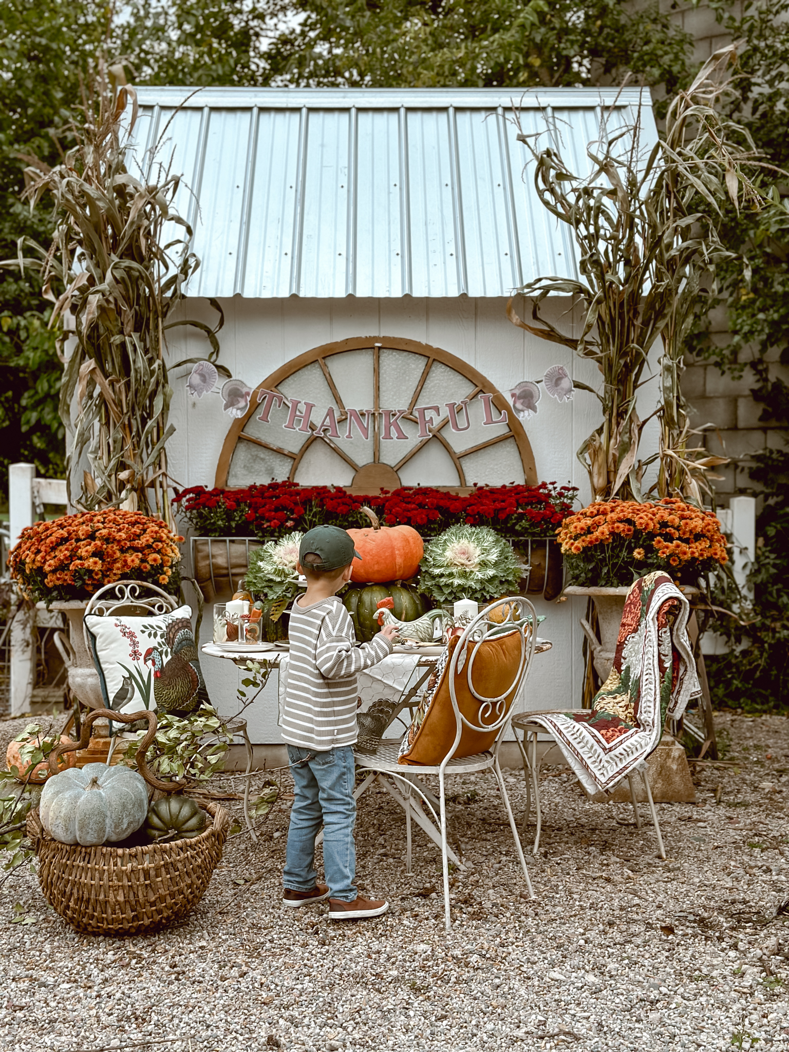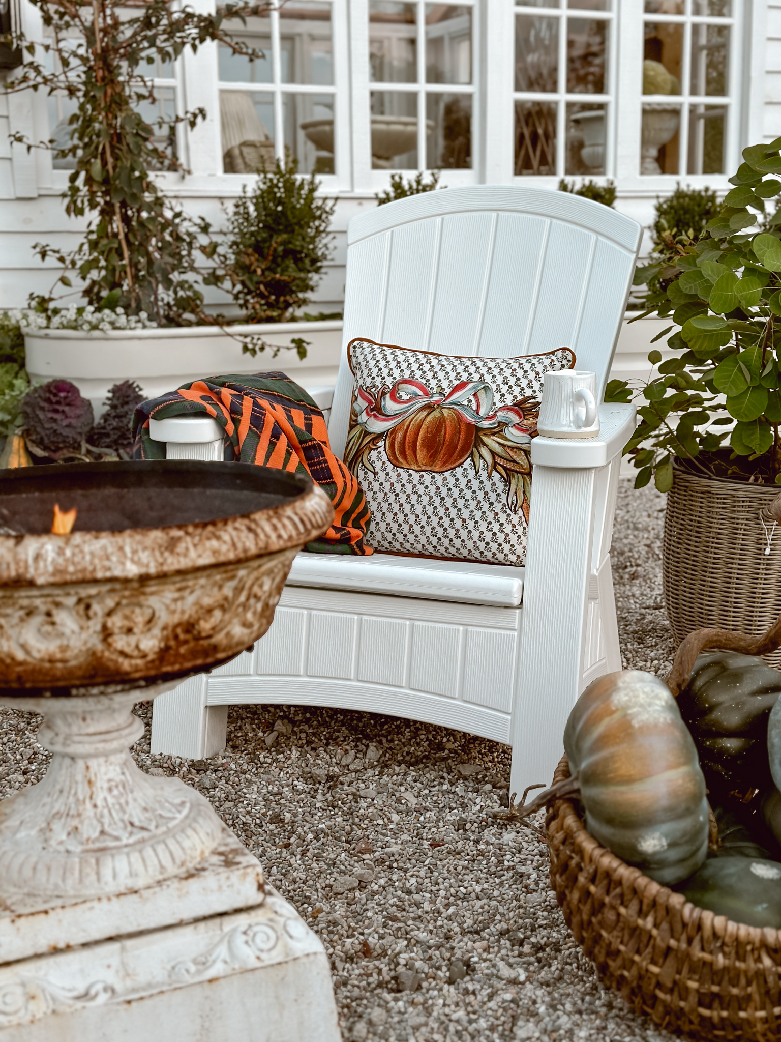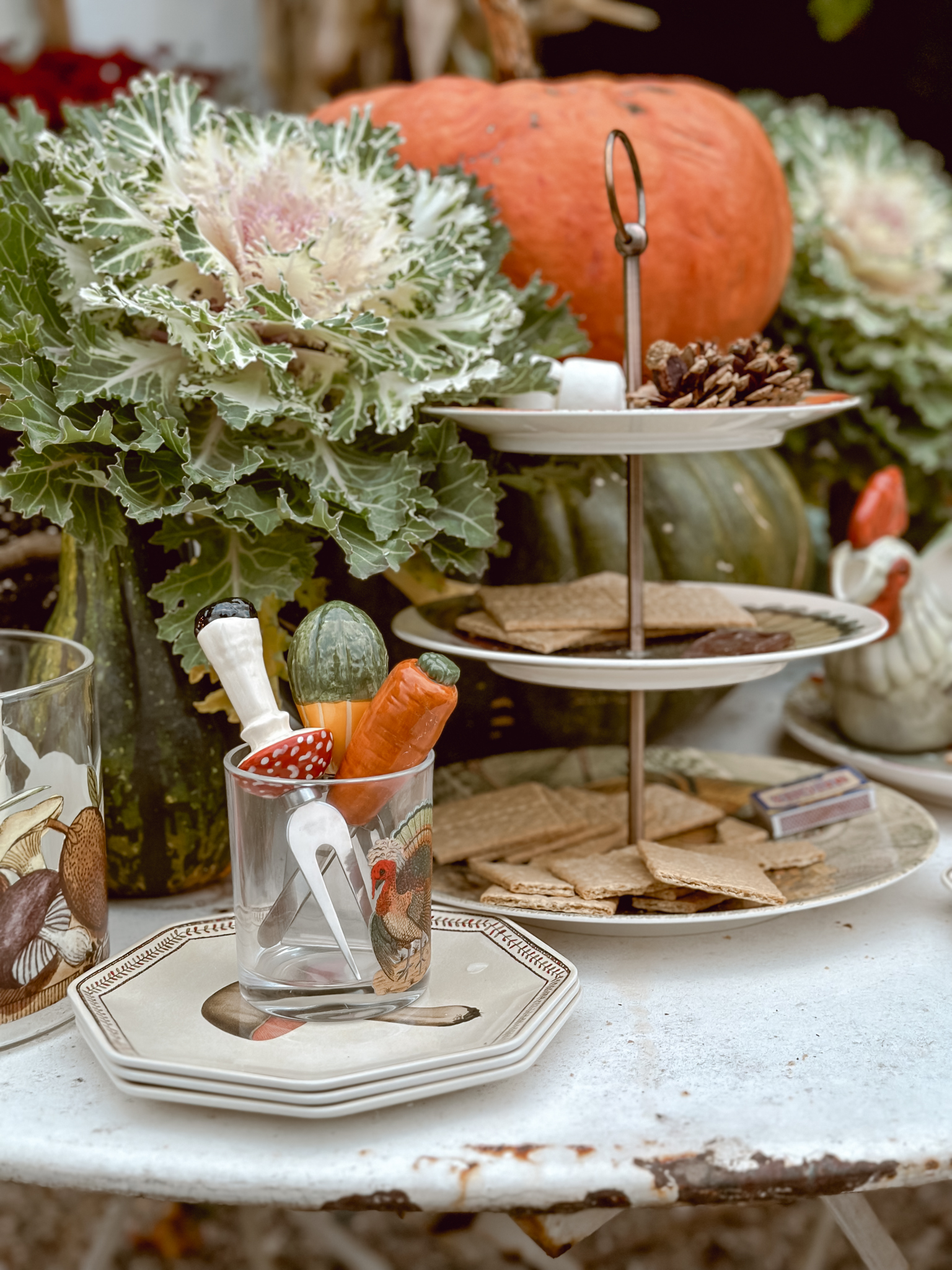 As the season’s first chill fills the air, I find myself itching to create cozy corners that celebrate all things autumn. There’s nothing more welcoming than a rustic tablescape surrounded by pumpkins and mums, and that’s exactly what inspired my latest outdoor oasis. With the new John Derian Thanksgiving Collection now available at Target, I couldn’t resist the opportunity to mix these vintage-inspired pieces among an abundance of natural elements. A stack of pumpkins & cabbage, bundled corn stalks and arrangements mums, what more do you need? As much as I’ve been loving putting together all these cozy autumnal displays outside, I can’t help but feel a tug of sadness each time I catch a glimpse at all of the colorful leaves. It’s like Mother Nature’s subtle reminder that the seasons just keep on changing whether we’re ready for them to or not. This year especially, it feels like summer slipped through our fingers before we could squeeze in all those lazy evenings around the fire pit.